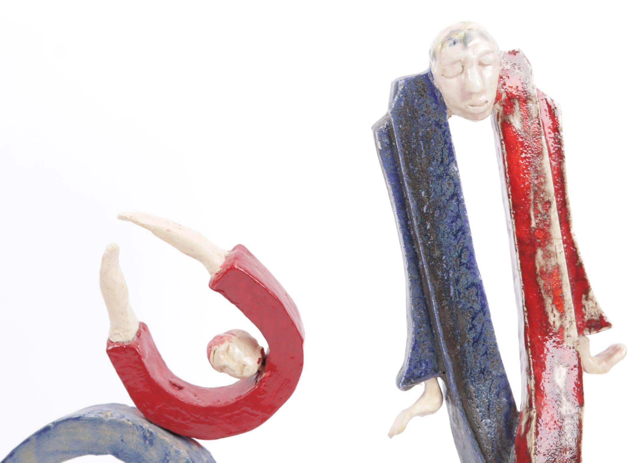 2 Geglazuurde keramiek sculpturen rustend op houten voetstukje, h.34 cm. en h.26 cm.