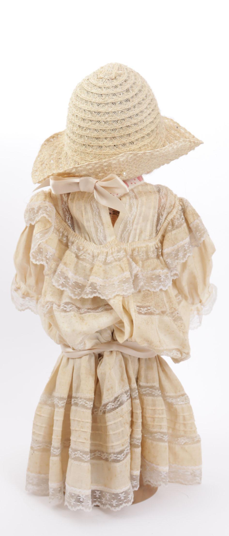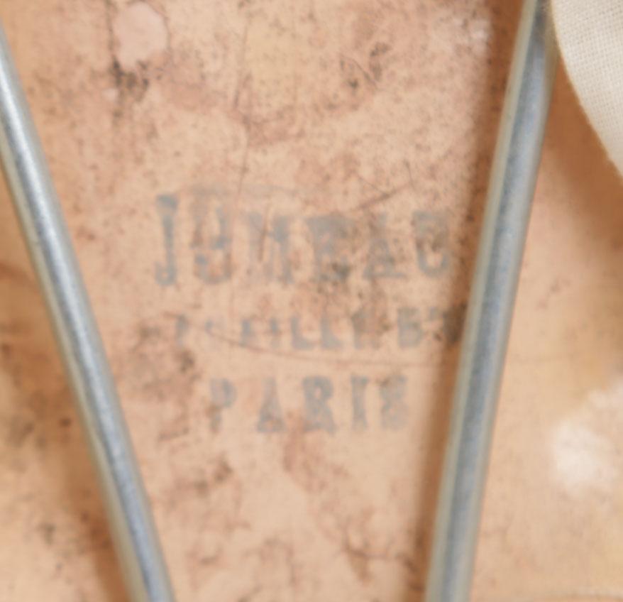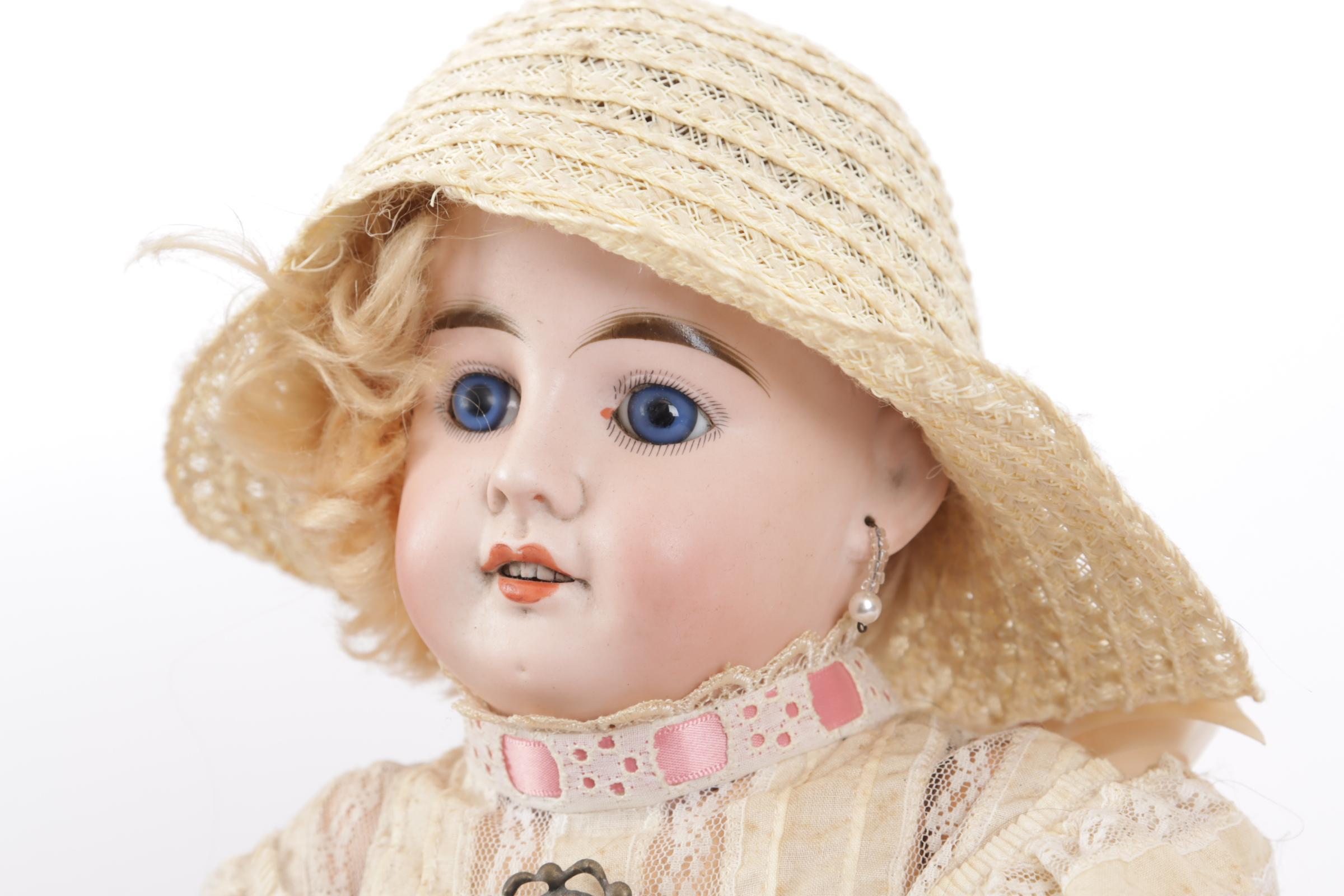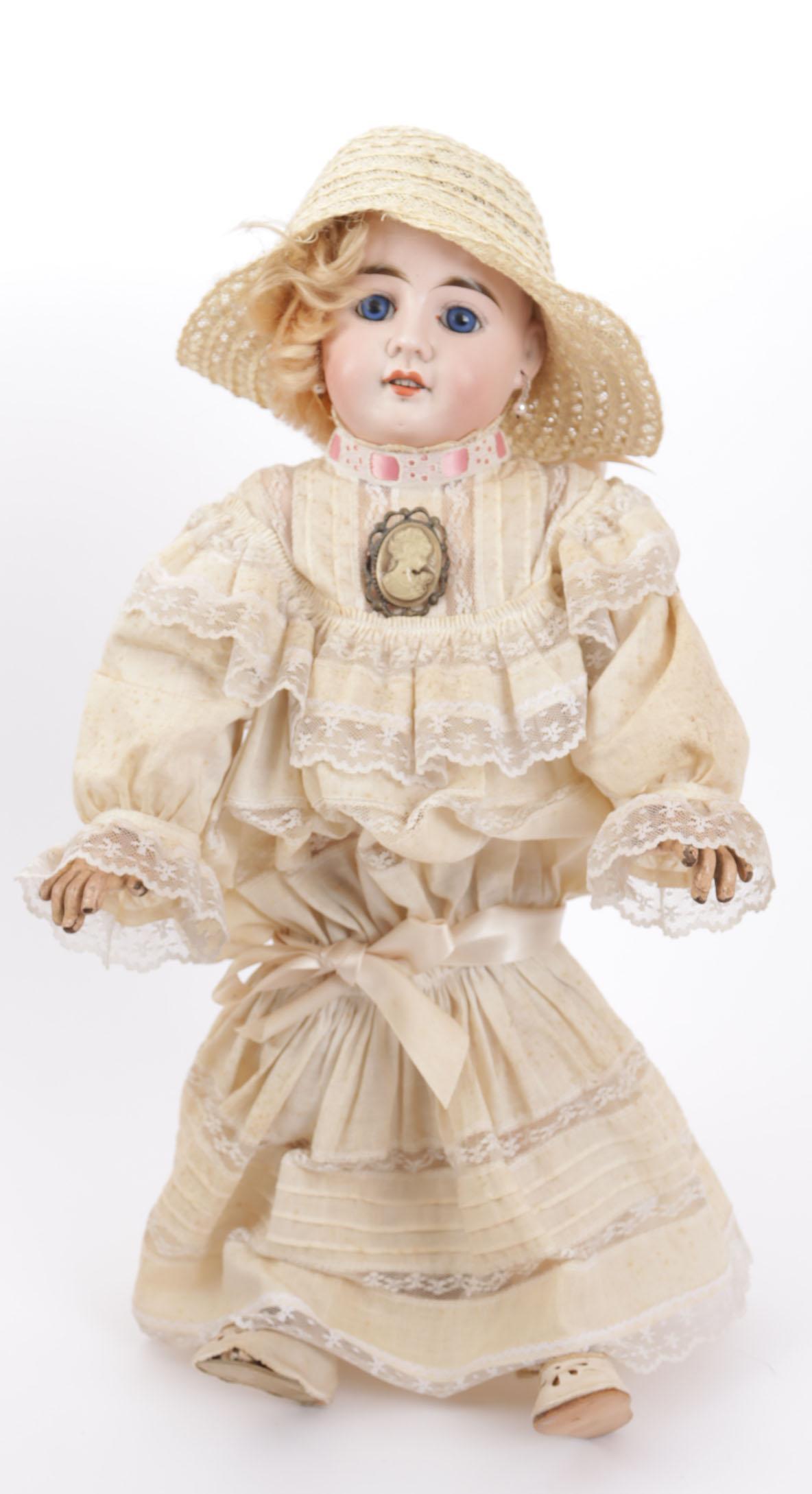 Antieke Franse pop met porseleinen hoofd, gemerkt Jumeau Paris, blauwe stempel hoofd gemerkt met 5 Bébe Jumeau (kleine beschadiging achterzijde hoofd)