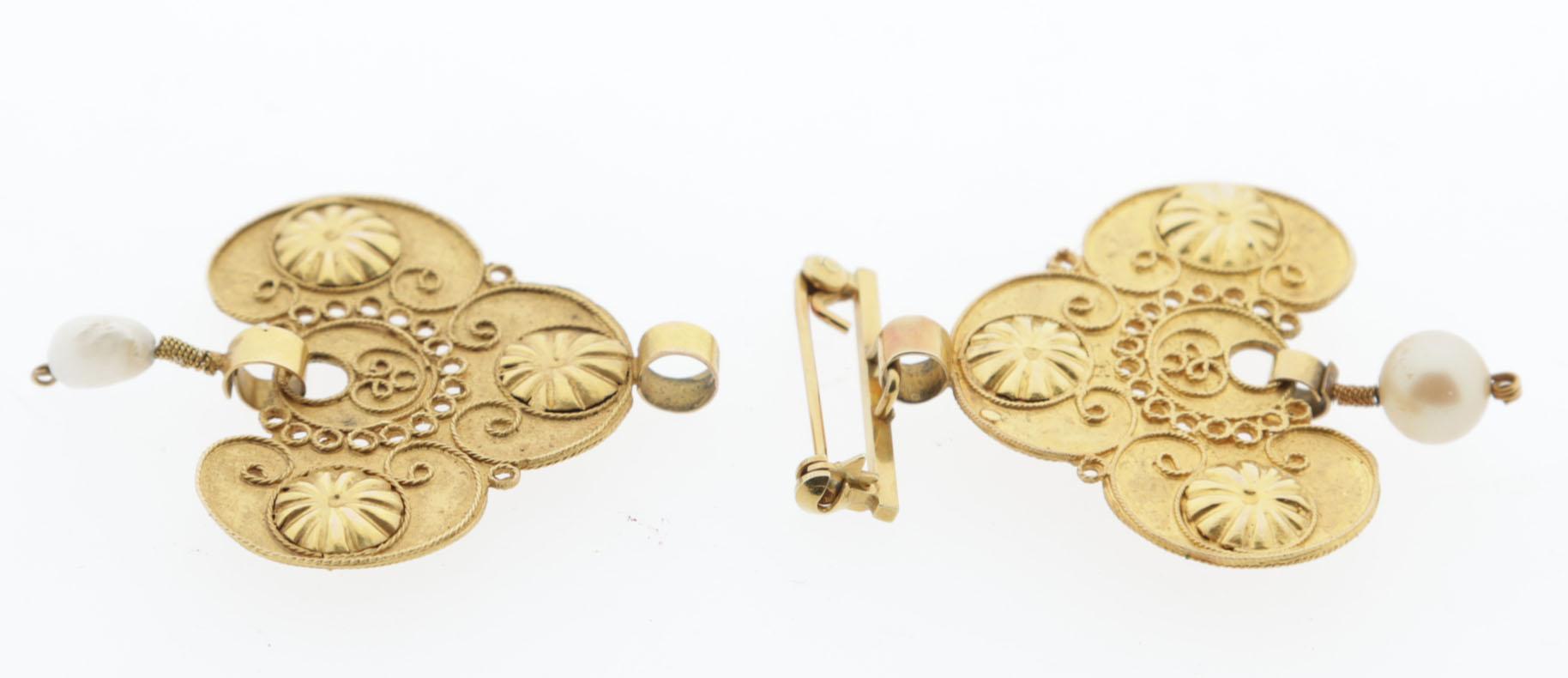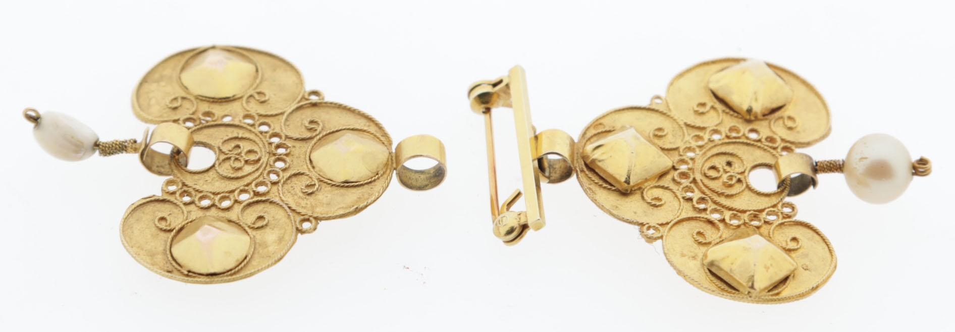 14 Kt. gouden speldbroche en hanger bezet met pareltjes, 12,2 gram