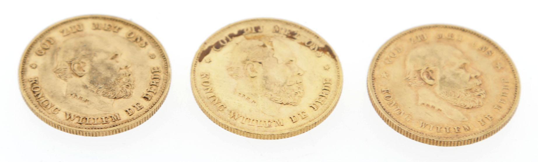 3 Fijn gouden tiengulden muntstukken Willem III, 1875, 1876 en 1875