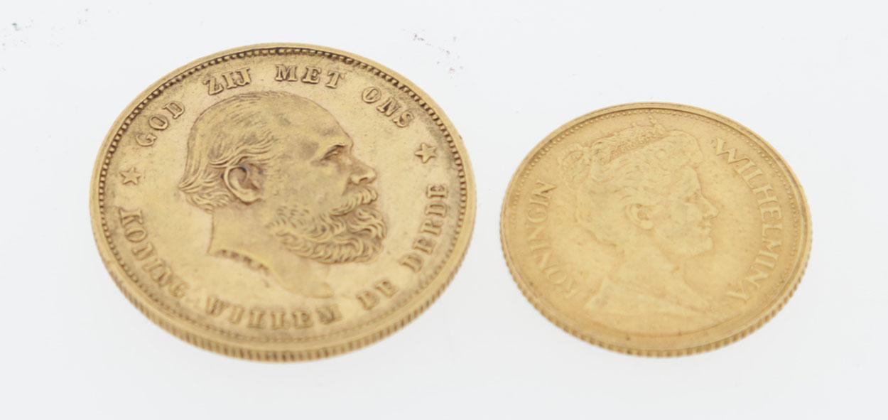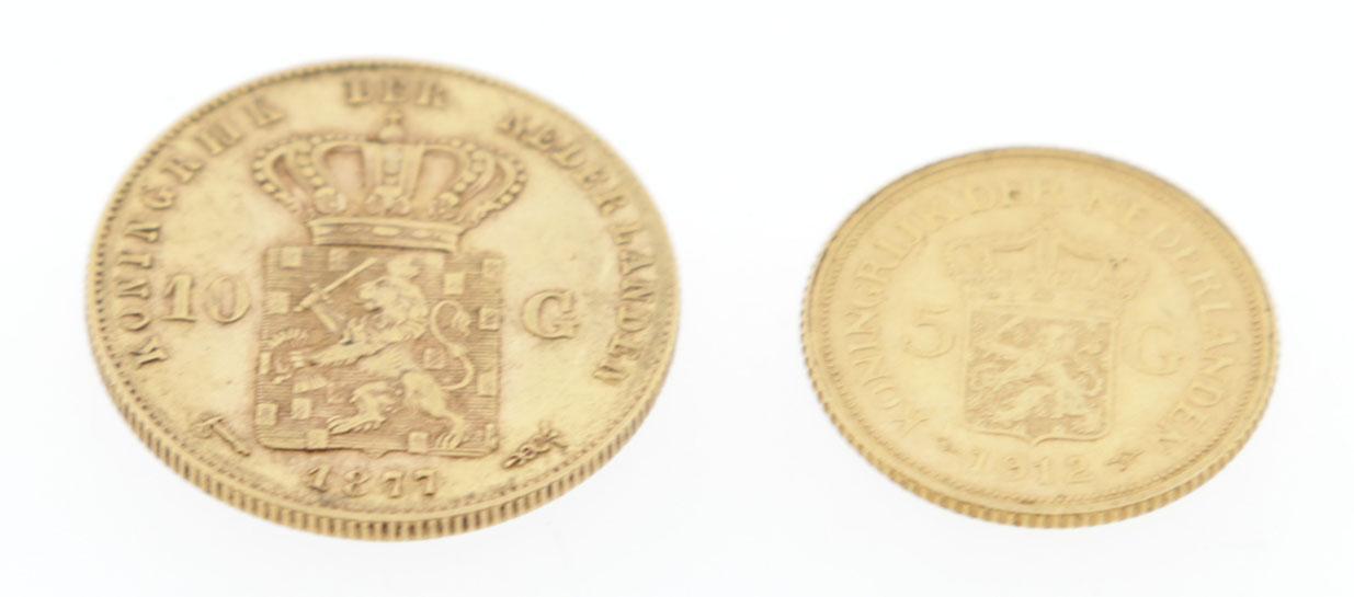 Gouden tiengulden muntstuk, Willem III, 1877 en gouden vijfgulden muntstuk, Wilhelmina, 1912