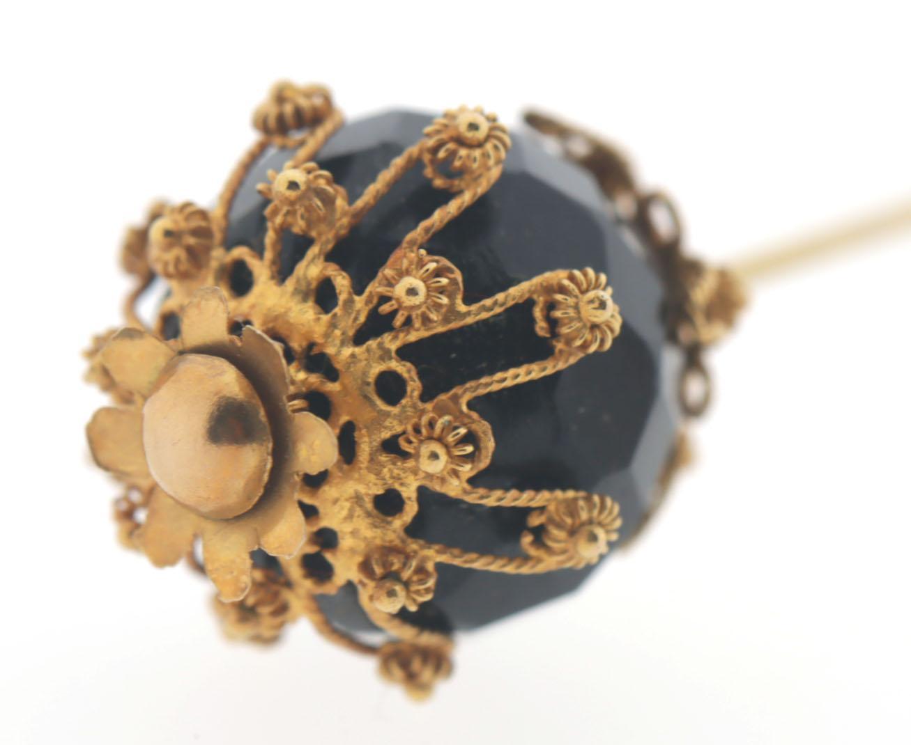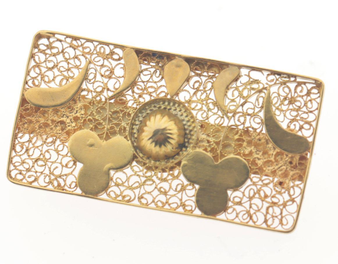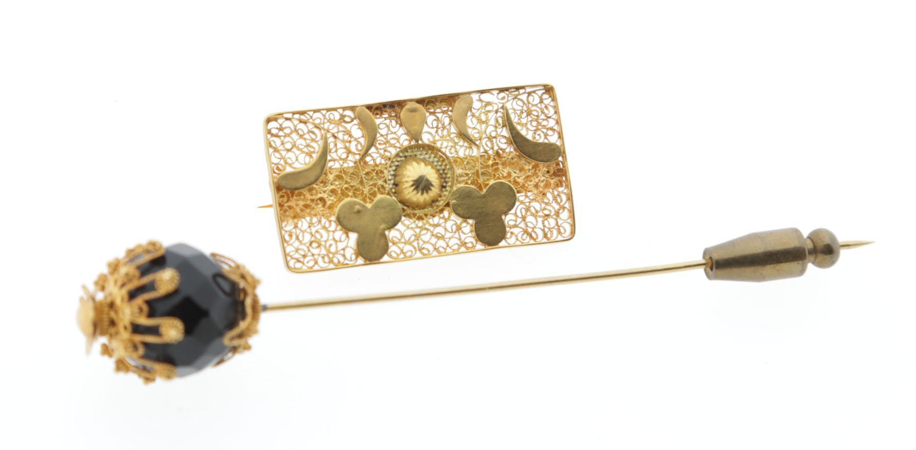 Gouden filigrain broche, 3,5 gram en een kraal bezet met gouden monturen