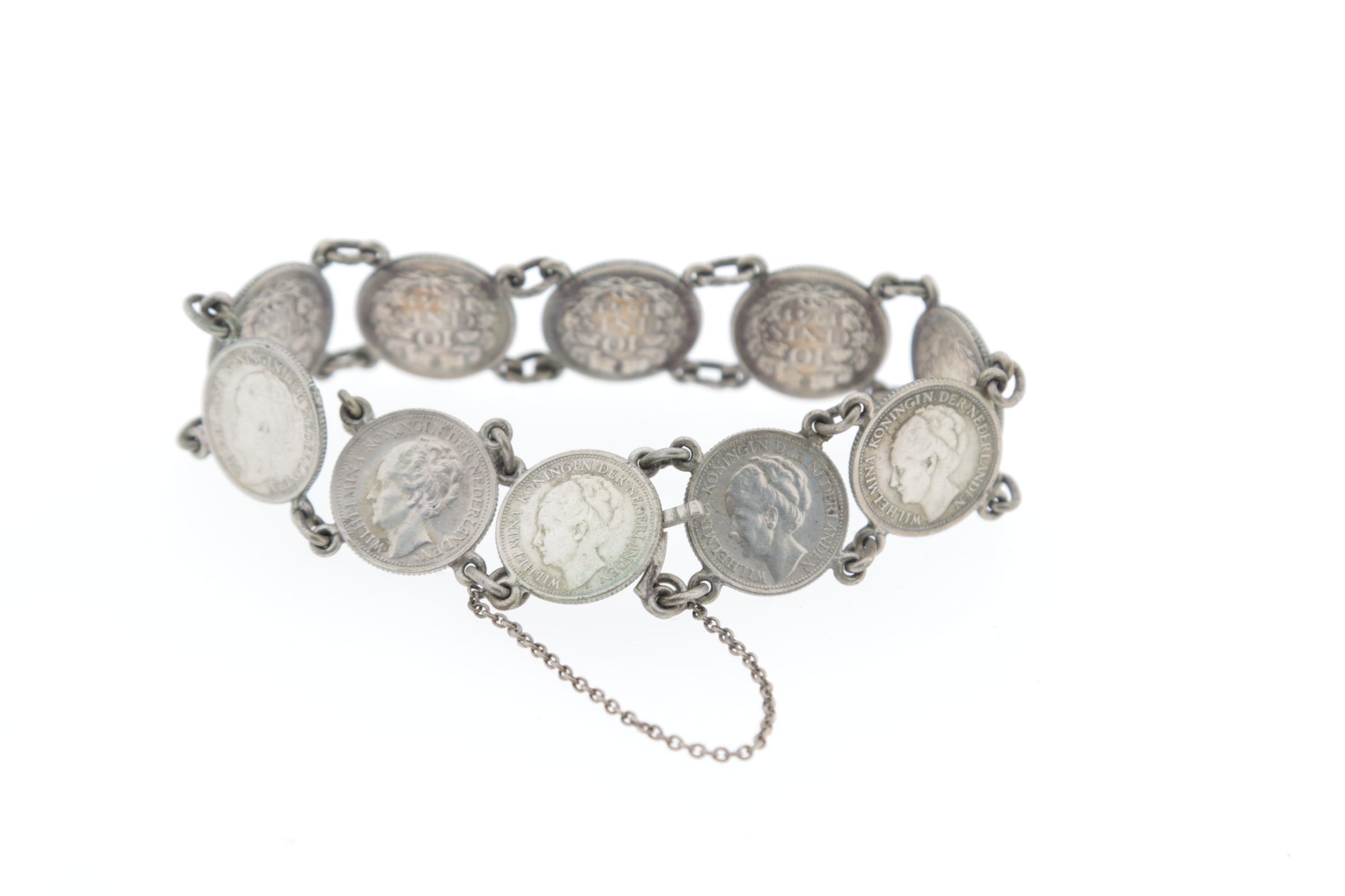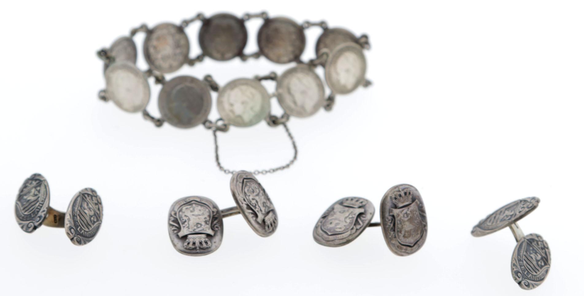 Zilveren dubbeltjes armband en twee paar zilveren manchetknopen, 45,8 gram
