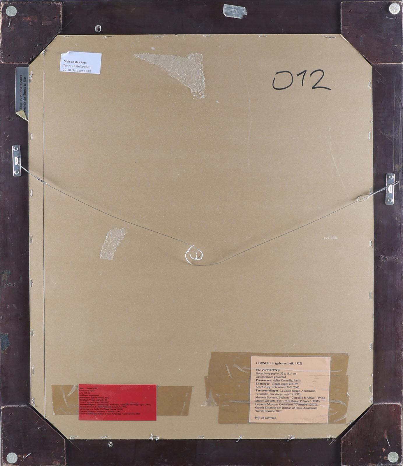 'Corneille' alias van Cornelis Guillaume van Beverloo (1922- 2010), Portret (1947), gouache op papier, gesigneerd en gedateerd, 32 x 18,5 cm. Provenance: collectie kunsthandel Elisabeth den Bieman de Haas, rechtsreeks verworven bij de kunstenaar in Parijs. Literatuur: "Vroege vogel", afb. 89; Art-nl 2e jrg. nr.6, winter 2001/2002. Tentoonstellingen: Le Salon Rouge, Amsterdam, "Corneille, een vroege vogel" (1997); Museum Bochum, Bochum, "Corneille & Afrika" (1998); Maison des Arts, Tunis, "Un Oiseau Précoce" (1998); Gorcums Museum, Gorinchem, "Corneille" (2001); Galerie Elisabeth den Bieman de Haas, Amsterdam "Kerst expositie" (2002)