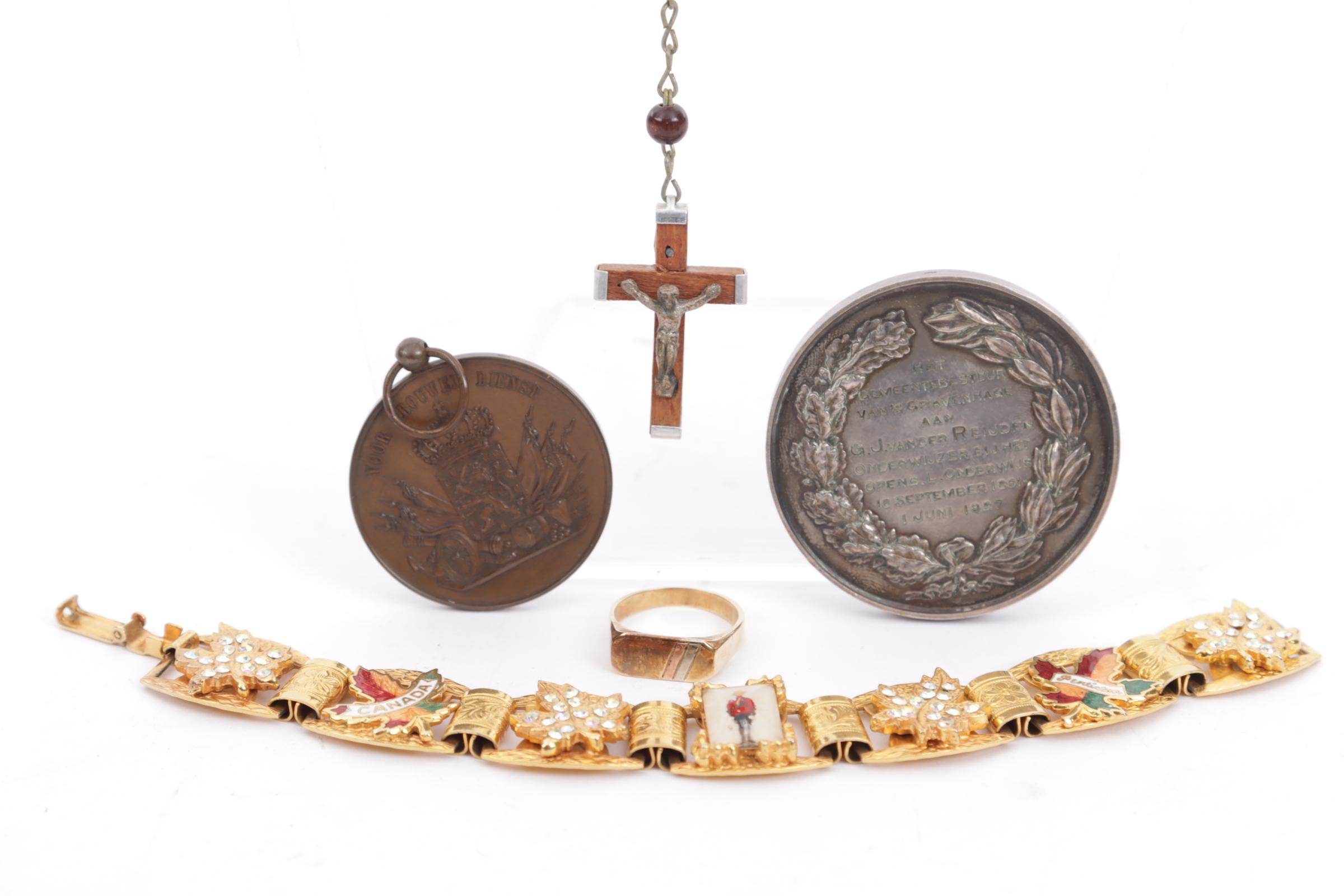 Koopje van een doublé Canadese armband, ring, rozenkrans en 2 medailles