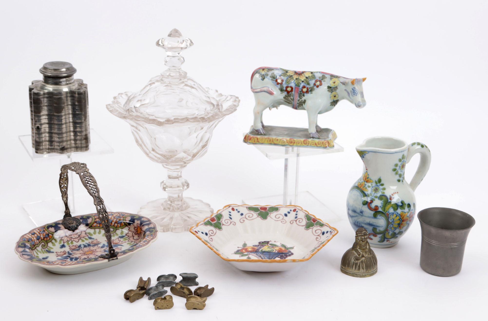 Koopje divers kleingoed w.o. kristallen bokaal, divers Makkum aardewerk, opiumgewichtjes, tinnen theeflacon en een Delfts koetje