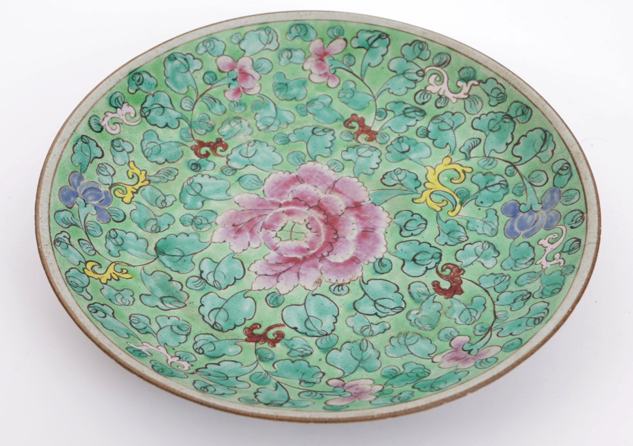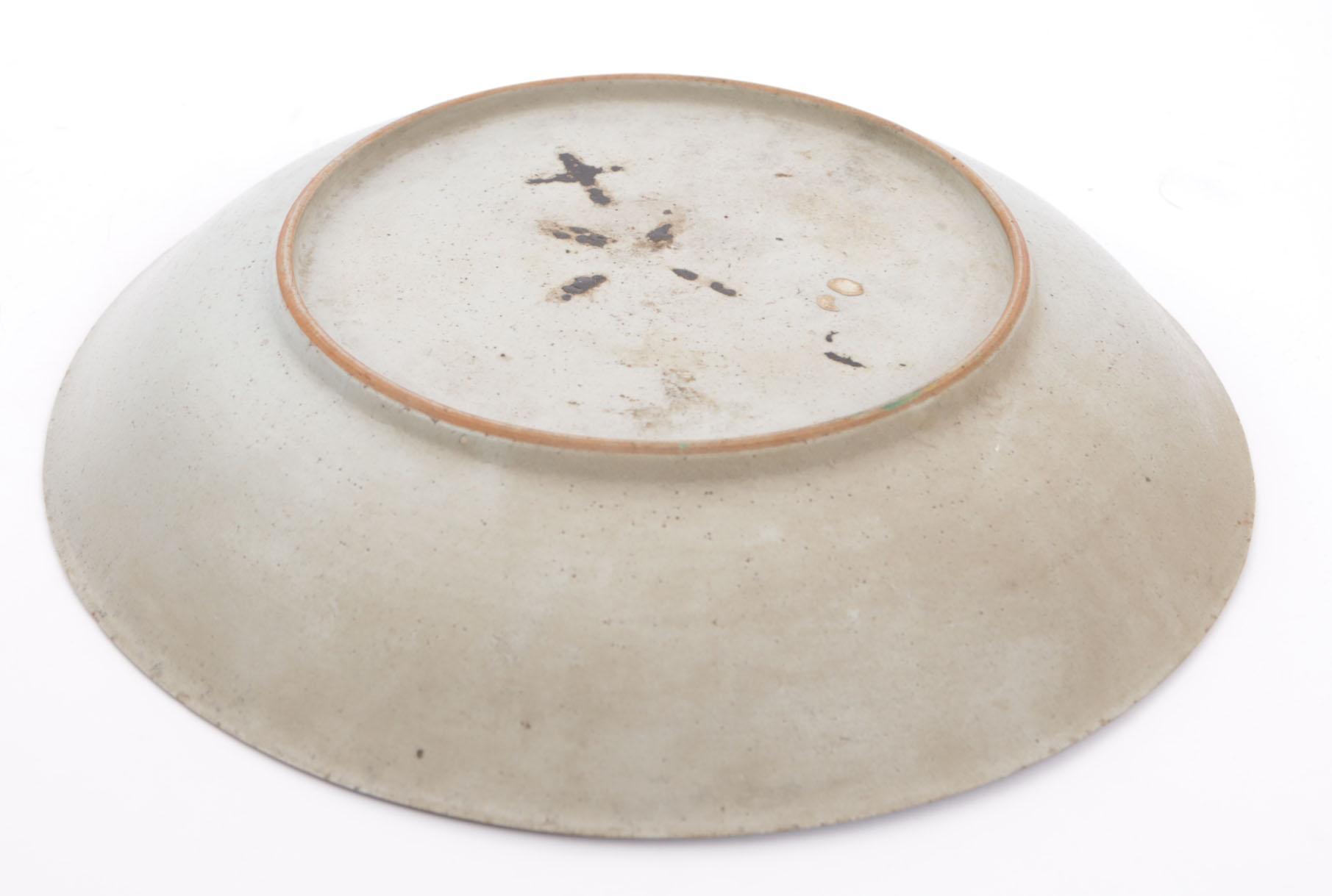 Met bloemen gedecoreerde aardewerken schotel, diam.32 cm.