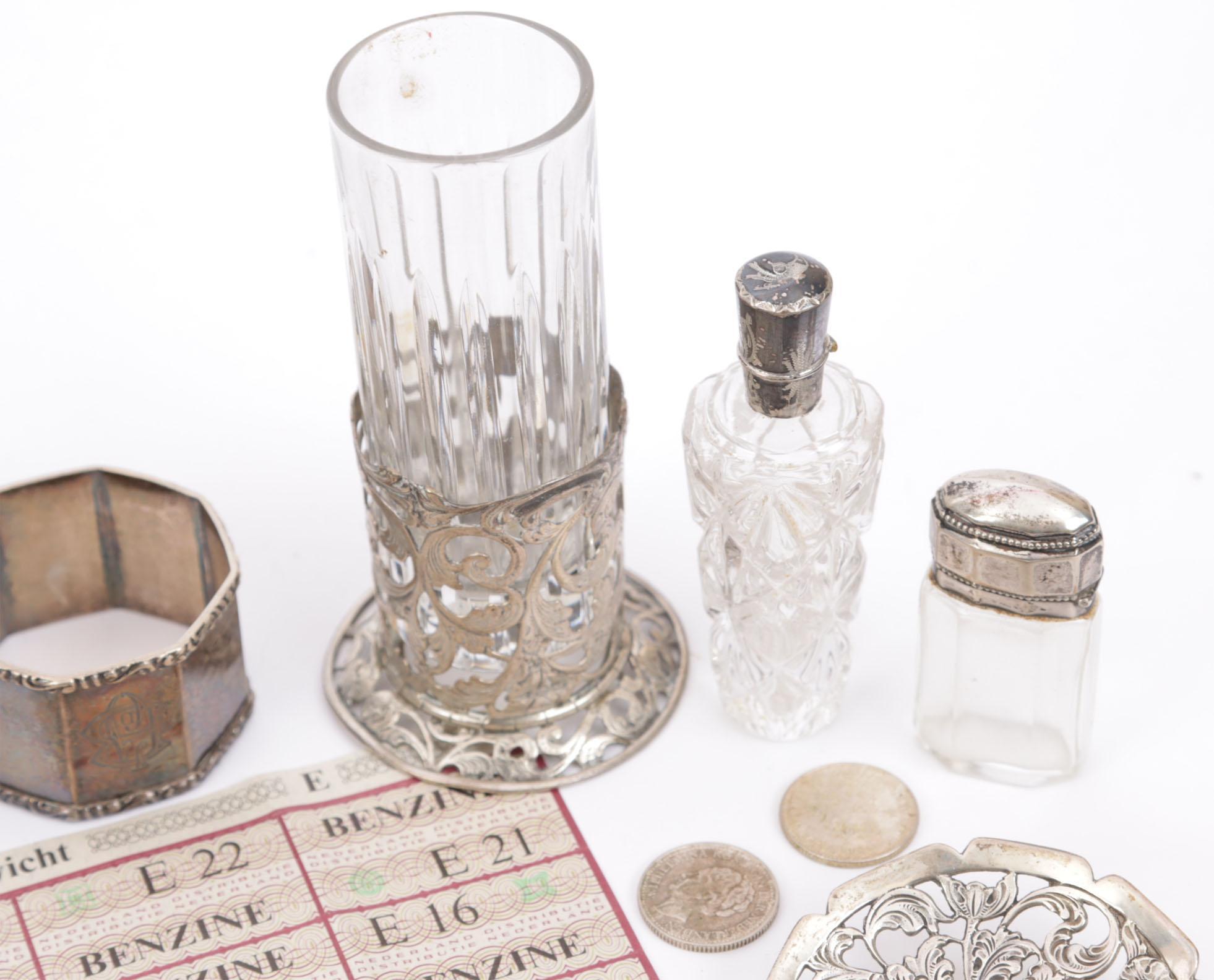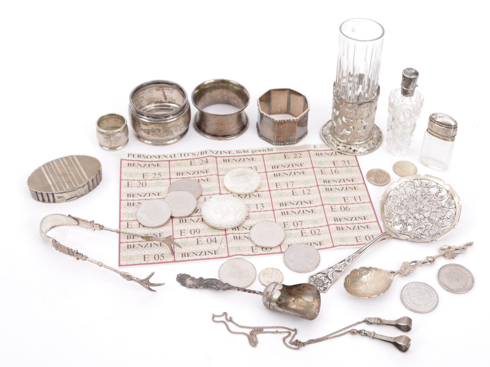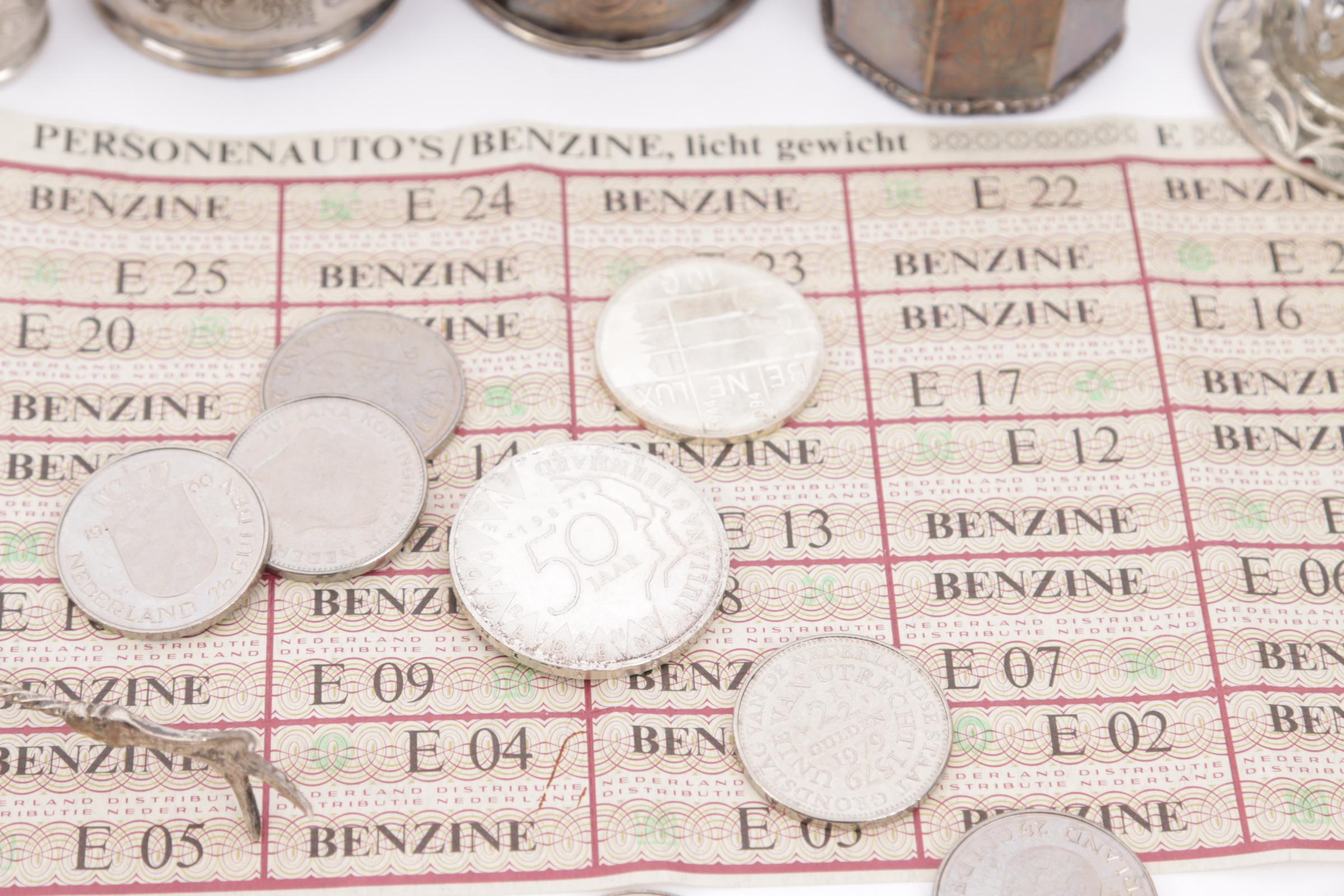 Koopje divers klein zilverwerk, diverse benzinebonnen en muntgeld w.o. 50 gulden muntstuk en een 10 gulden muntstuk