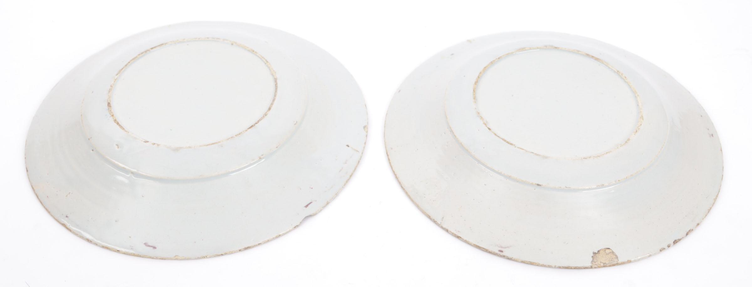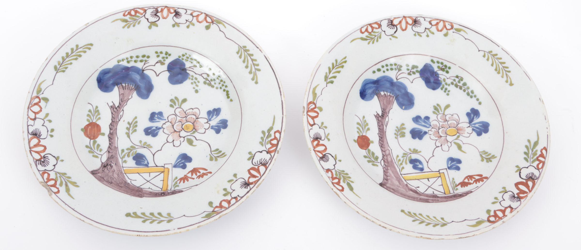 Stel gepolychromeerde Delfts aardewerken borden (randschilvers), diam.23 cm.