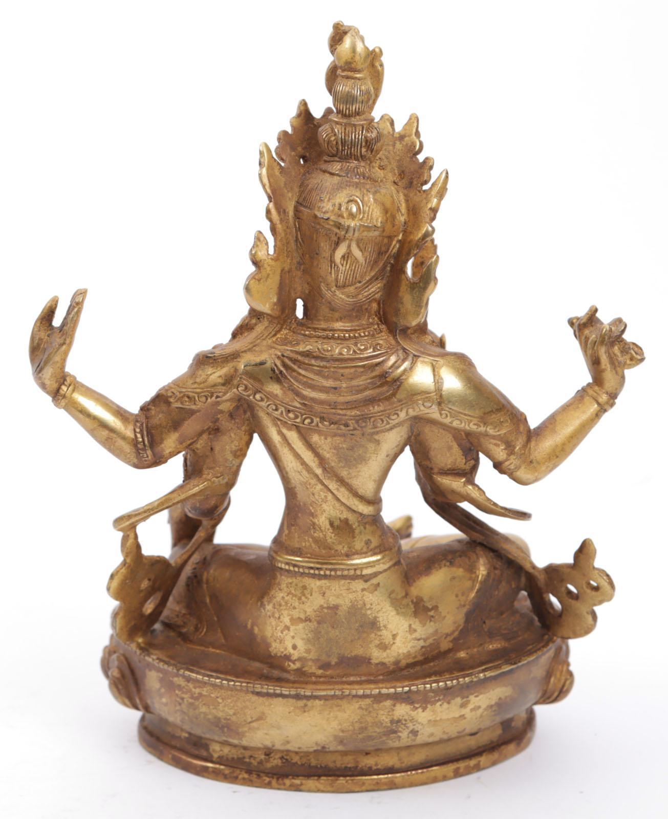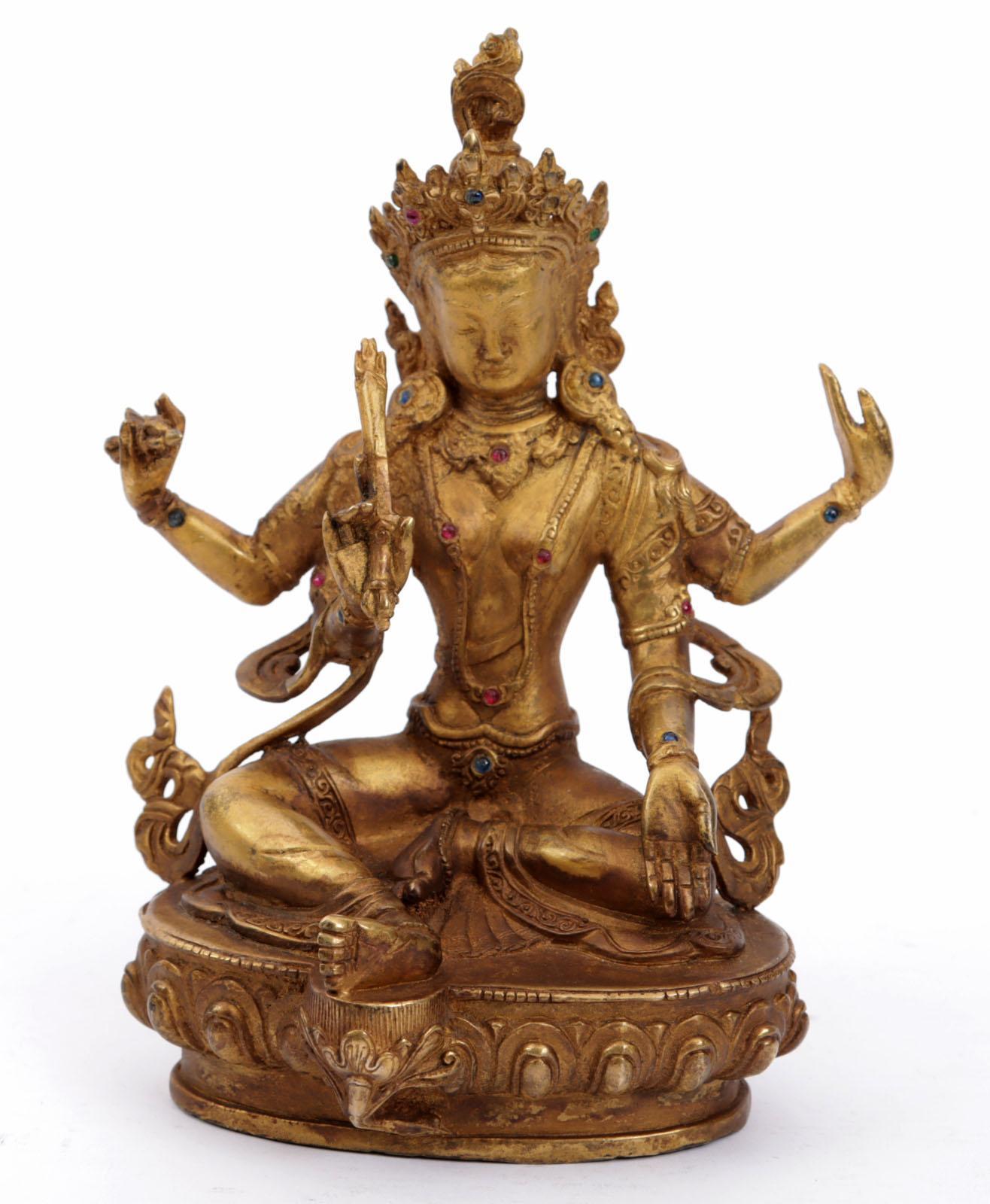 Verguld met steentjes ingelegde bronzen beeld van een Godin, h.21 cm.
