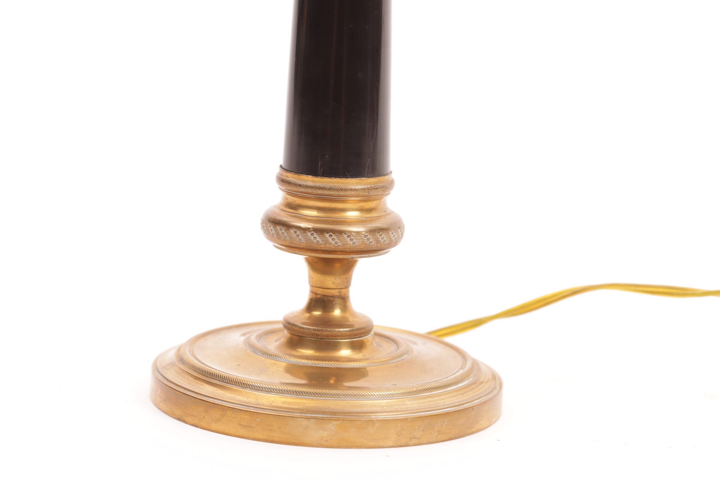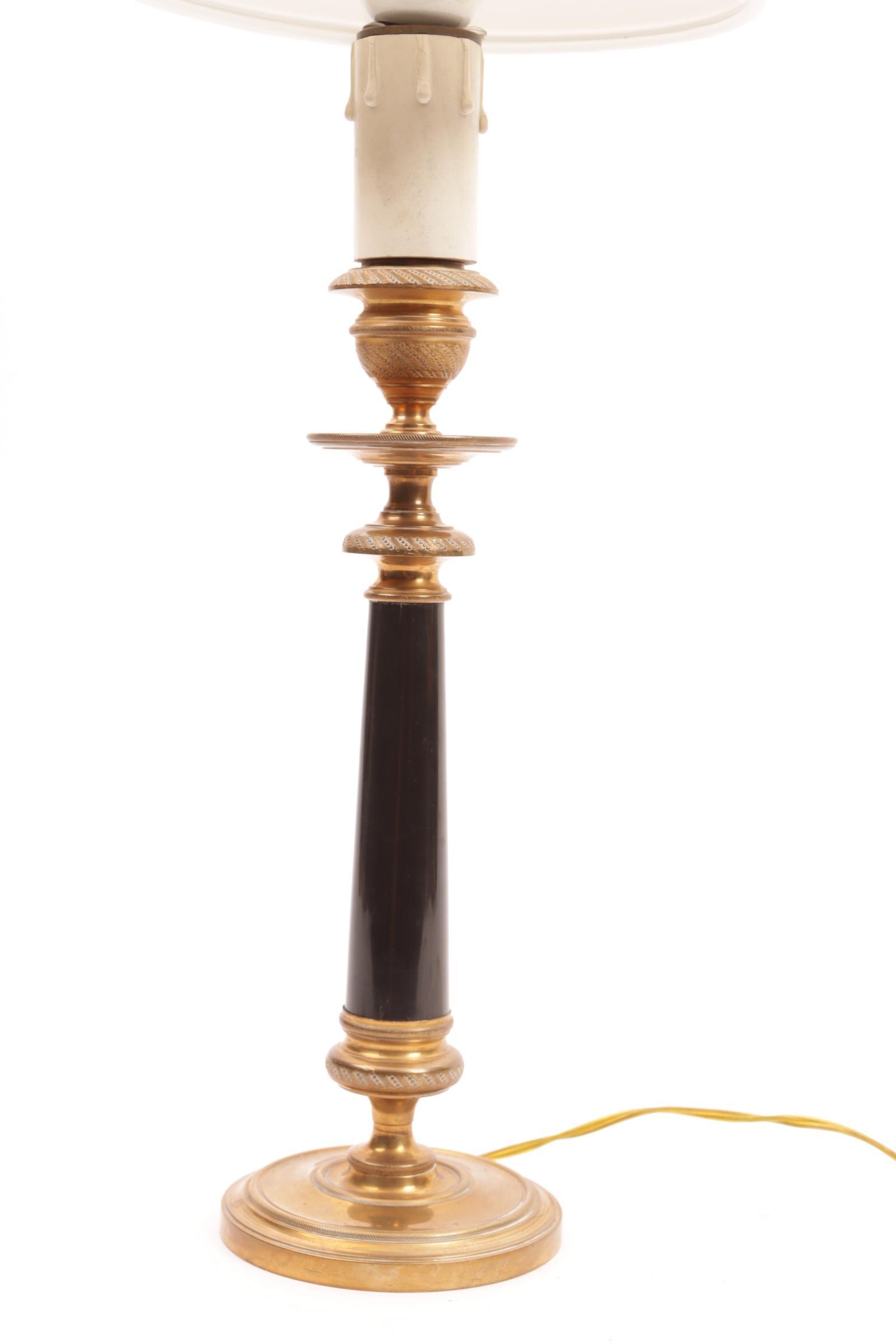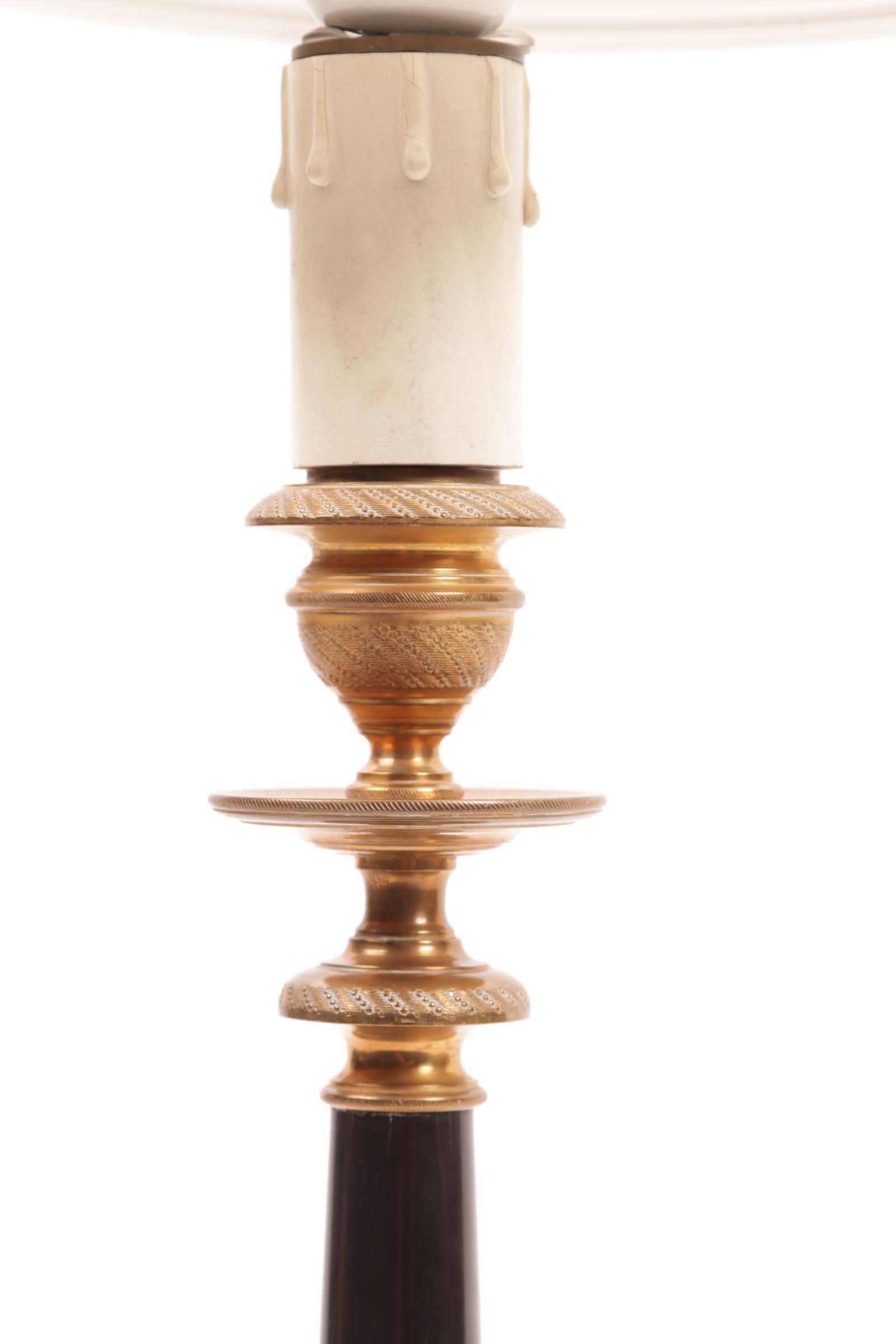 Oude Italiaanse messing schemerlamp met zwarte stam en witte kap, empire-stijl, h.51 cm.