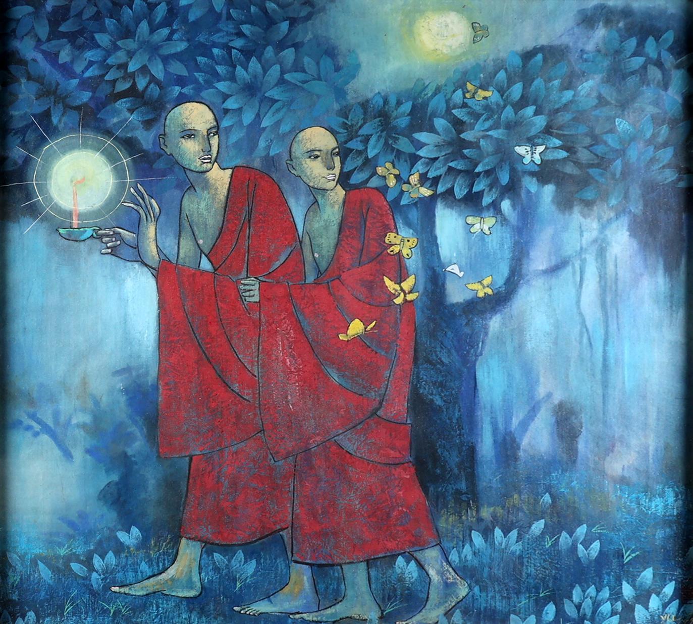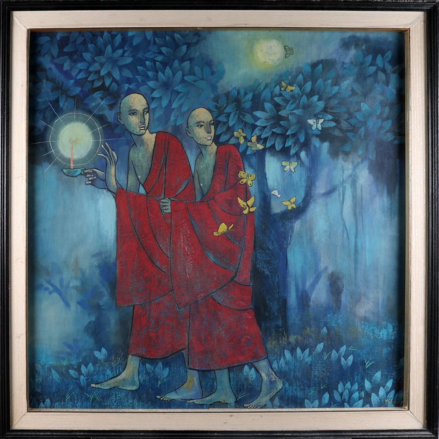 Chinese school, Twee Boeddhistische monniken met kaarsje in de nacht, acryl op papier achter glas, gesigneerd en gedateerd '99, 87 x 85 cm.