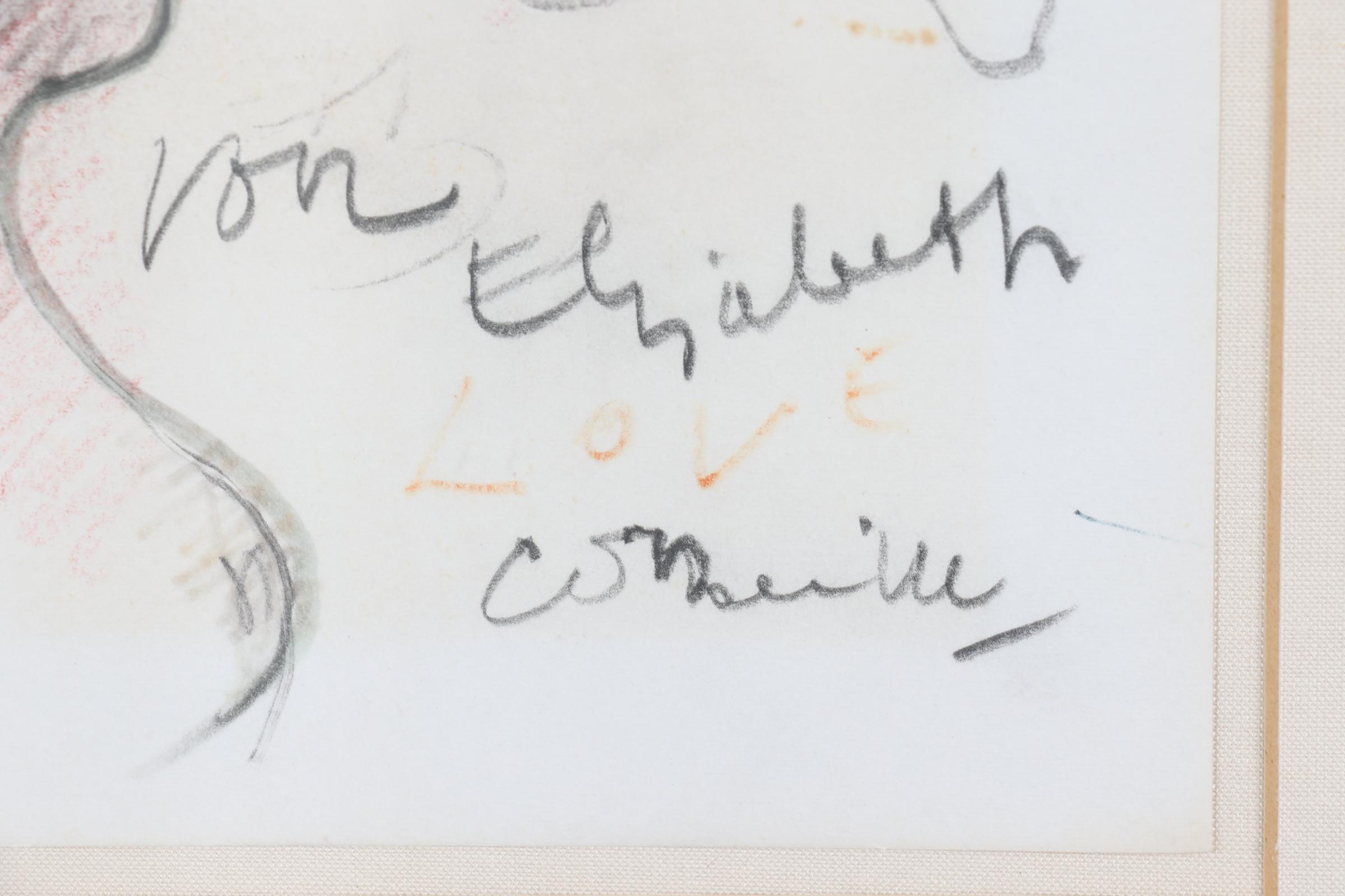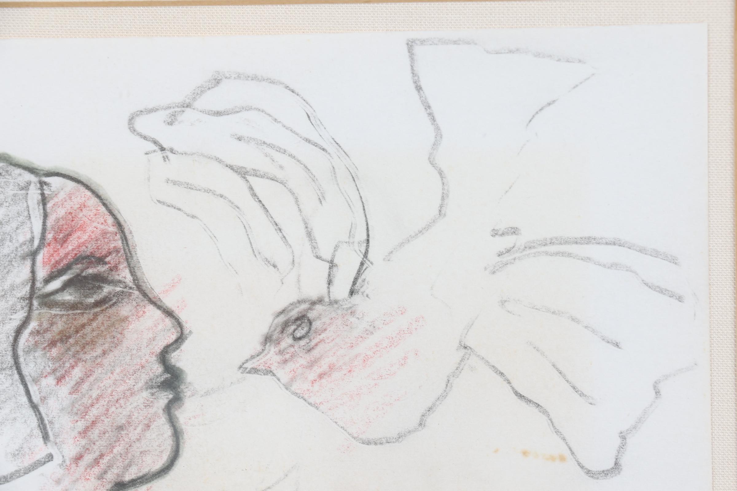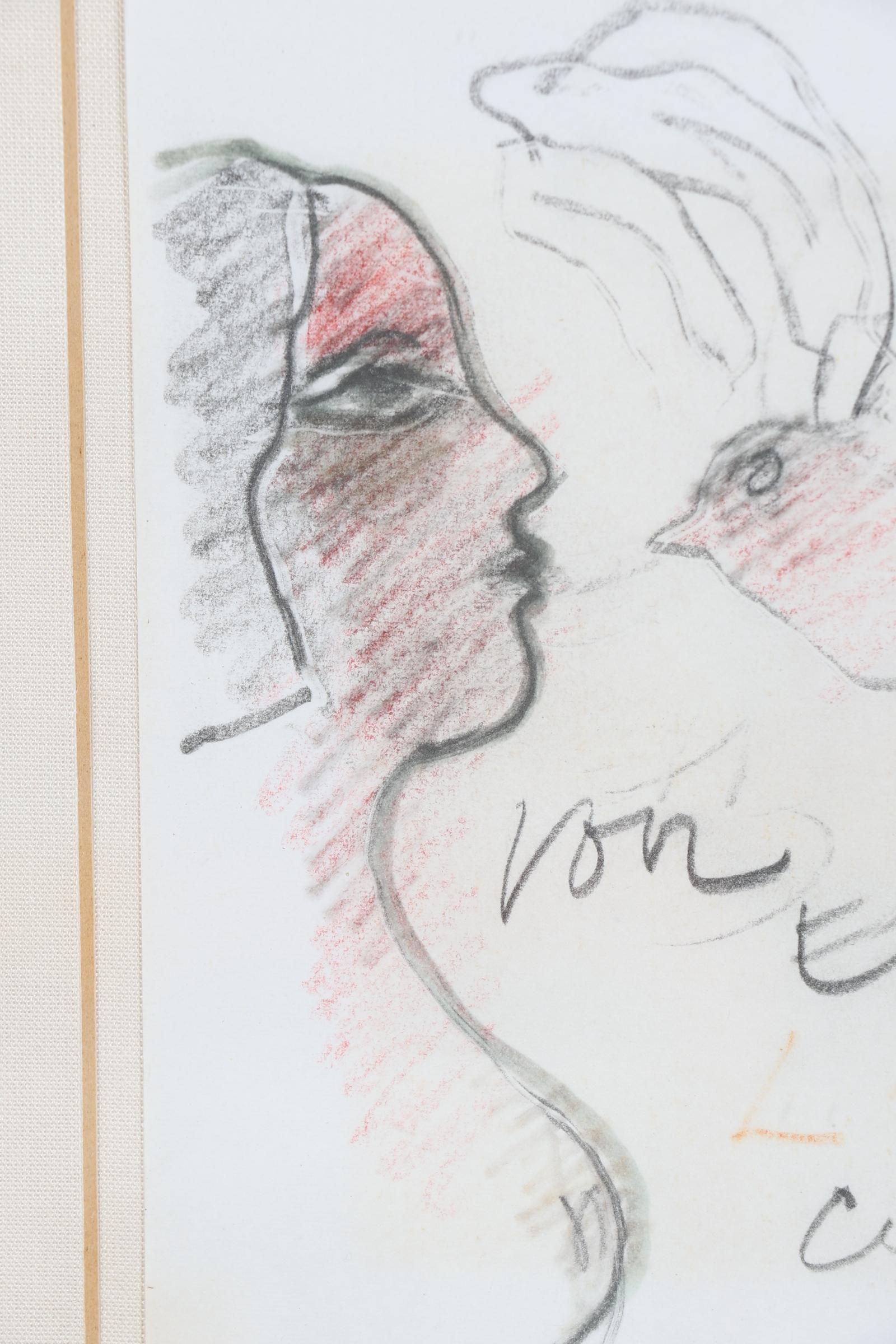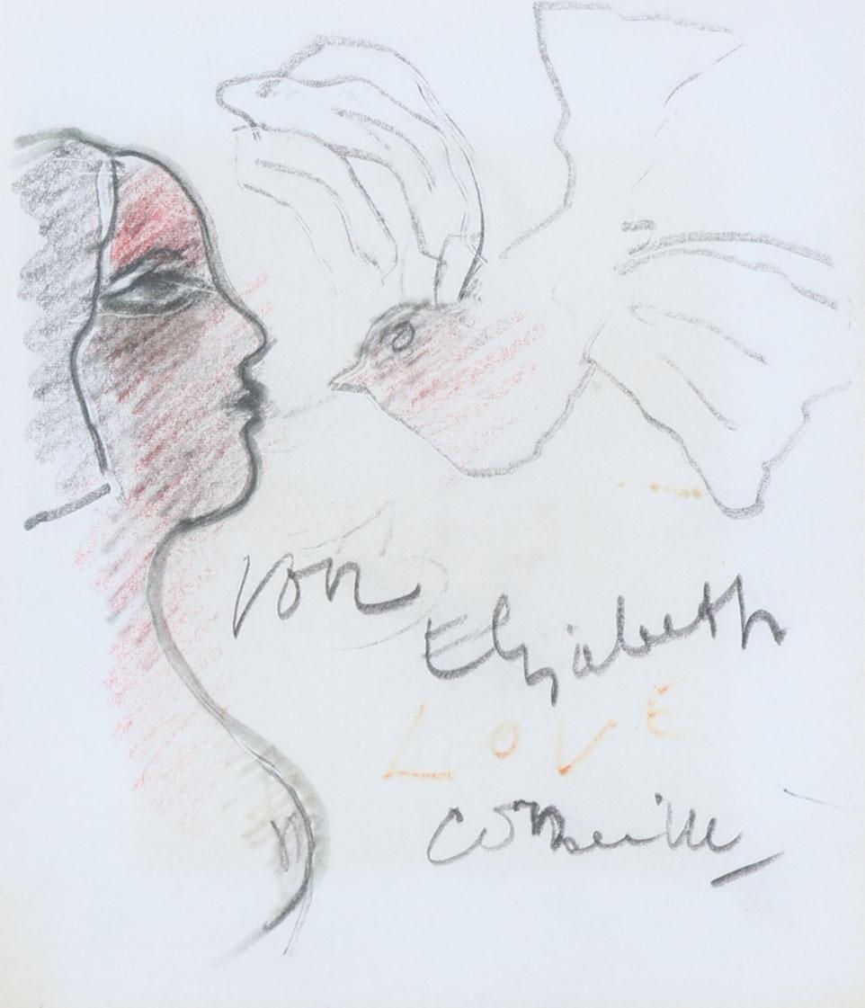'Corneille', alias van Cornelis Guillaume van Beverloo, (1922- 2010), Vrouw met vogel, tekening met connotatie: 'Voor Elisabeth Love Corneille', 16 x 13,5 cm. Provenance: collectie Kunsthandel Elisabeth den Bieman de Haas. Tentoonstelling: Maison des Arts Tunis, Le Belvédère, 10-30 oktober 1998