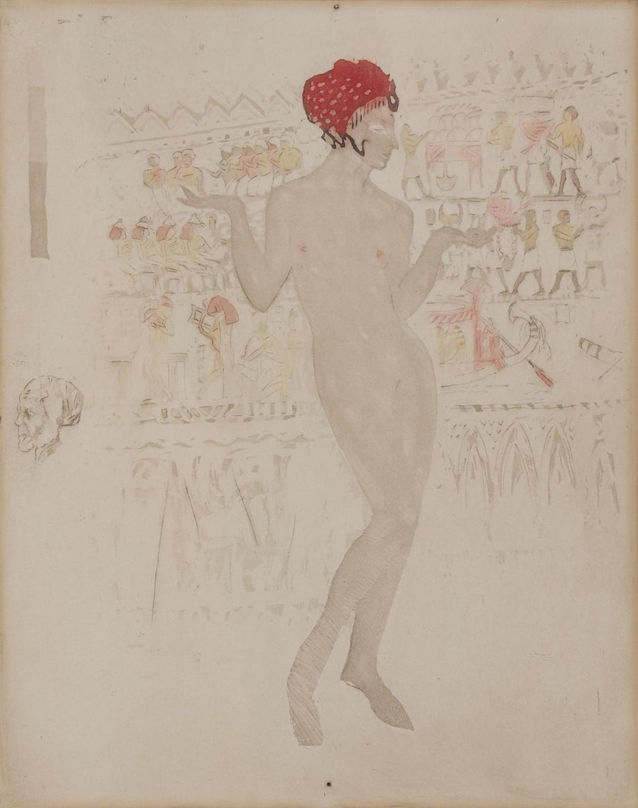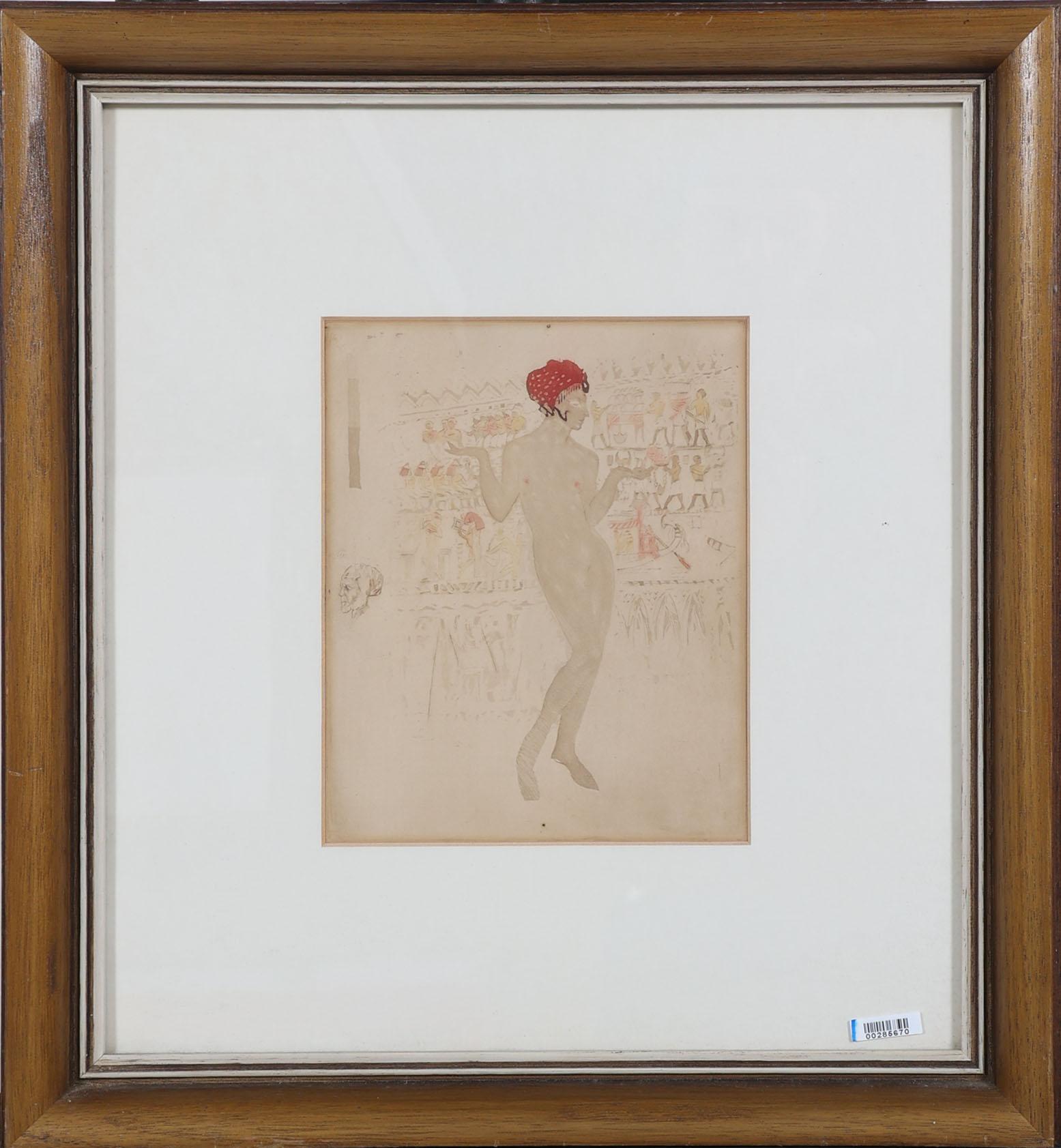 Onb. meester, Naakt met rode muts tegen Egyptische achtergond, aquarel op papier, 14 x 19 cm. Provenance: collectie Kunsthandel Elisabeth den Bieman de Haas