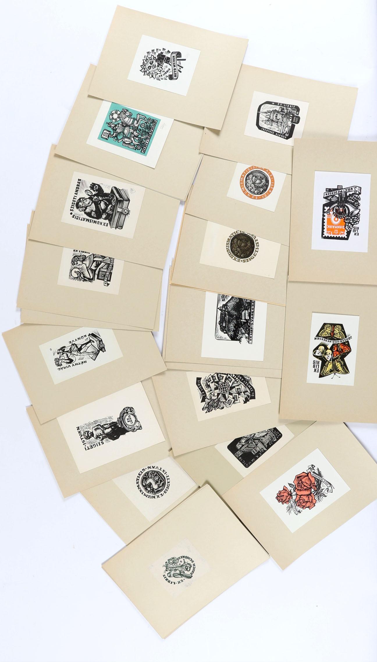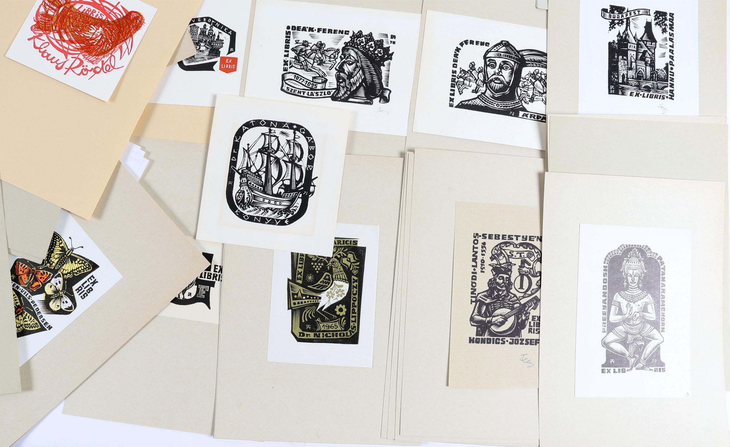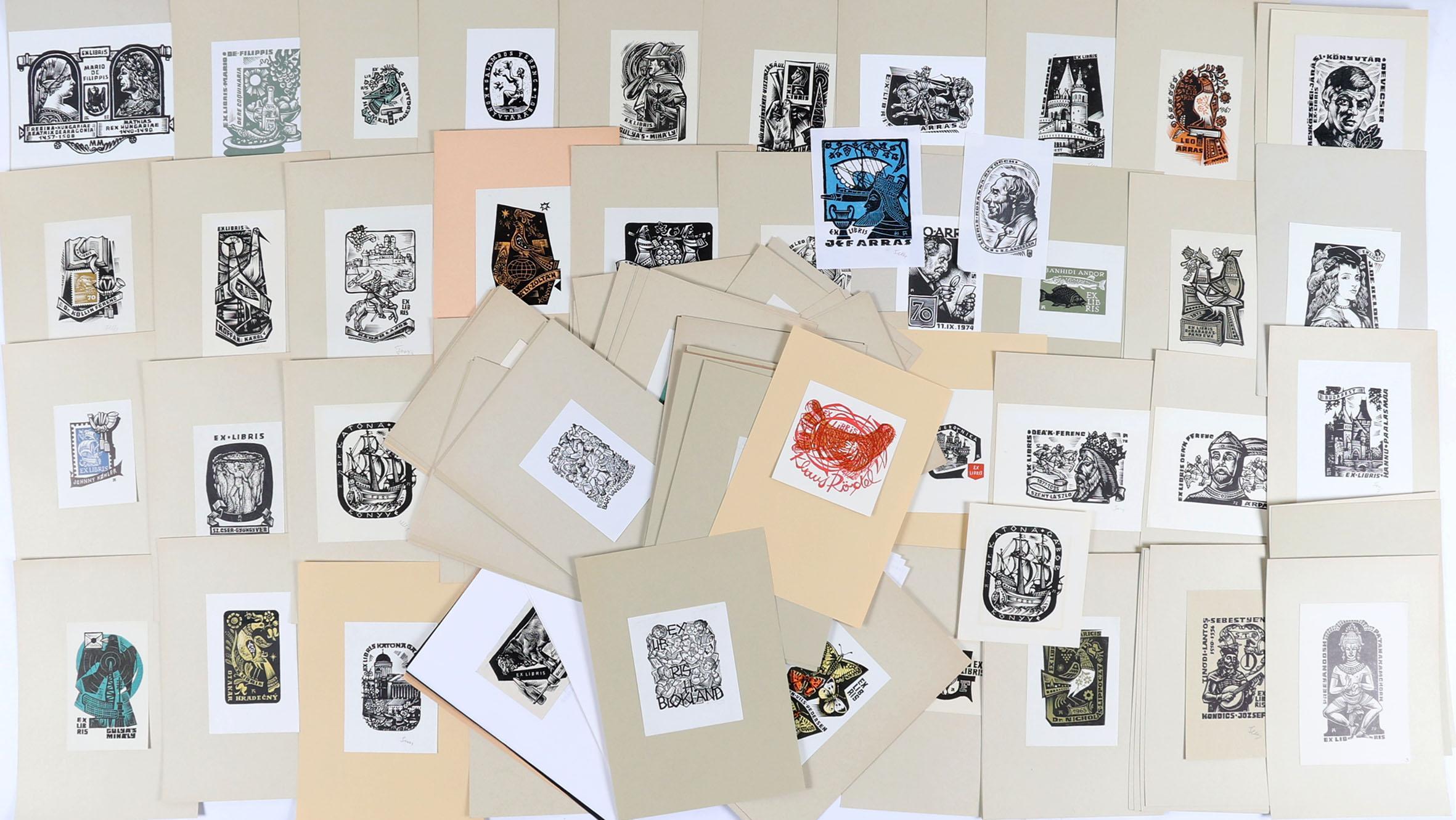 collectie van plm. 160 exlibris, gemaakt door Hongaarse kunstenaars,hoogdruk / vlakdruk. O..a. Antal Fery, Duskay, Istvan Drahos, Ferenc Furlau.Opgeplakt, deels gesigneerd.