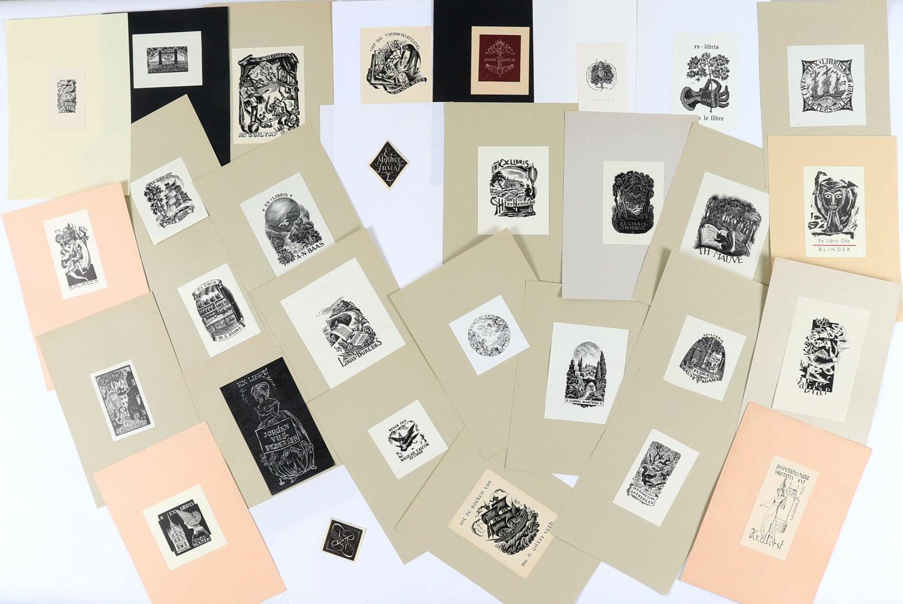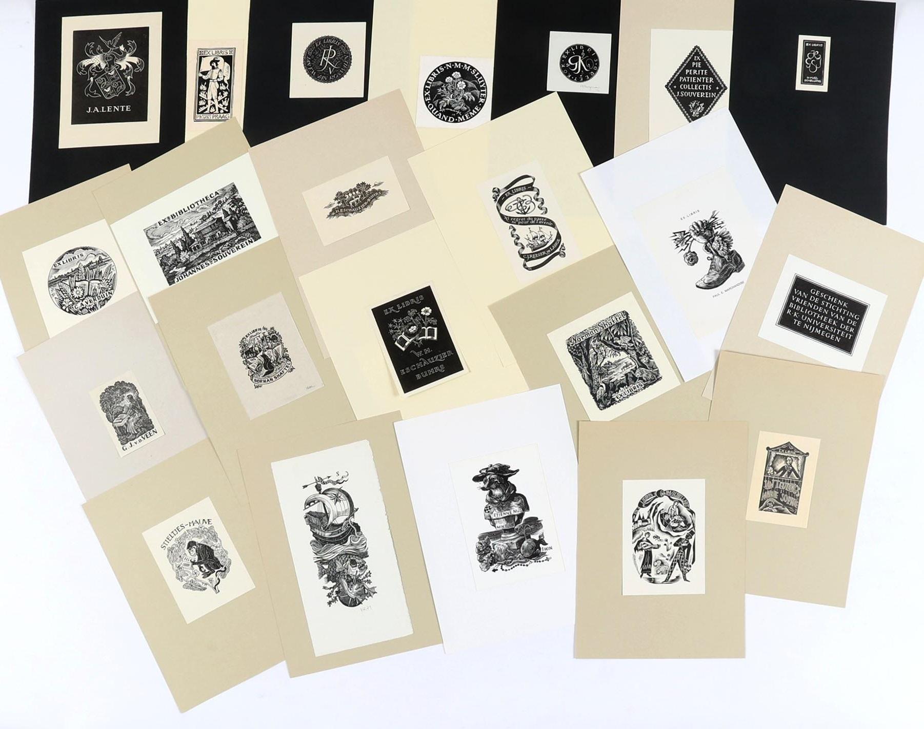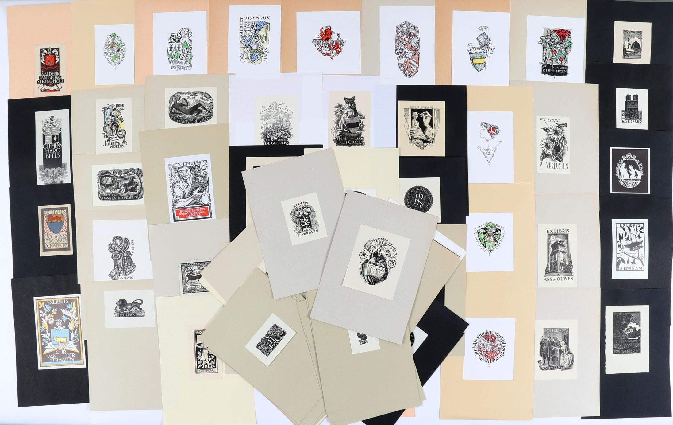 collectie van plm. 90 Nederlandse exlibris, hoogdruk / vlakdruk, opgeplakt. Deels gesigneerd. Werk van o.a. Th. Mauve, C. Labots, E..v.d. Hoeven, D. de Bruin, M. Pot, P.v. Roemburg, G. Rueter, Th. Broekstra.