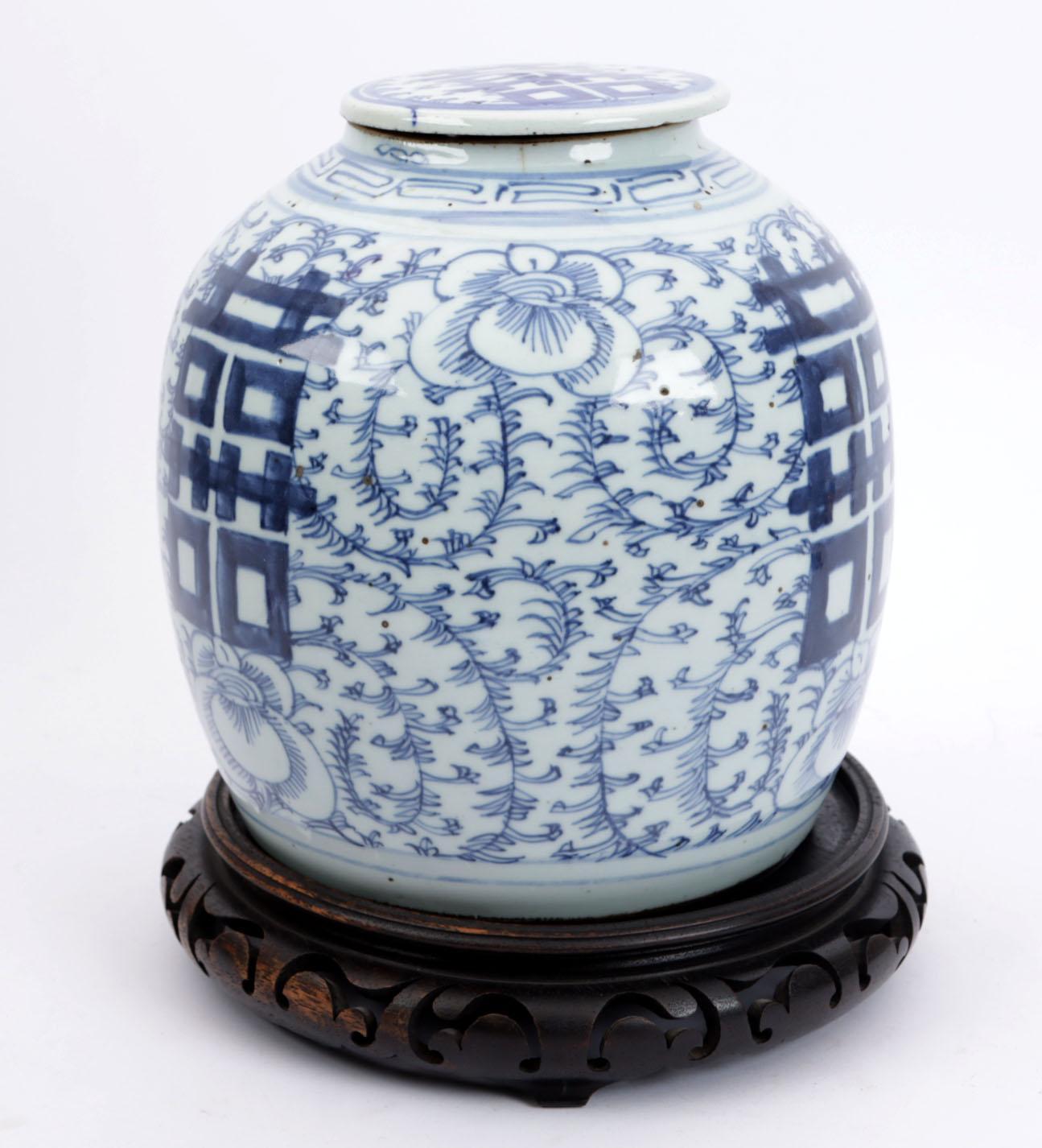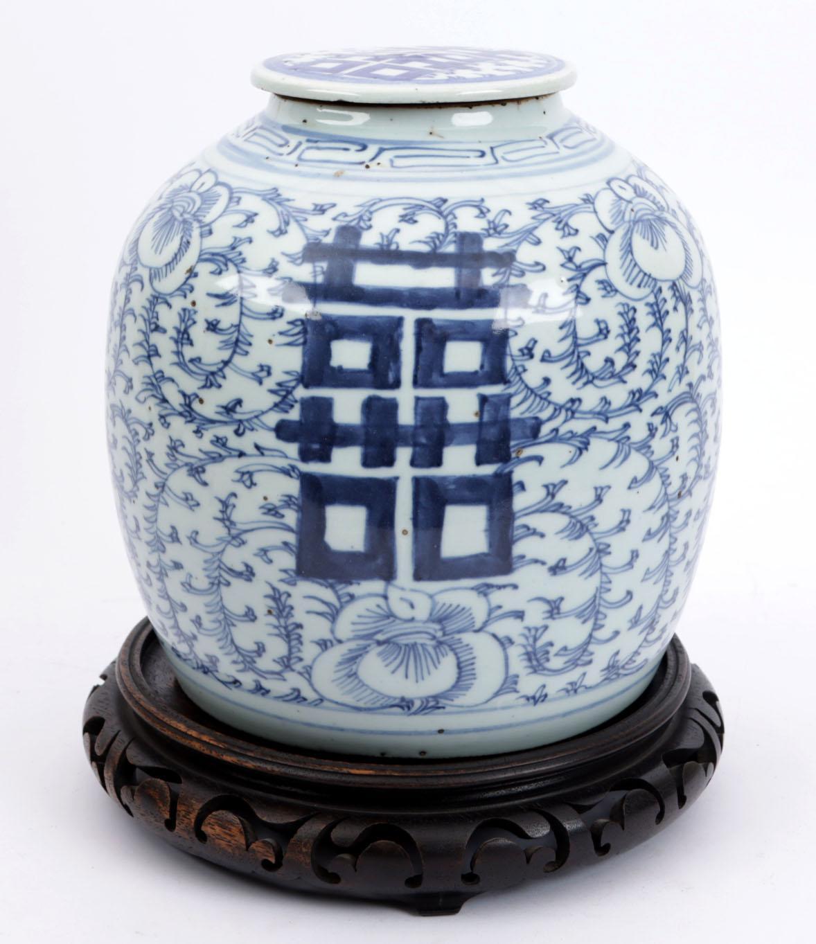 Blauw/wit Chinees porseleinen dekselpot op houten sokkel, h.27 cm.