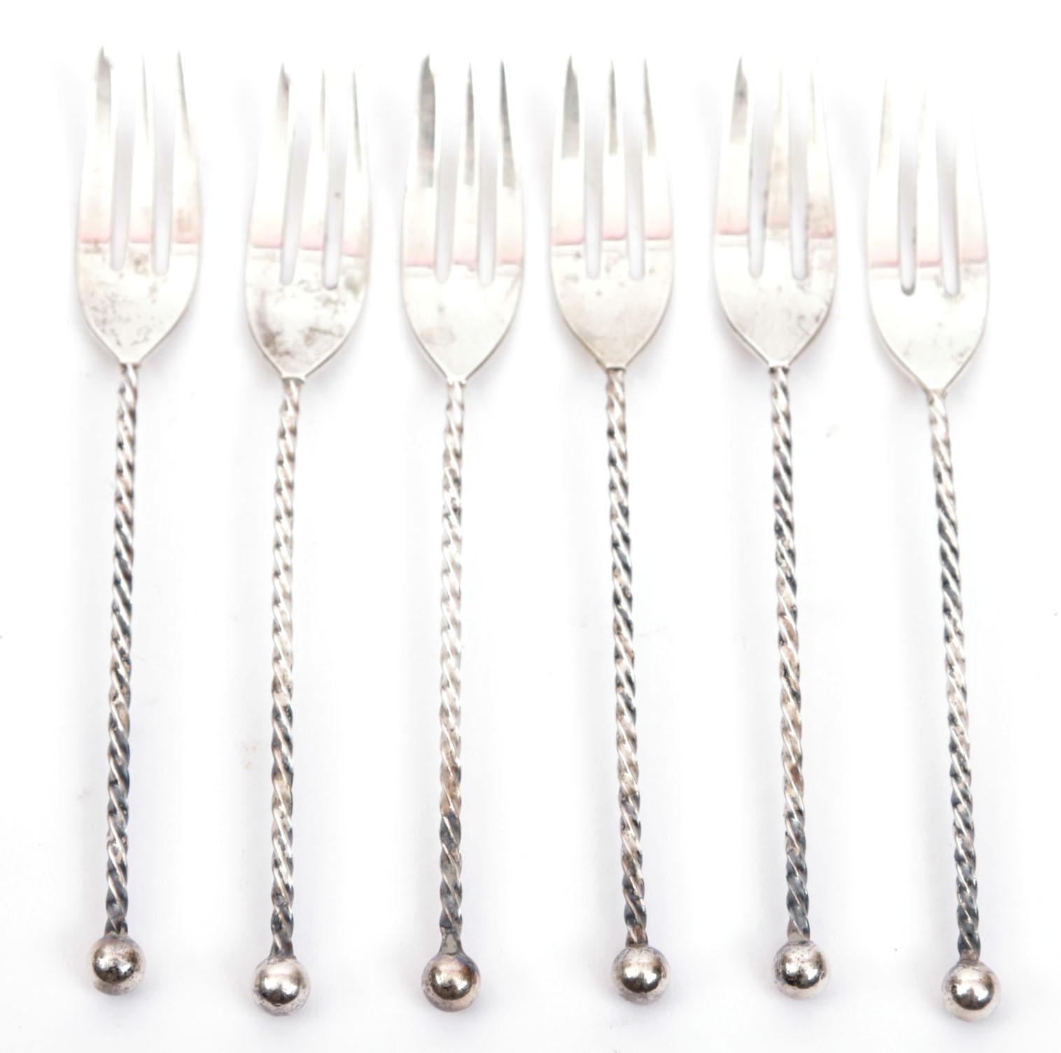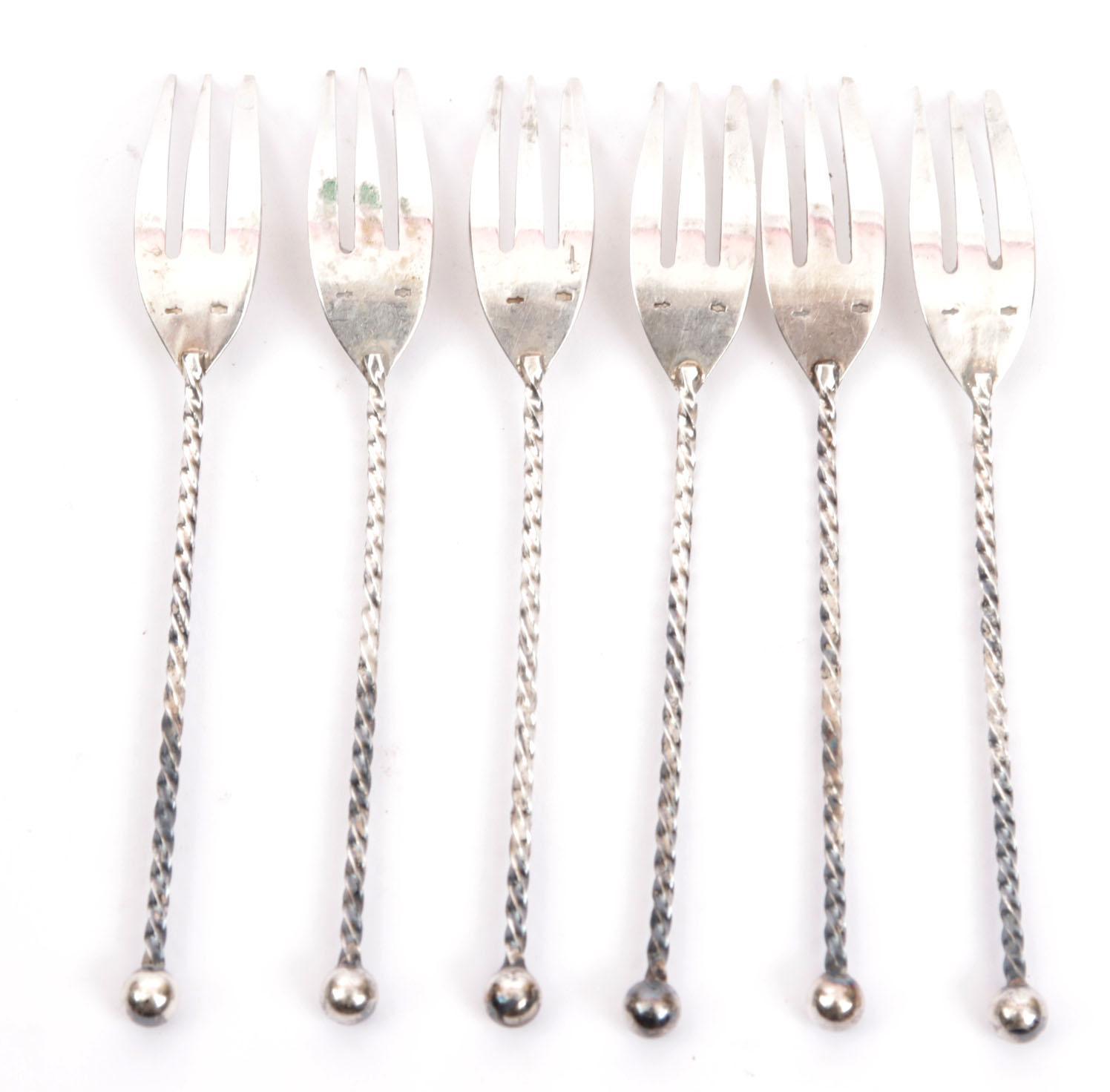 Set van zes 2e gehalte zilveren gebaksvorkjes met getorste steel, 51 gram