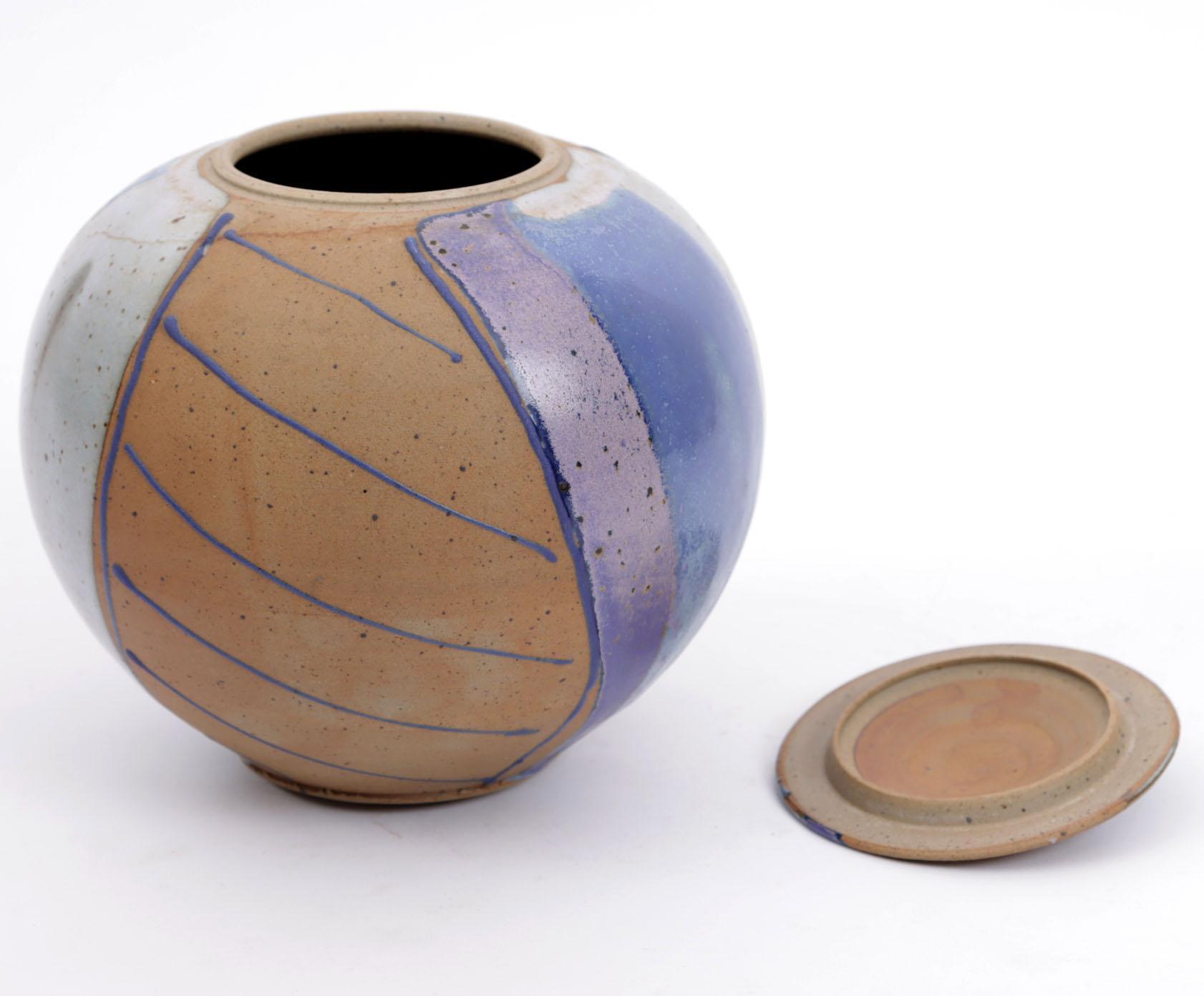 Bruin/blauwe keramieken dekselpot, h.15 cm.