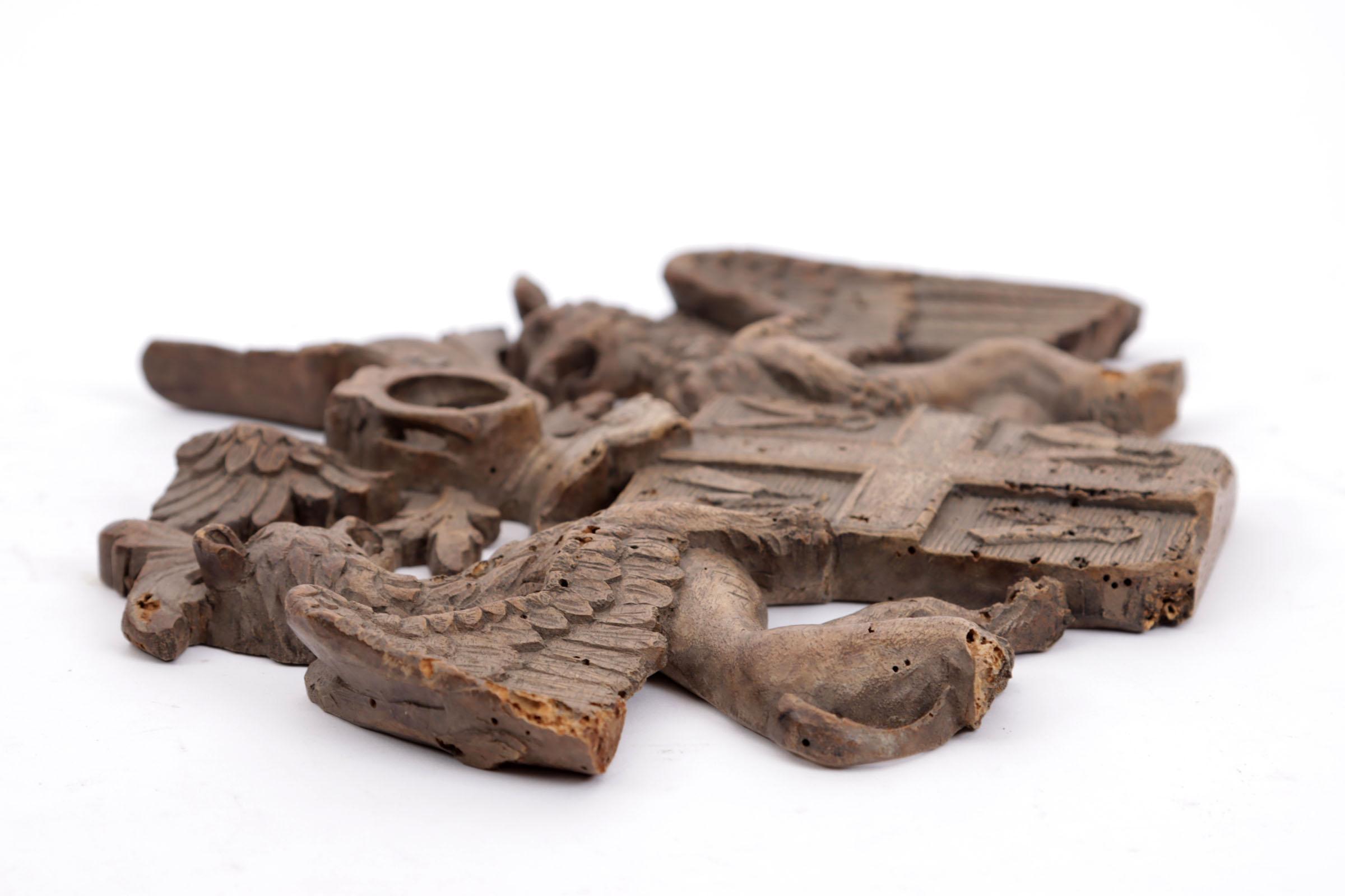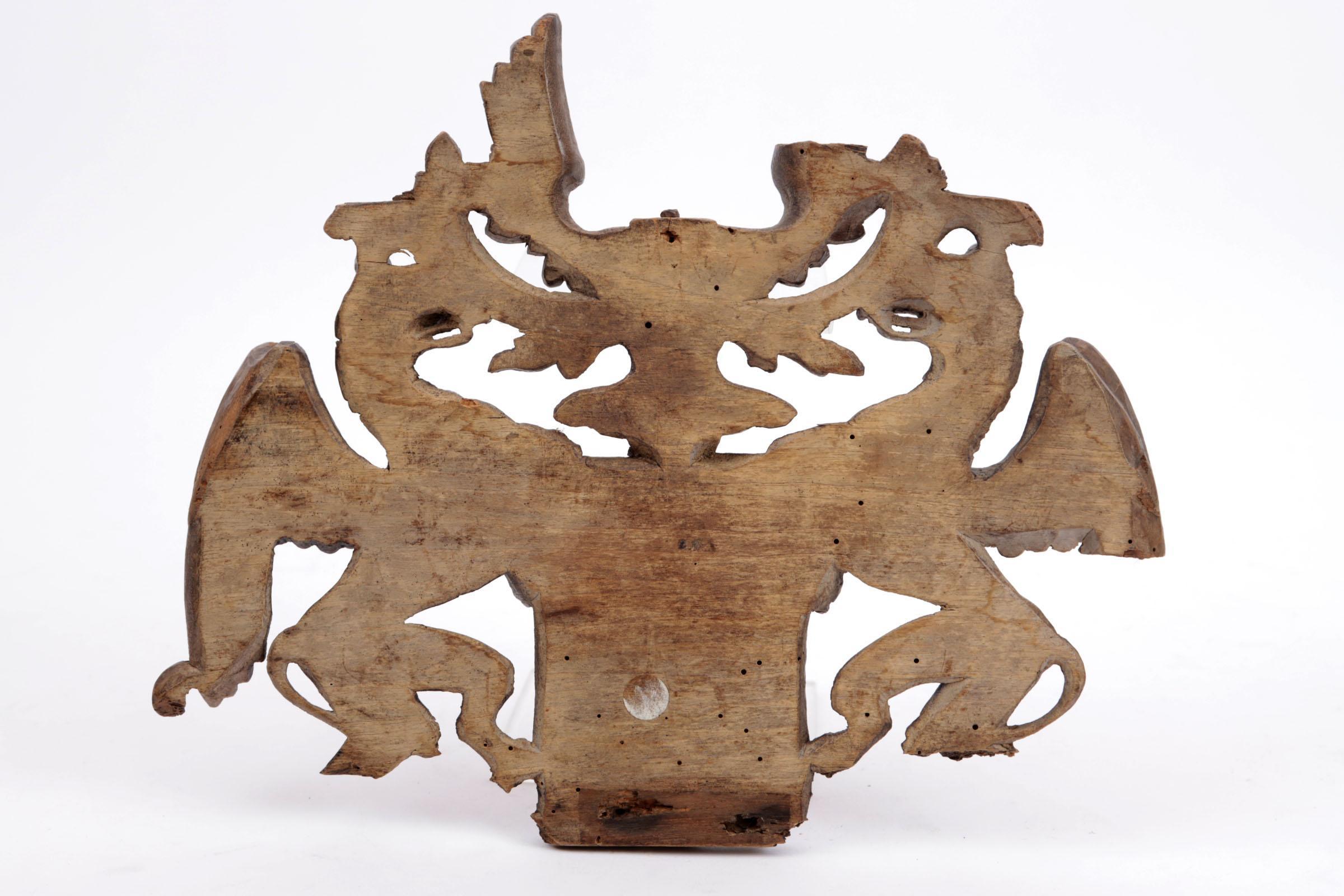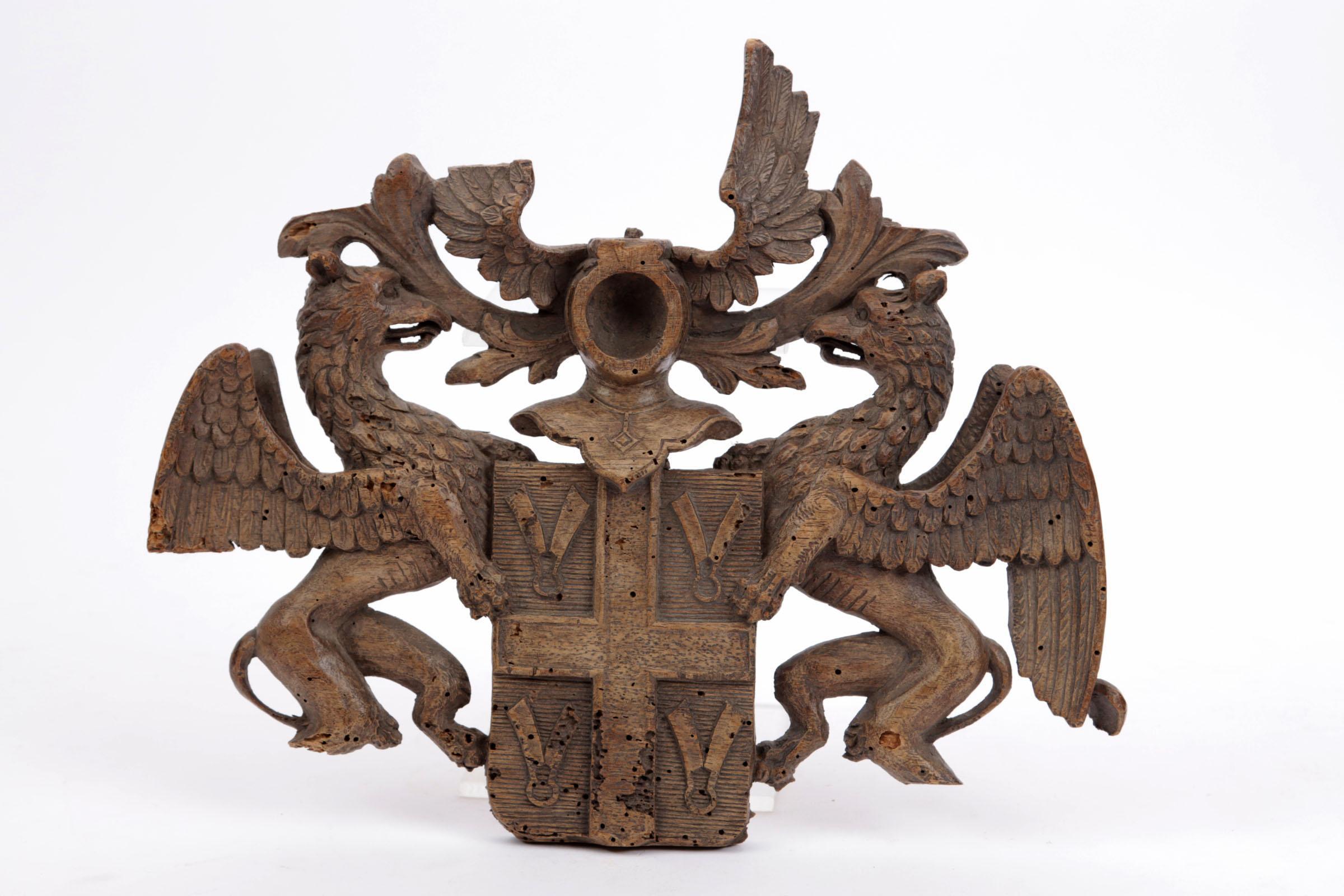 Antiek houten wapenschild met afbeelding van griffioenen (defecten)