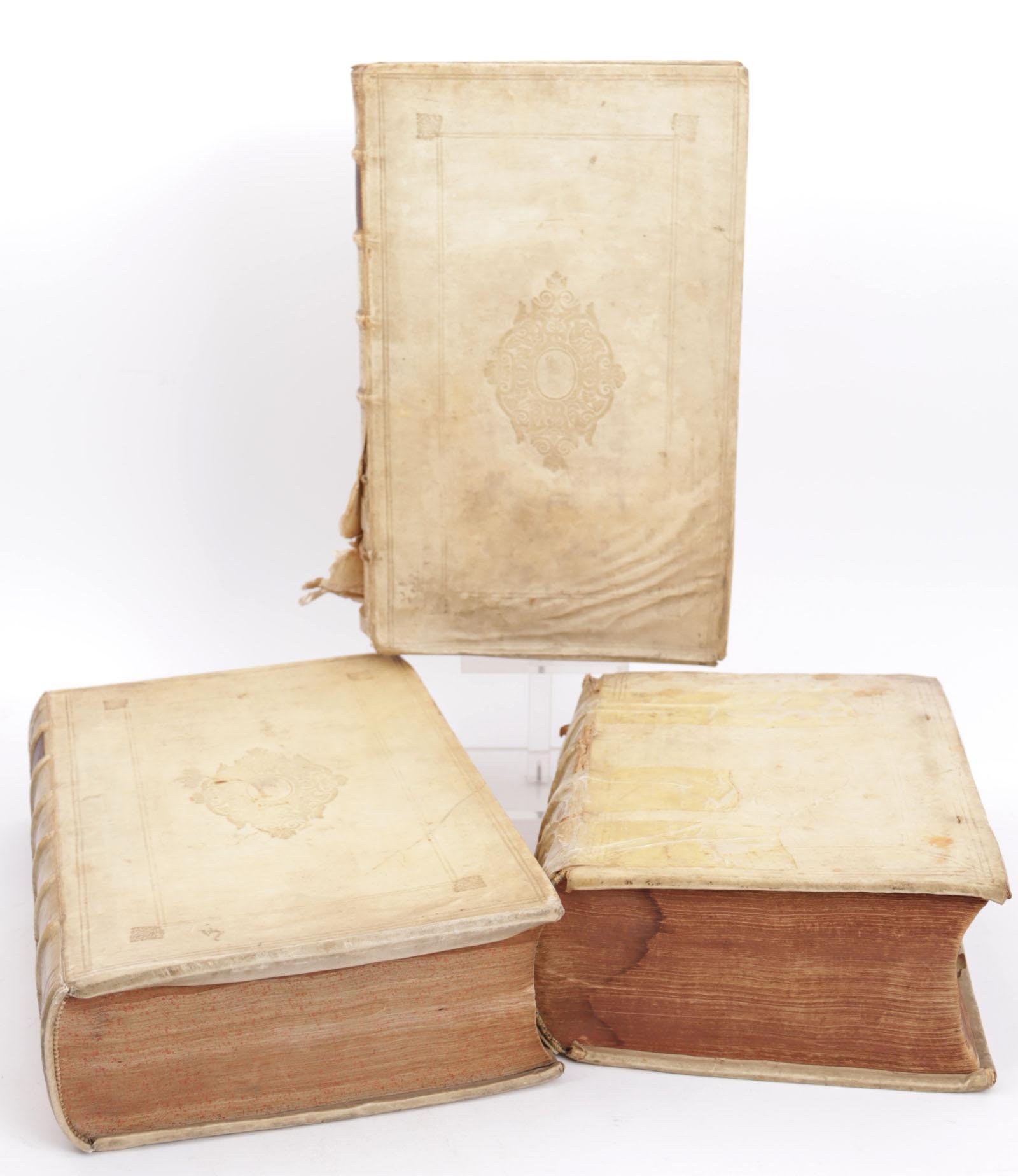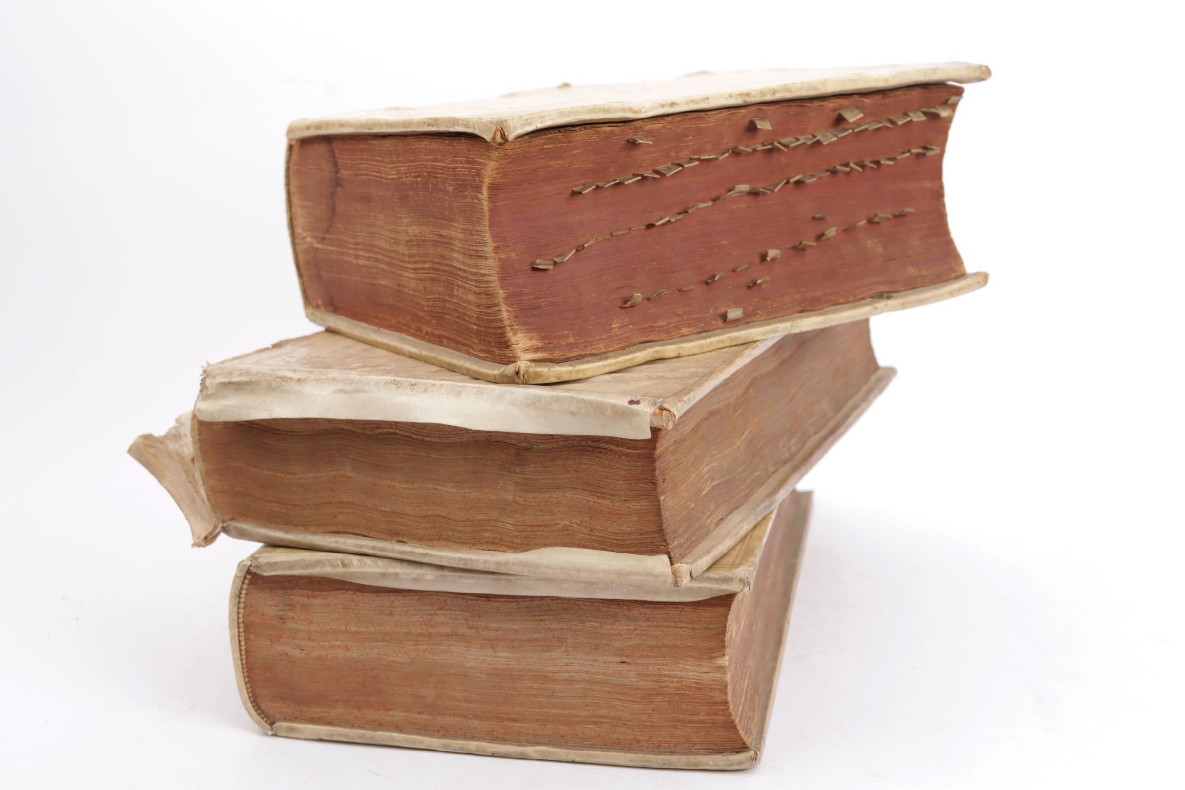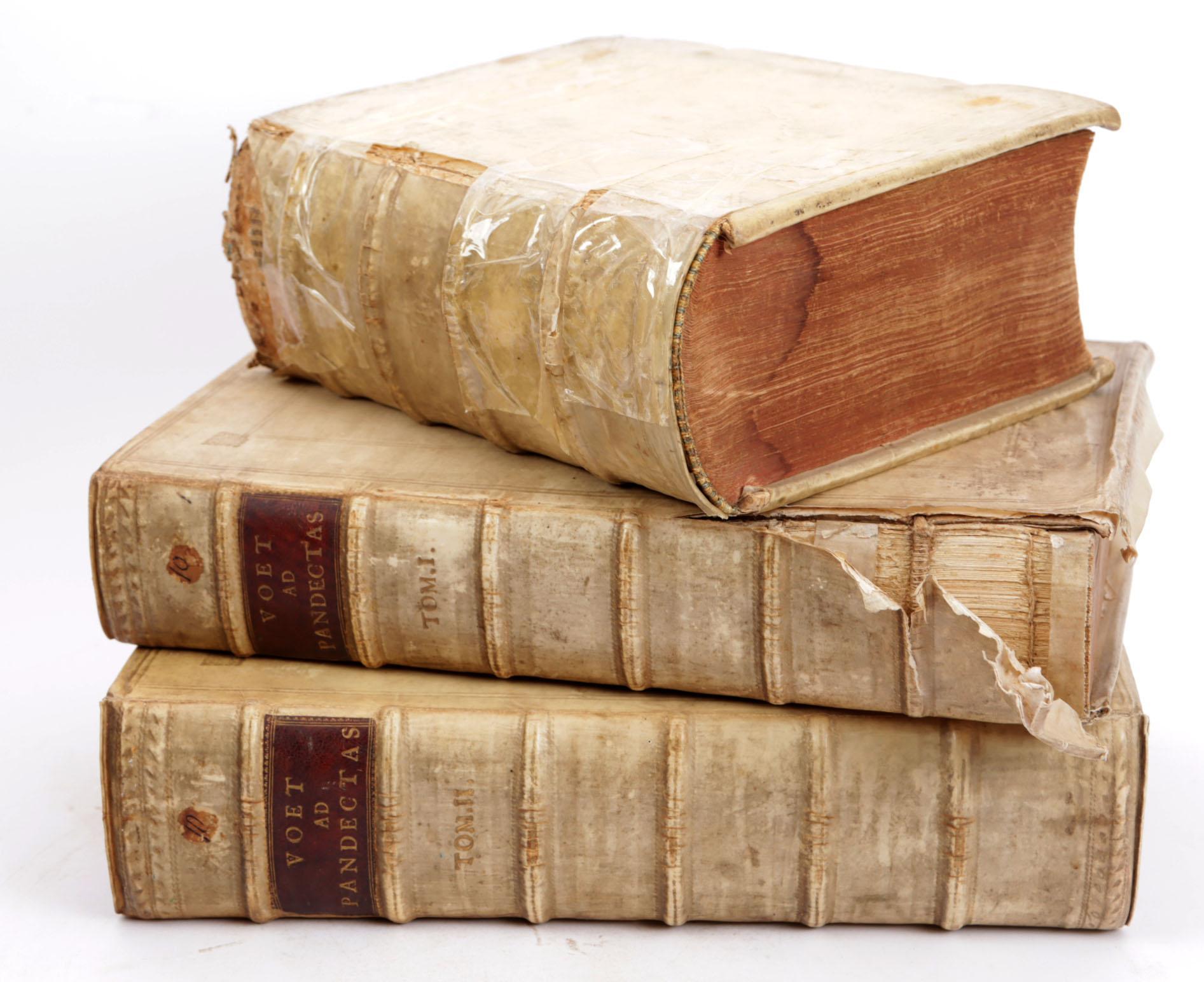 Koop van 3 diverse antieke Latijnse boeken w.o. Johannis Voet, Commentarius ad Pandectas, 17e en 18e eeuw (slechte staat)