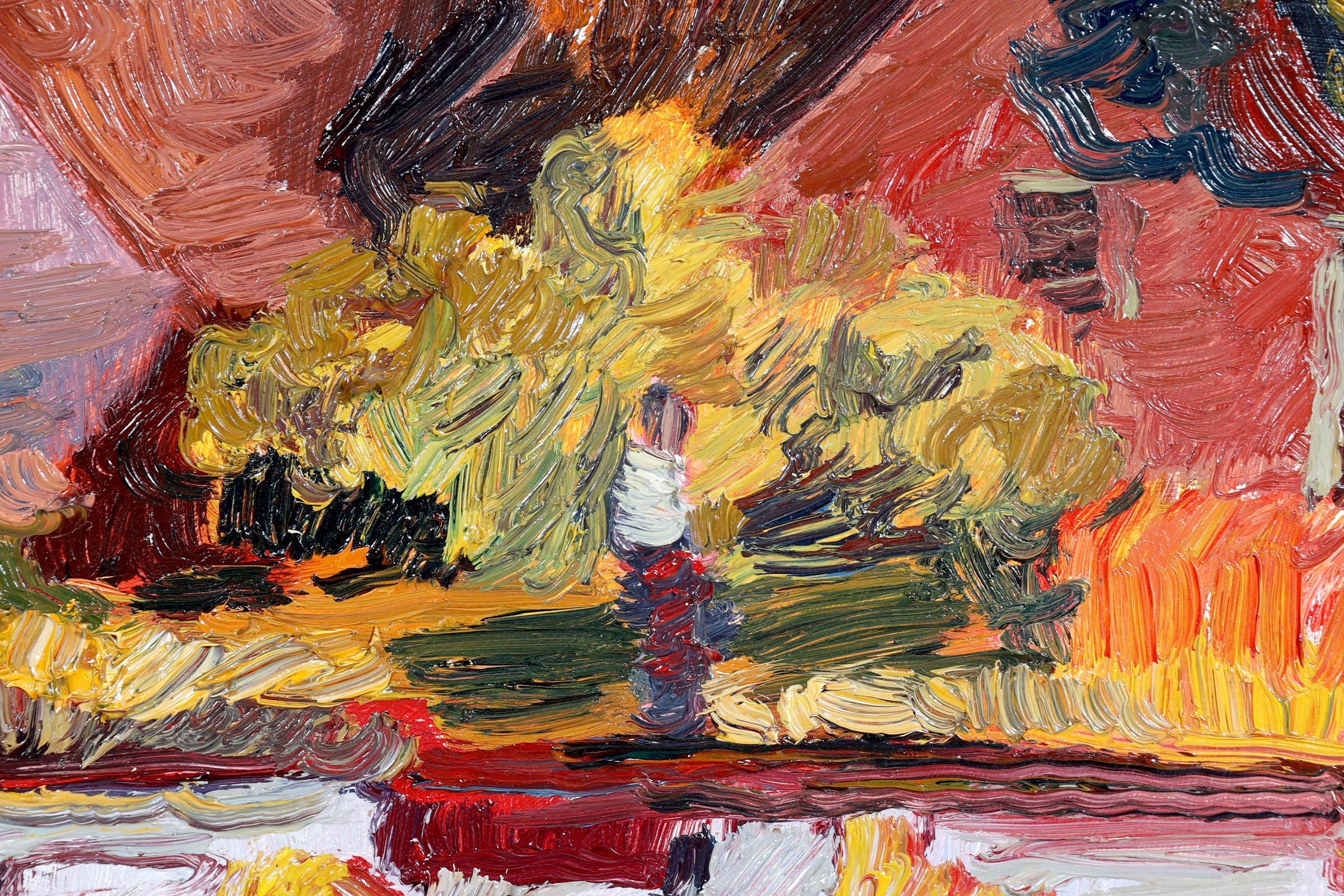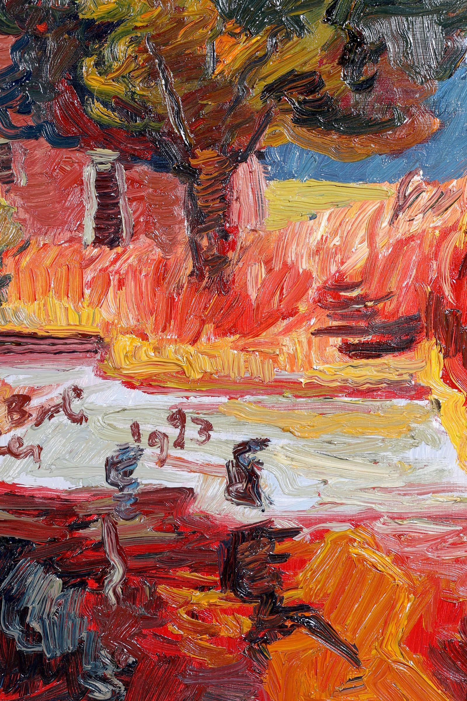 Peter Bol (1947), Man in roeiboot voor een boerderij, olieverf op board, gedateerd 1993, 50 x 60 cm.