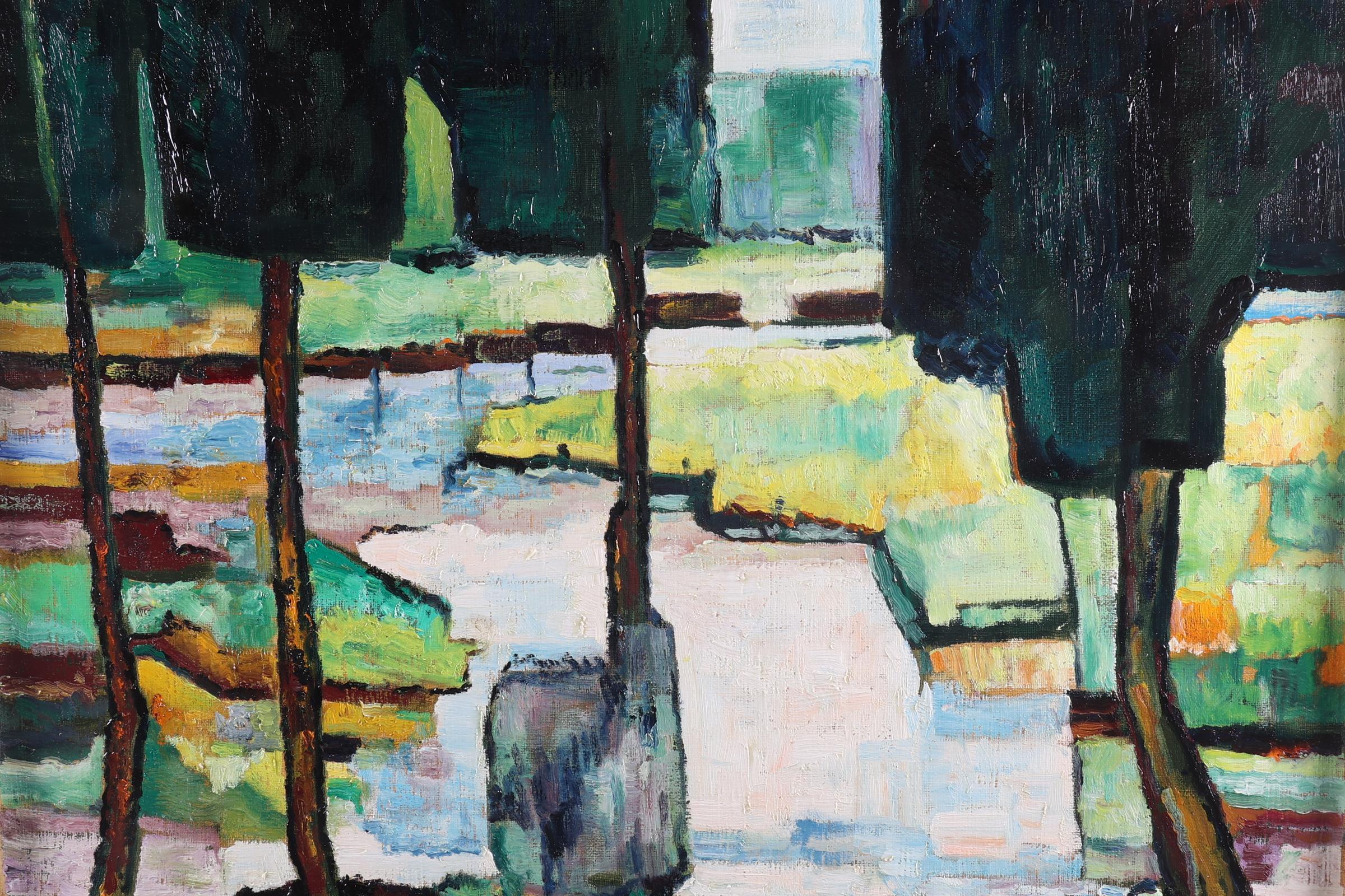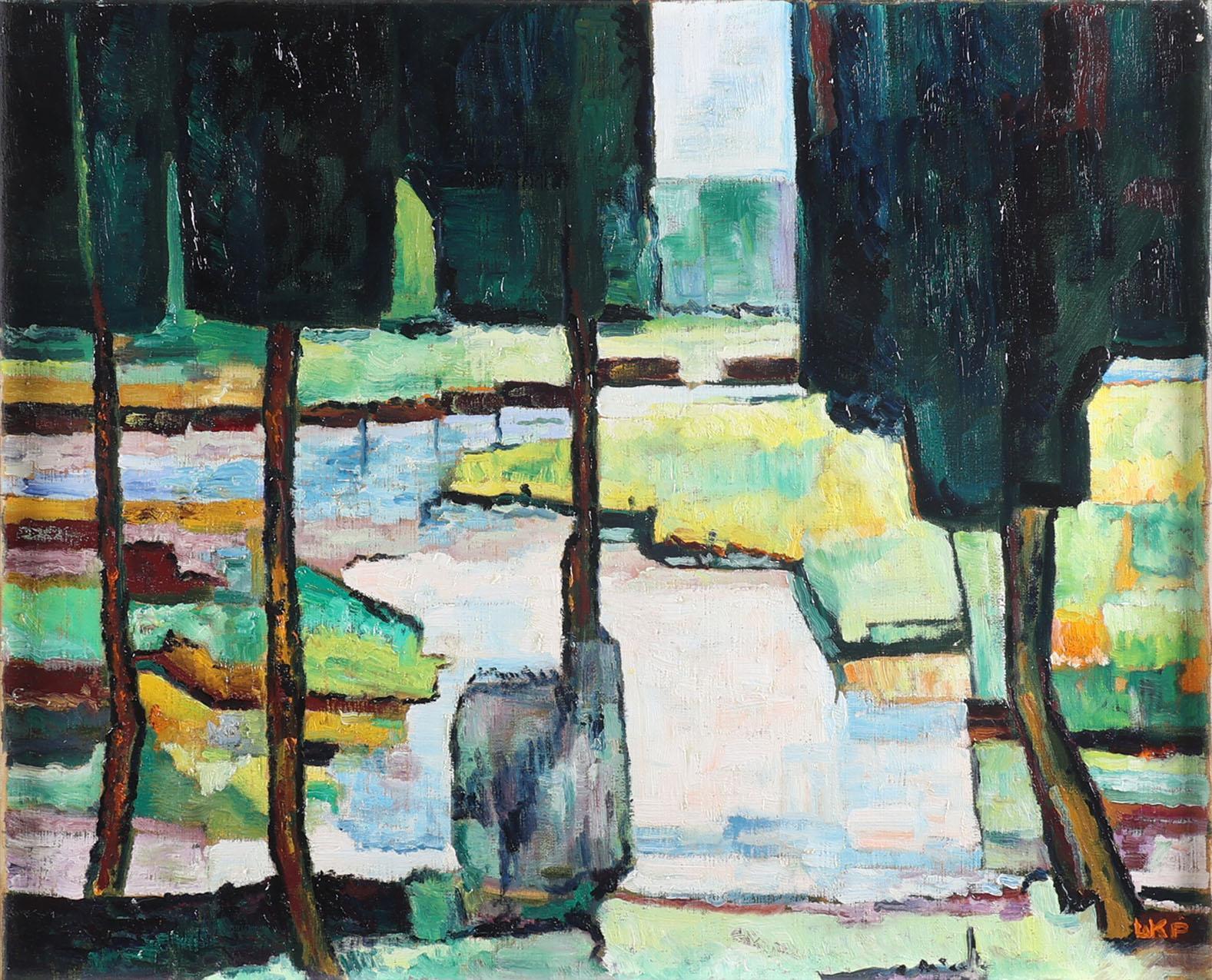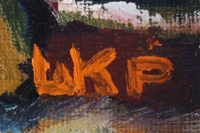 Monogram LKP, Landschap met bomen langs het water, olieverf op doek, 50 x 60 cm.