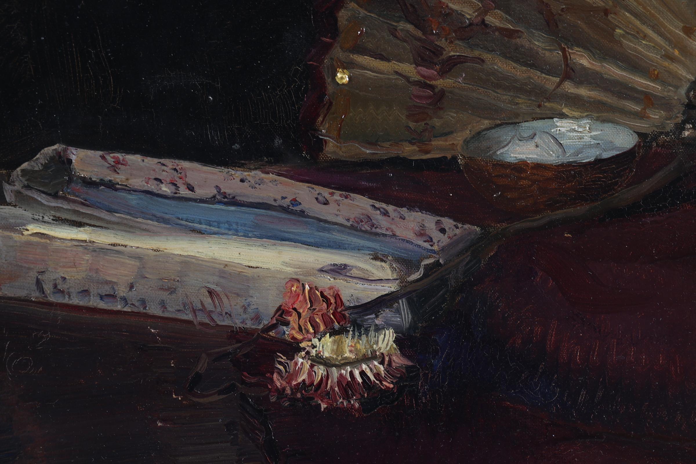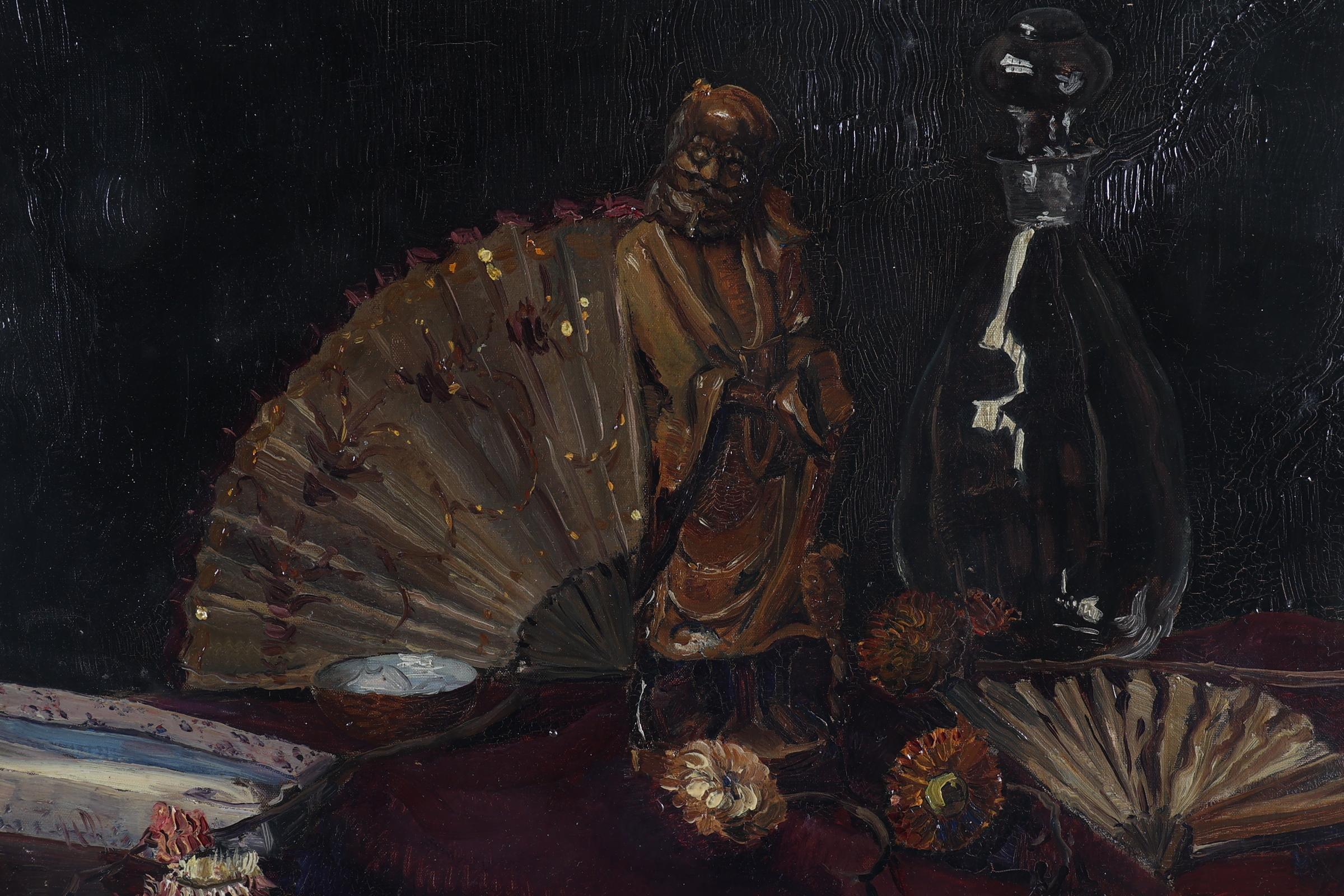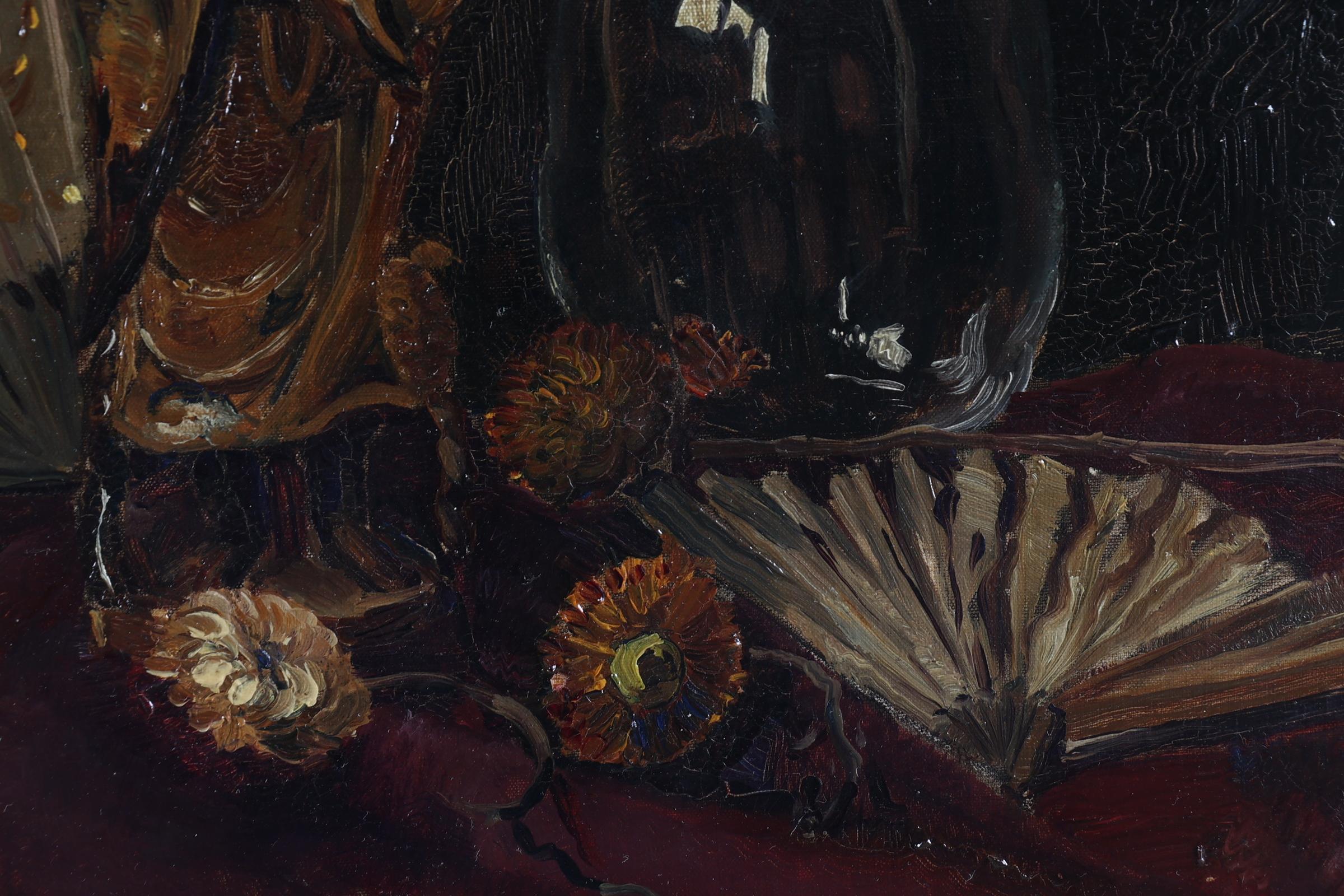 Wilhelmus Henricus Petrus Johannes (Willem) de Zwart (1862-1931), Stilleven met bloemen, waaier, beeld en karaf, olieverf op doek, 66 x 40 cm.
