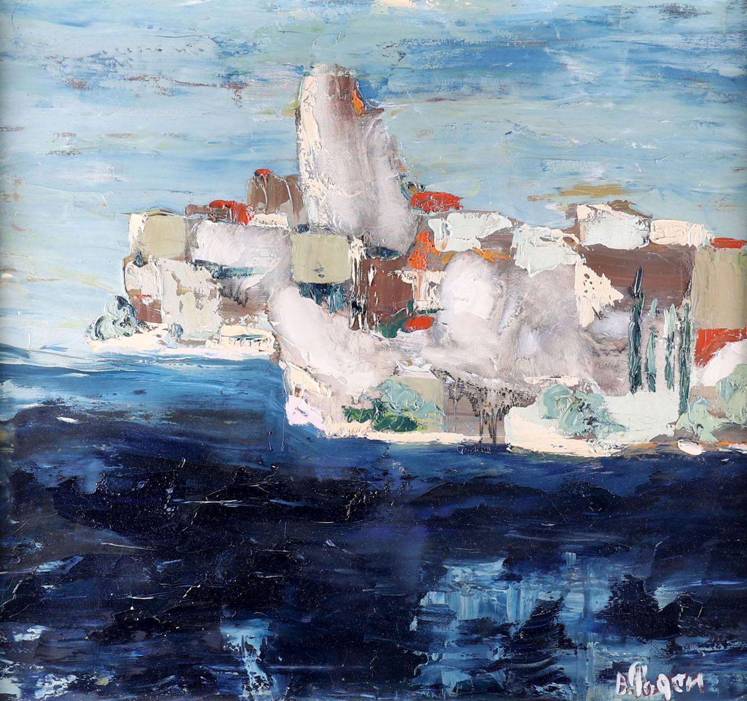 Brat Islava Pagon, Mediterraans dorpje aan zee, olieverf op doek, 70 x 80 cm.