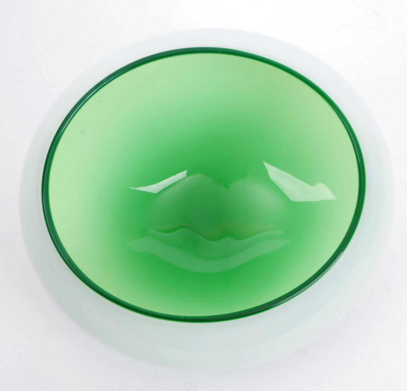 Willem Heesen (1925-2007), groen/wit glazen design schaal, h.19 x b.30 cm. (mogelijk heeft er een voetstuk onder gezeten)