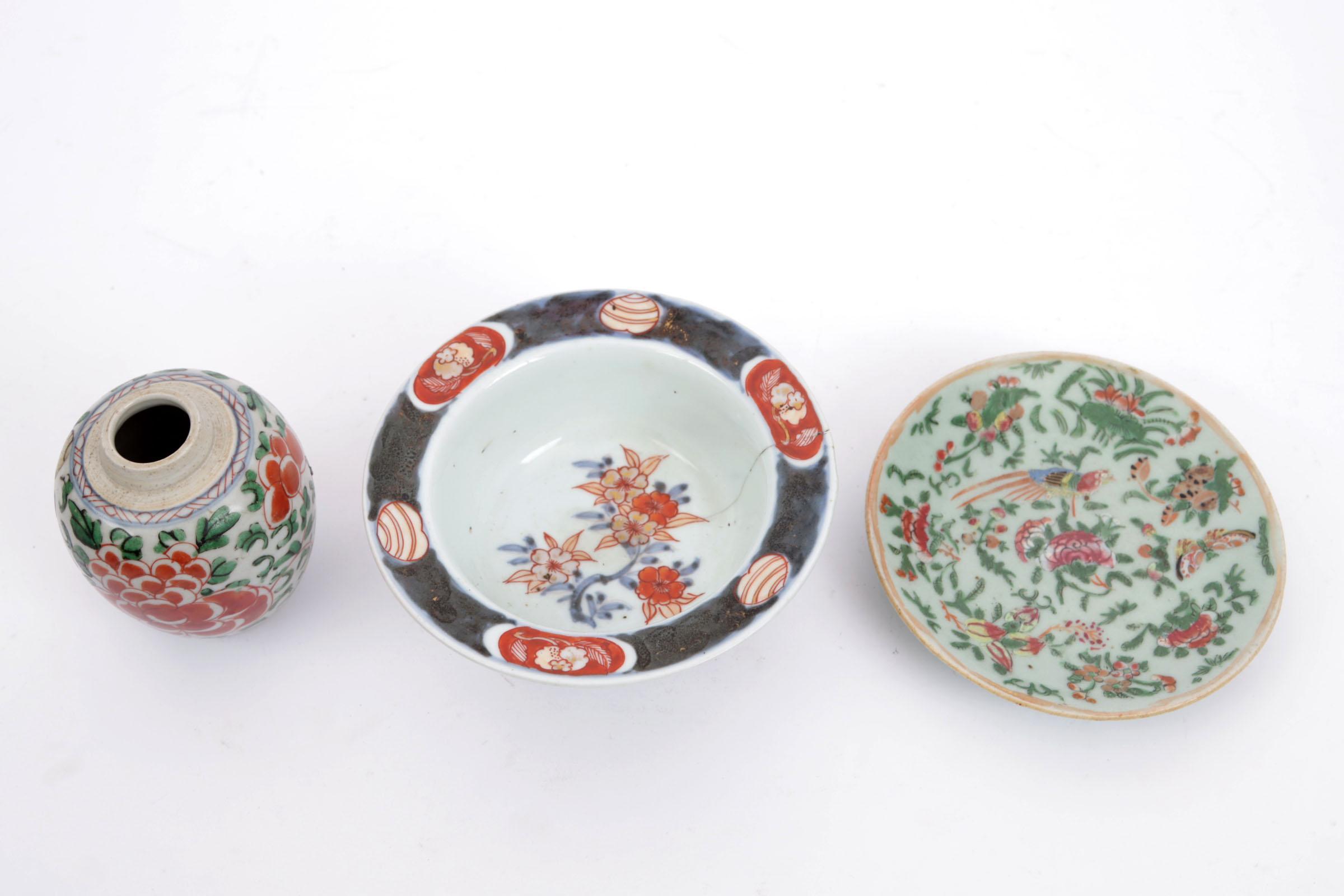 Koopje van een Chinees porseleinen vaasje en bordje en een Imari kwispedoor