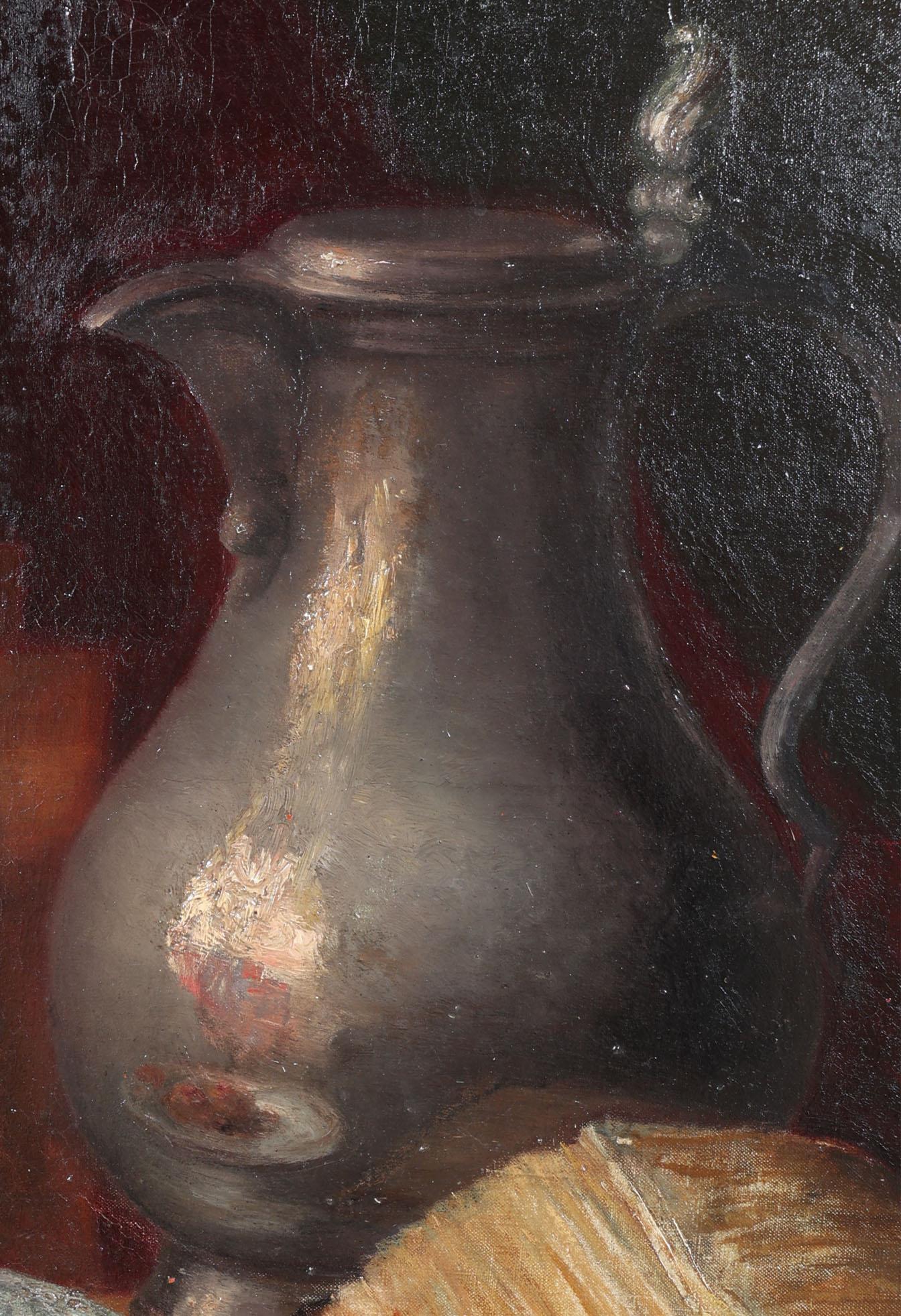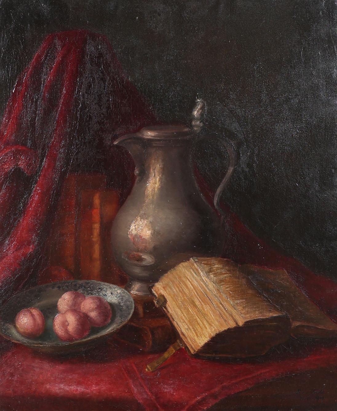 B. van der Woude, Stilleven met boek en tinnen kan, olieverf op doek, 73 x 60 cm., gedateerd 1907