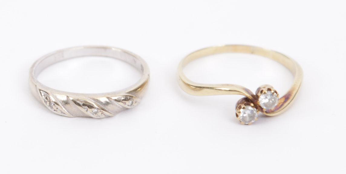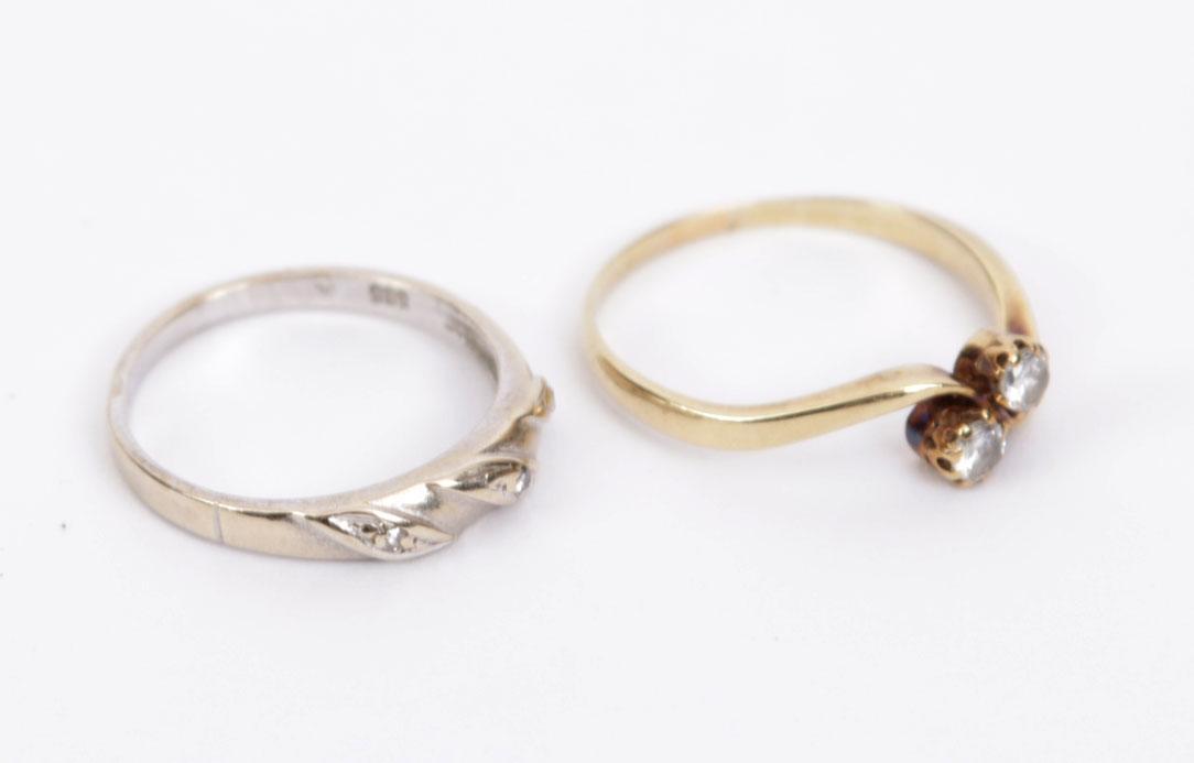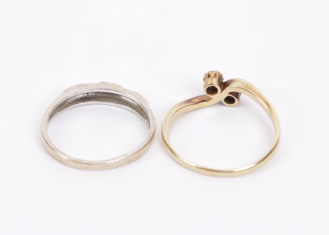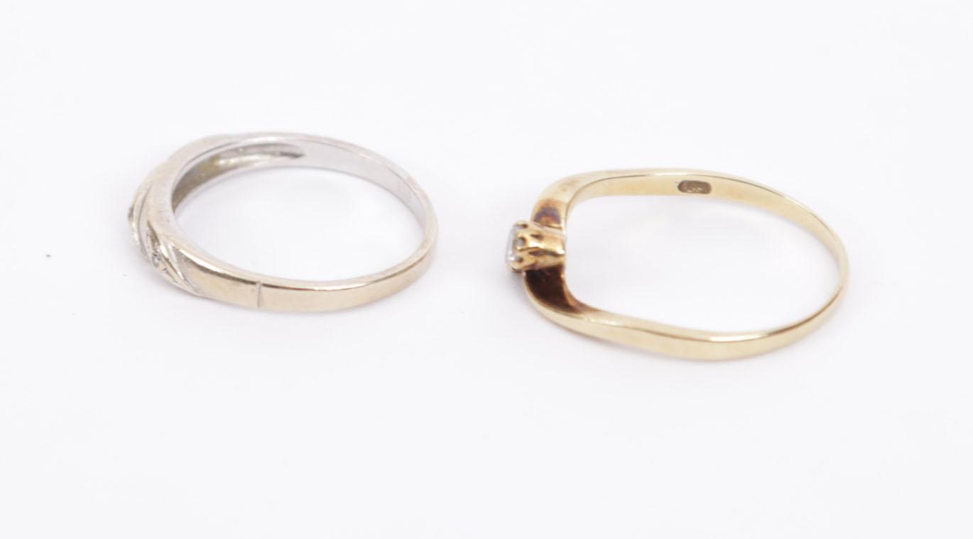 Twee 14 kt. gouden ringen : een bezet met briljant geslepen diamant en een bezet met zirkonia, 4,1 gram, rm 17 en 18