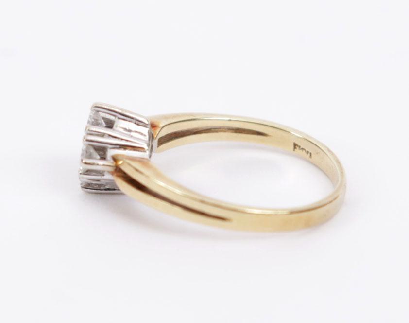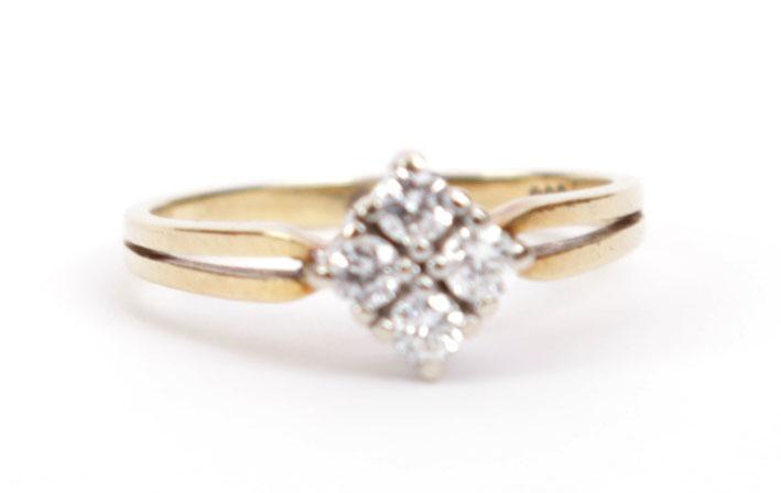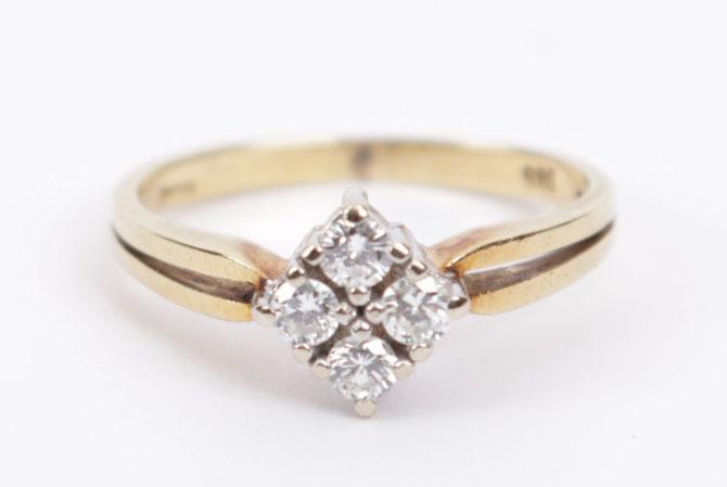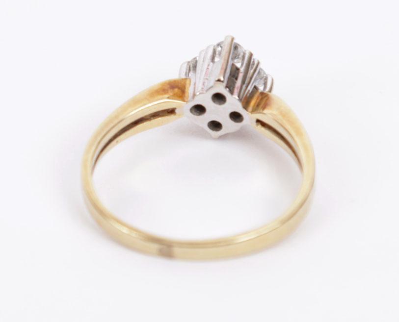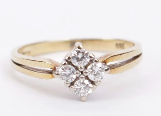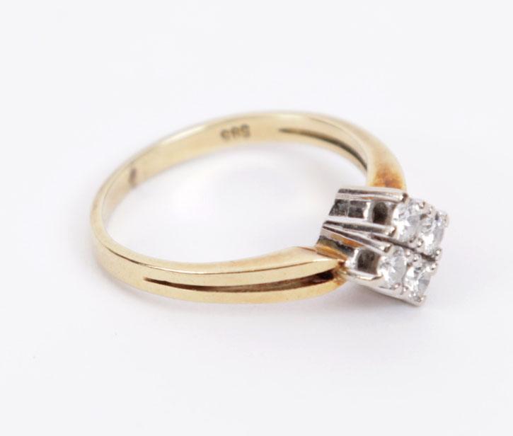 14 Kt. wit met geelgouden ring bezet 4 briljant geslepen diamanten, 3 gram, rm 16,5