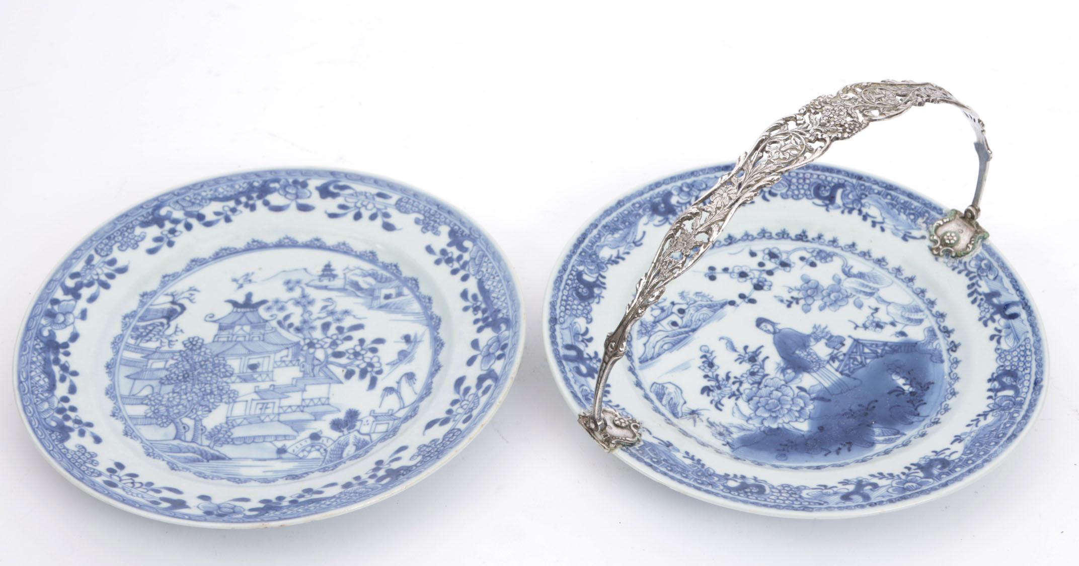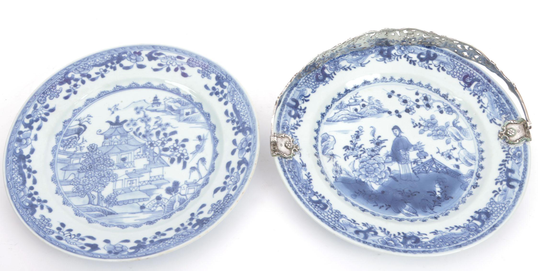 2 Blauw/wit gedecoreerde Chinees porseleinen borden w.o. een met zilveren beugel, diam.23 cm.