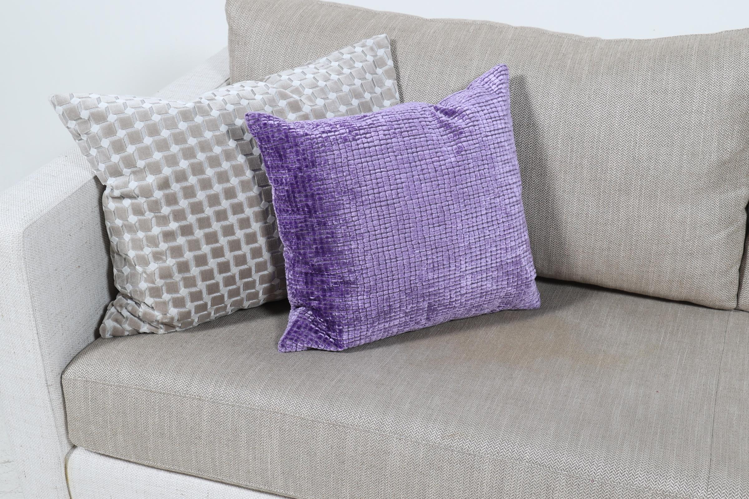 Modern wit met beige-kleurige bank met blank houten poten, h.64 x b.217 x d.95 cm. (vlek in zitting)