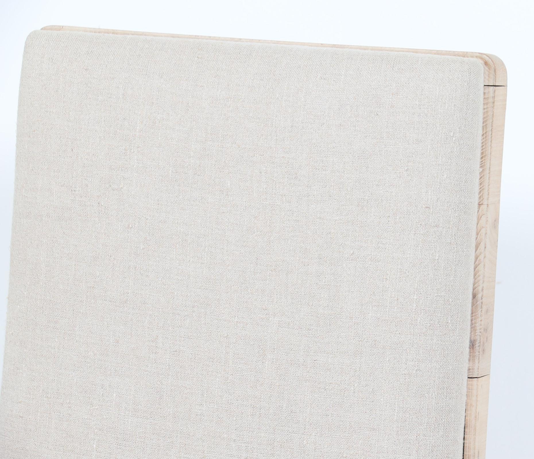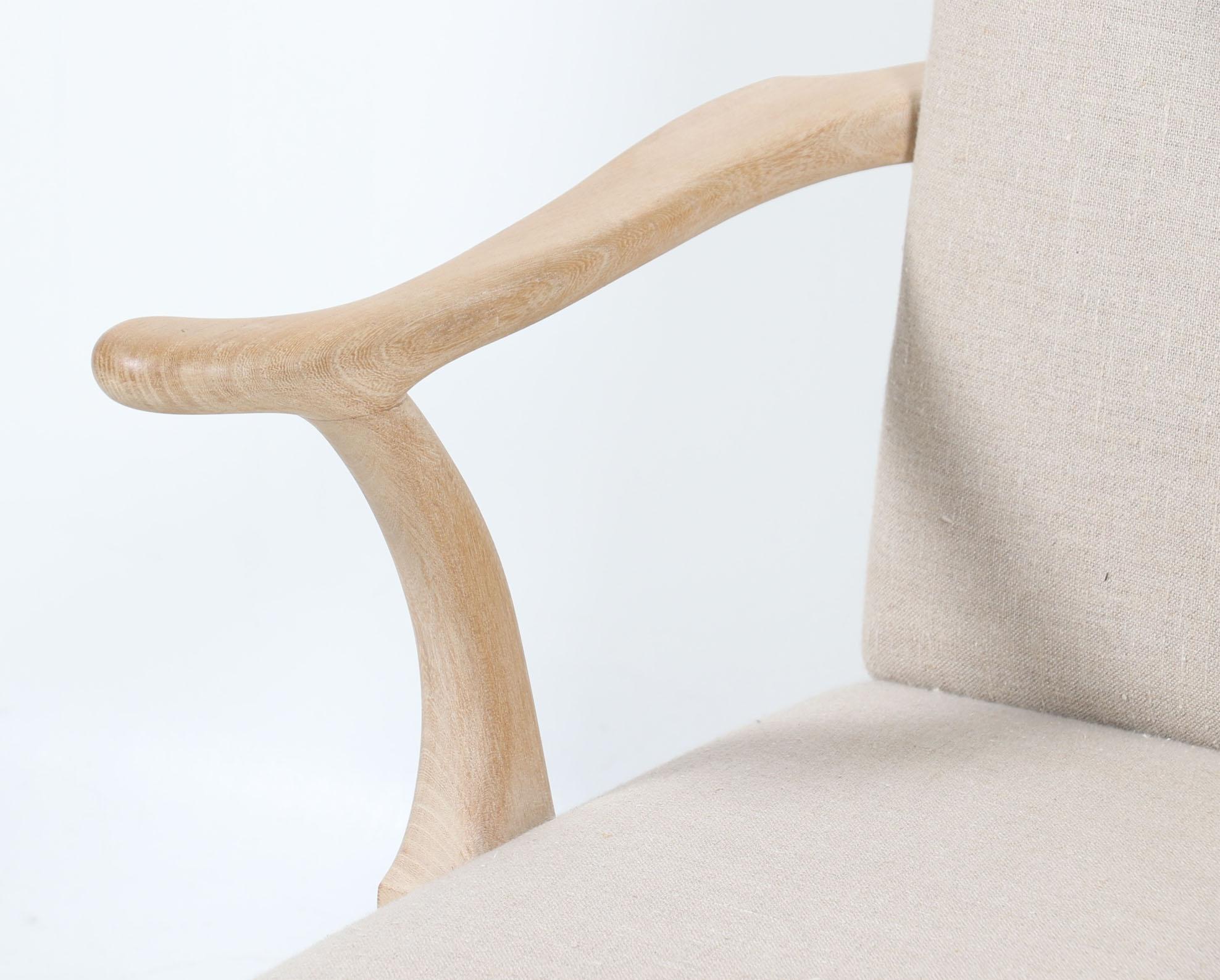 Blank houten stoel met armleuningen en beige stoffering in klassieke stijl