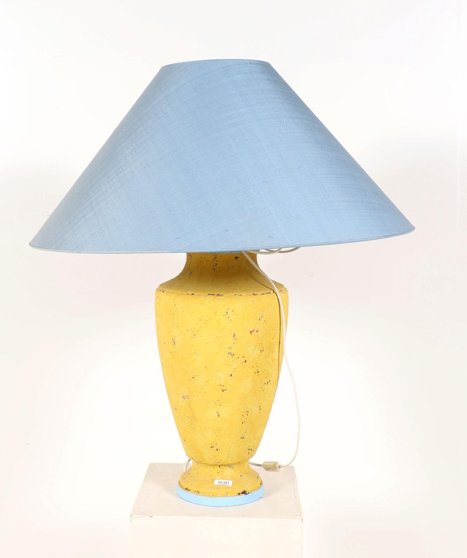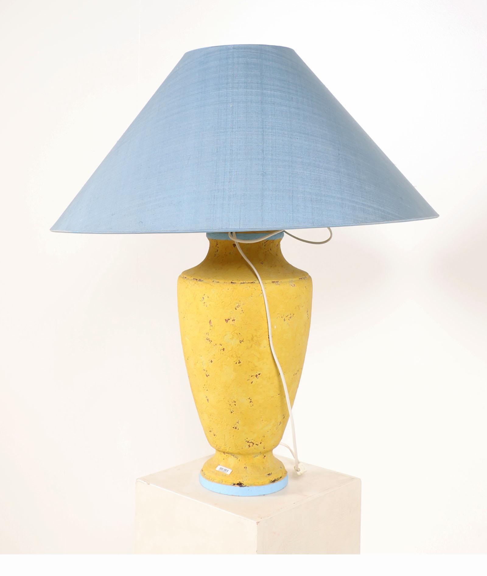 Geel keramieken lampvoet met blauwe kap, h.80 cm.