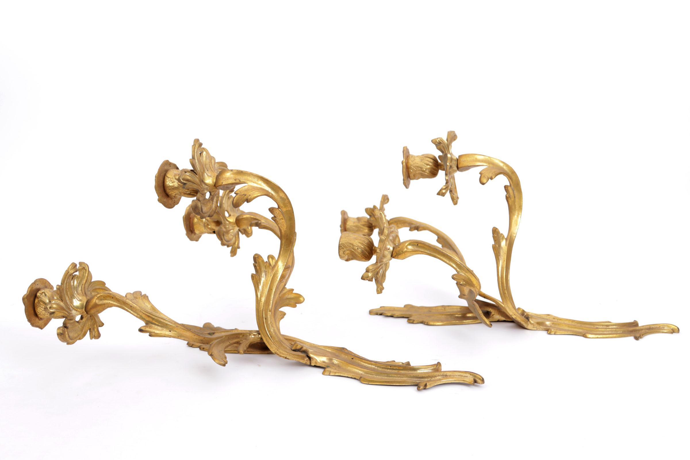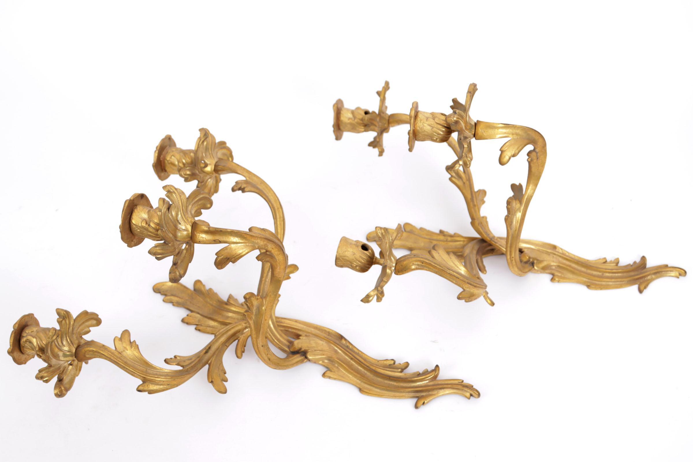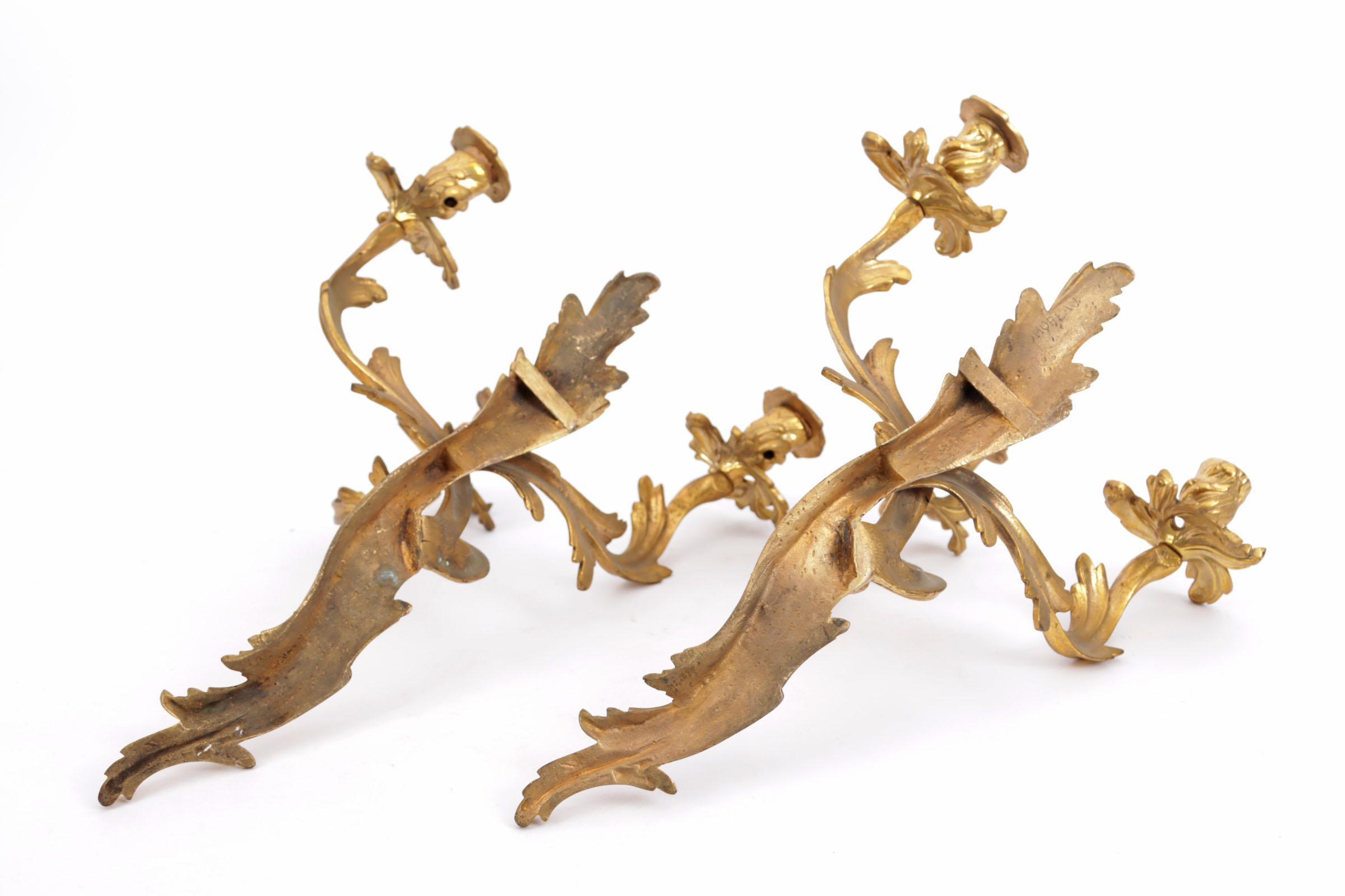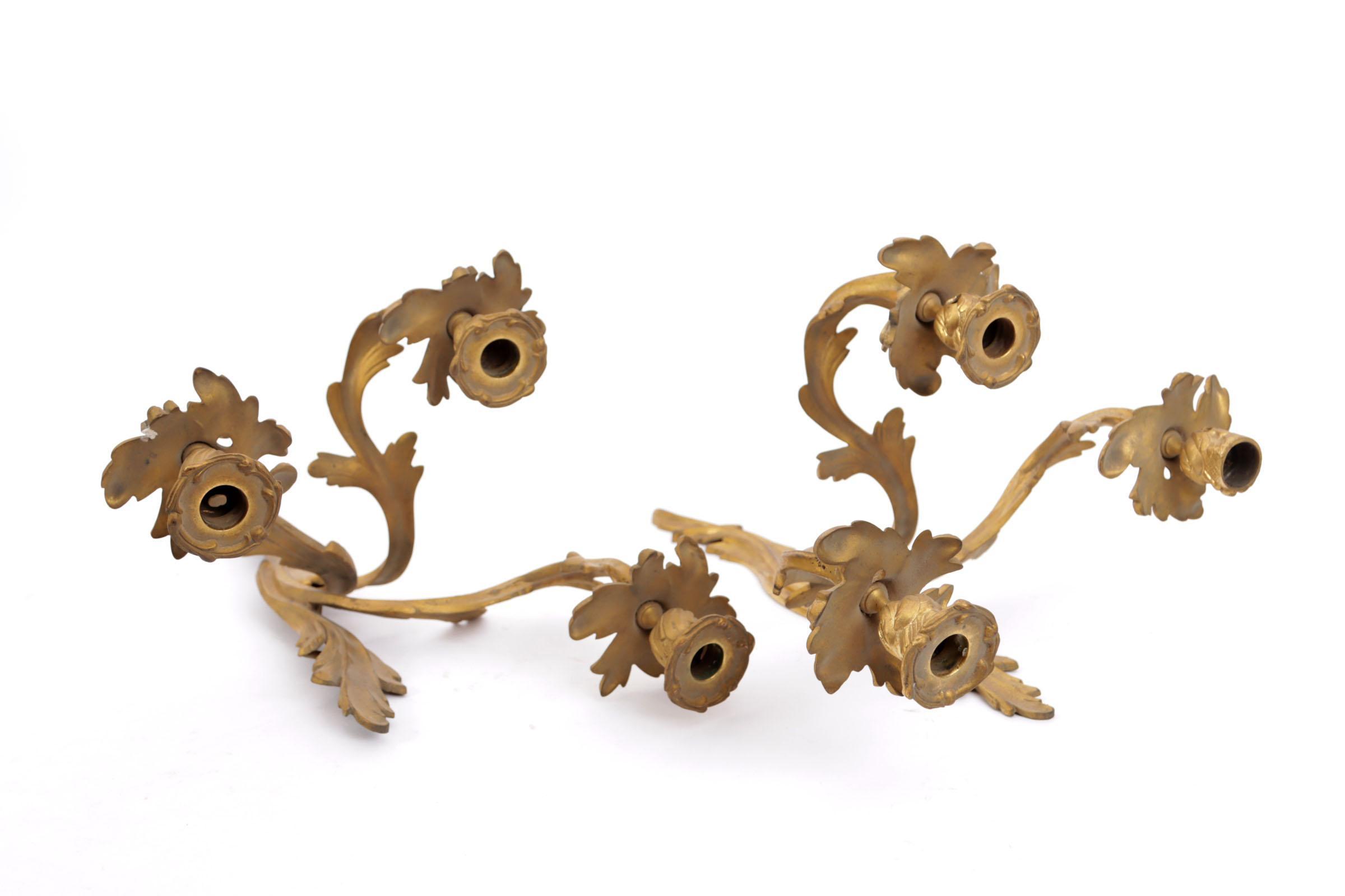 Stel messing 3-lichts wandkandelaars, gemerkt Moreau, (doorboord voor elektra en één bobeche ontbreekt