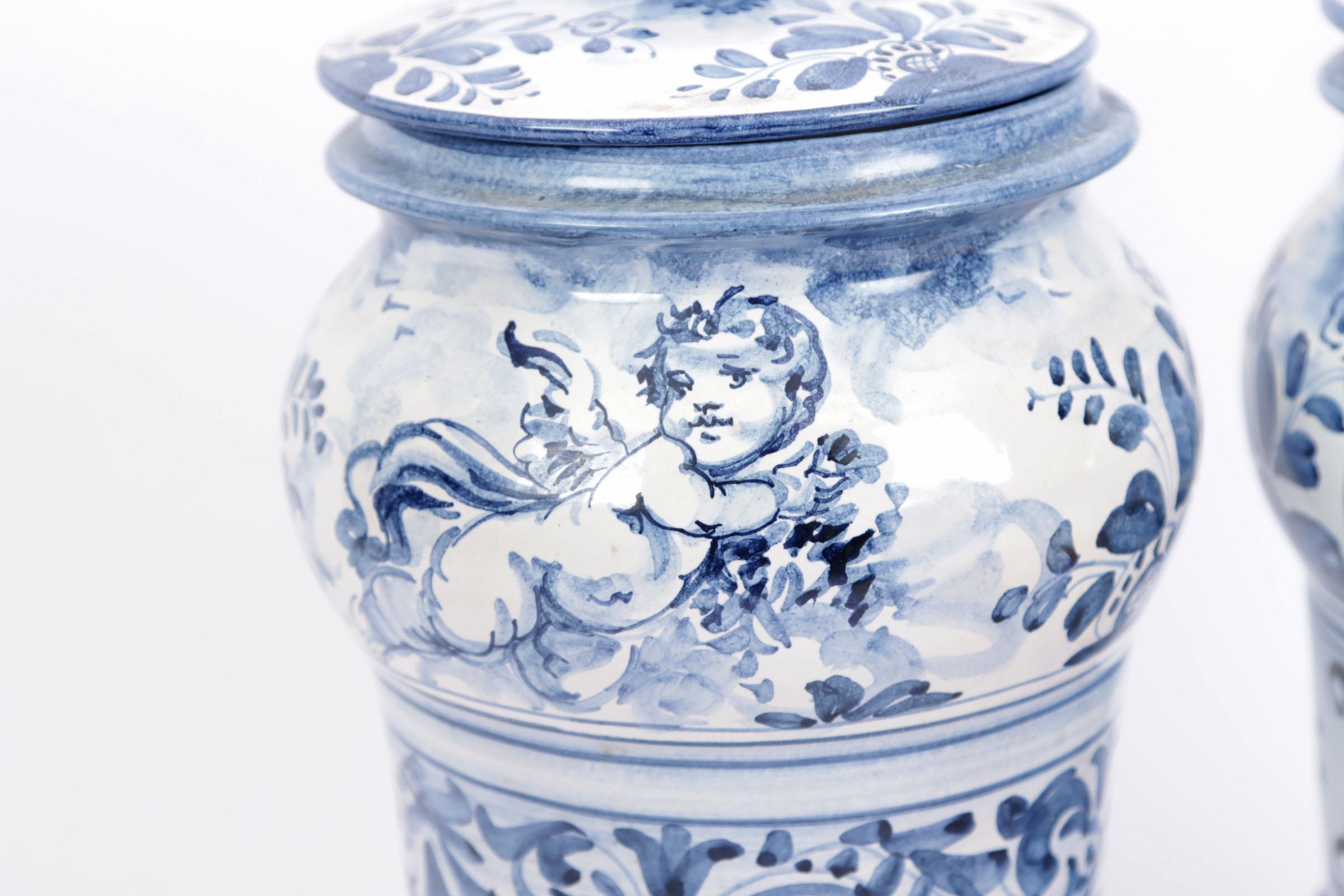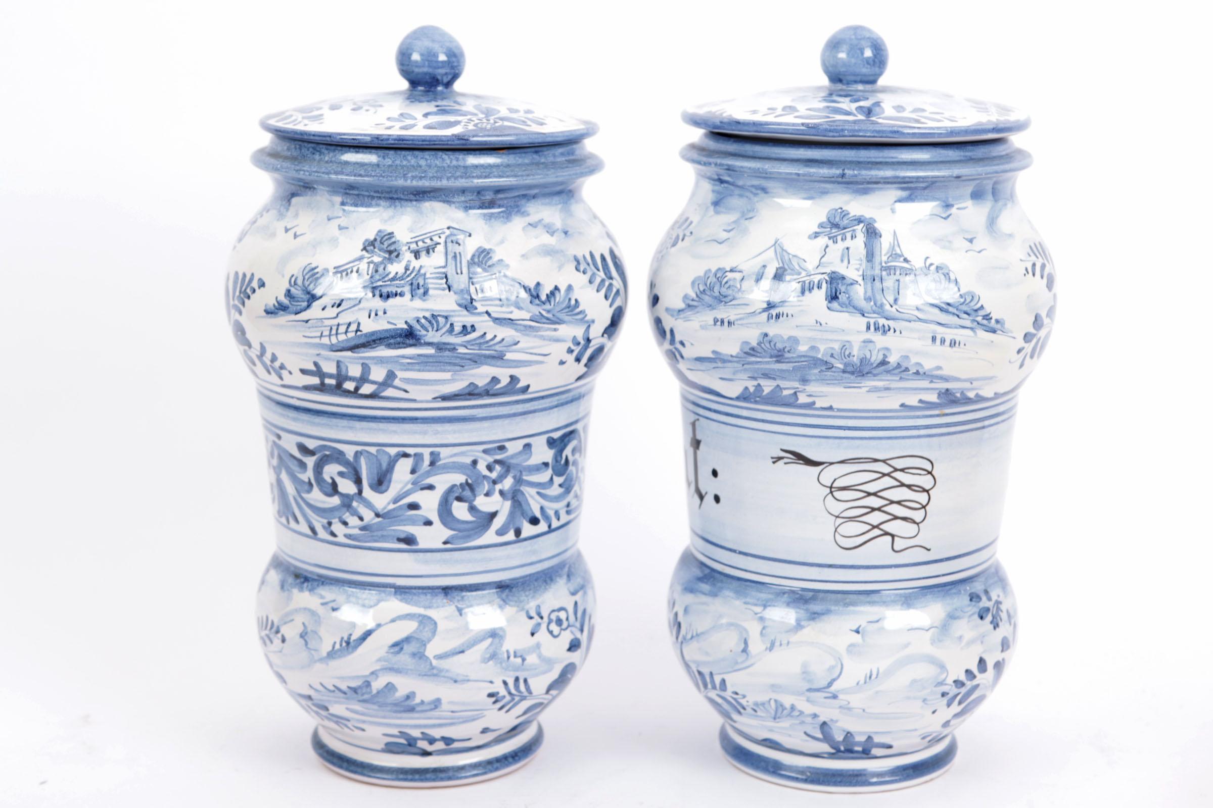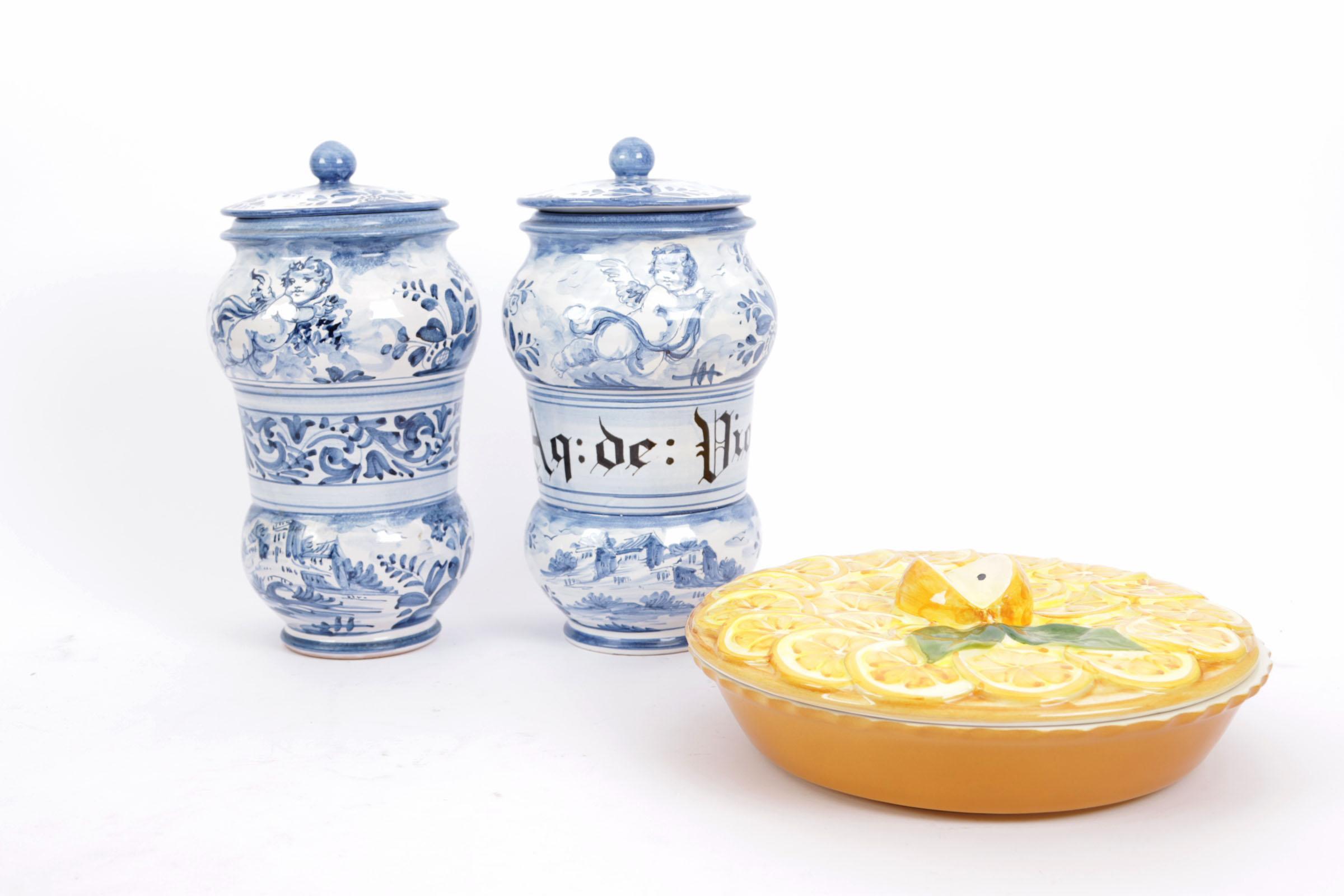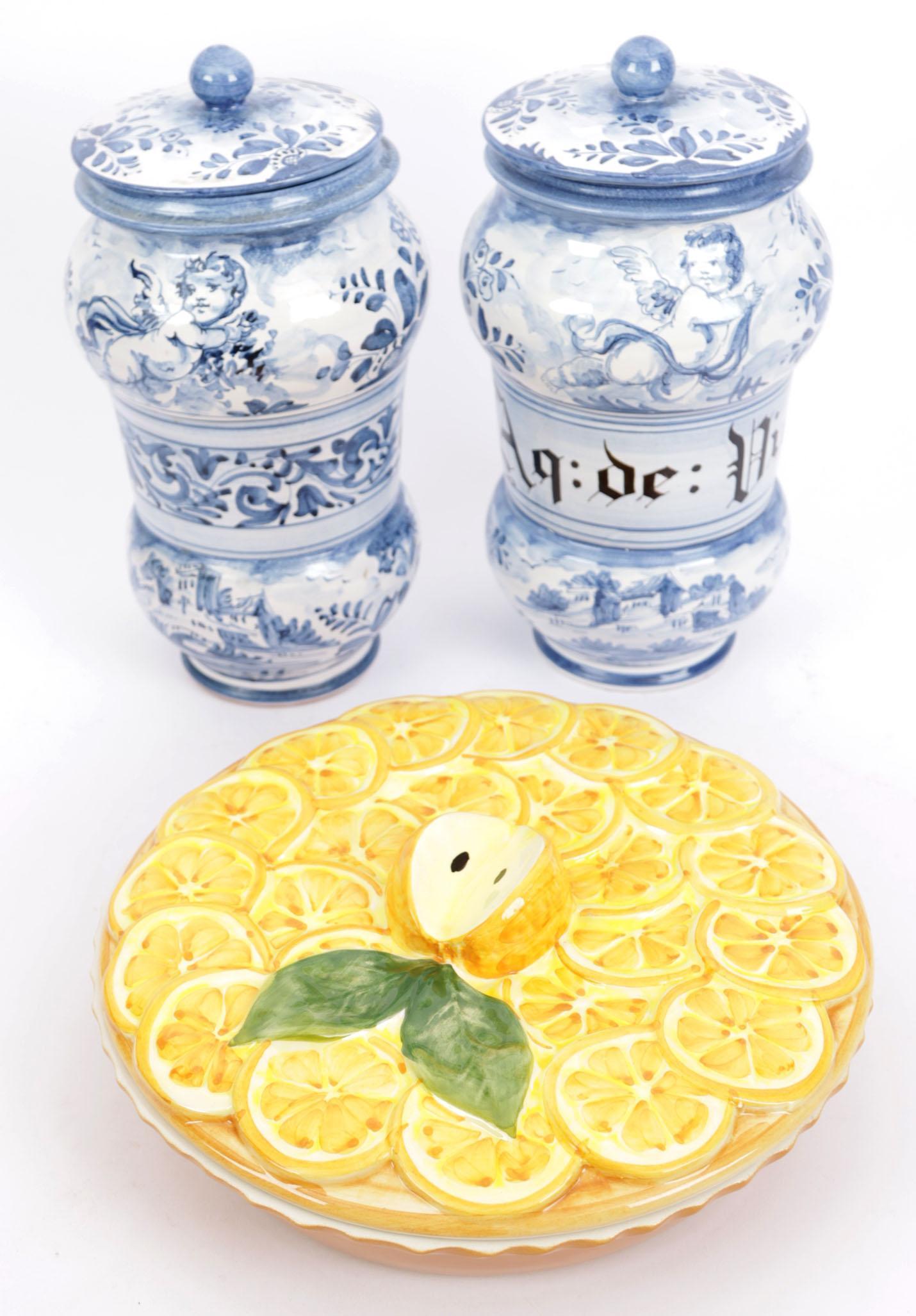 Stel blauw/wit aardewerken dekselpotten en een schaal met citroenen op de deksel