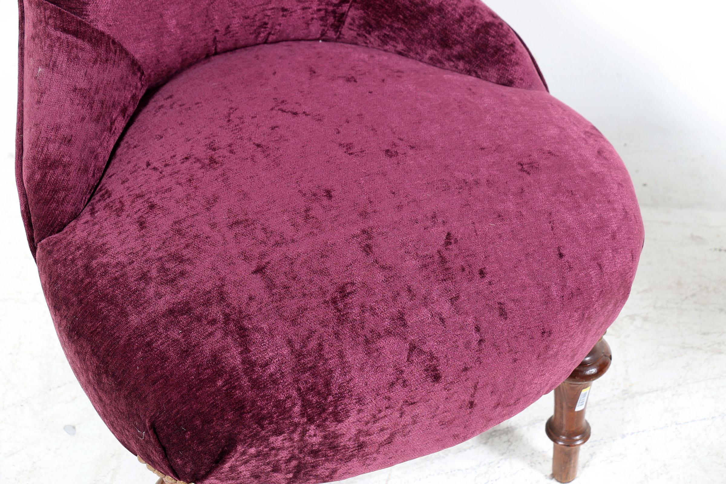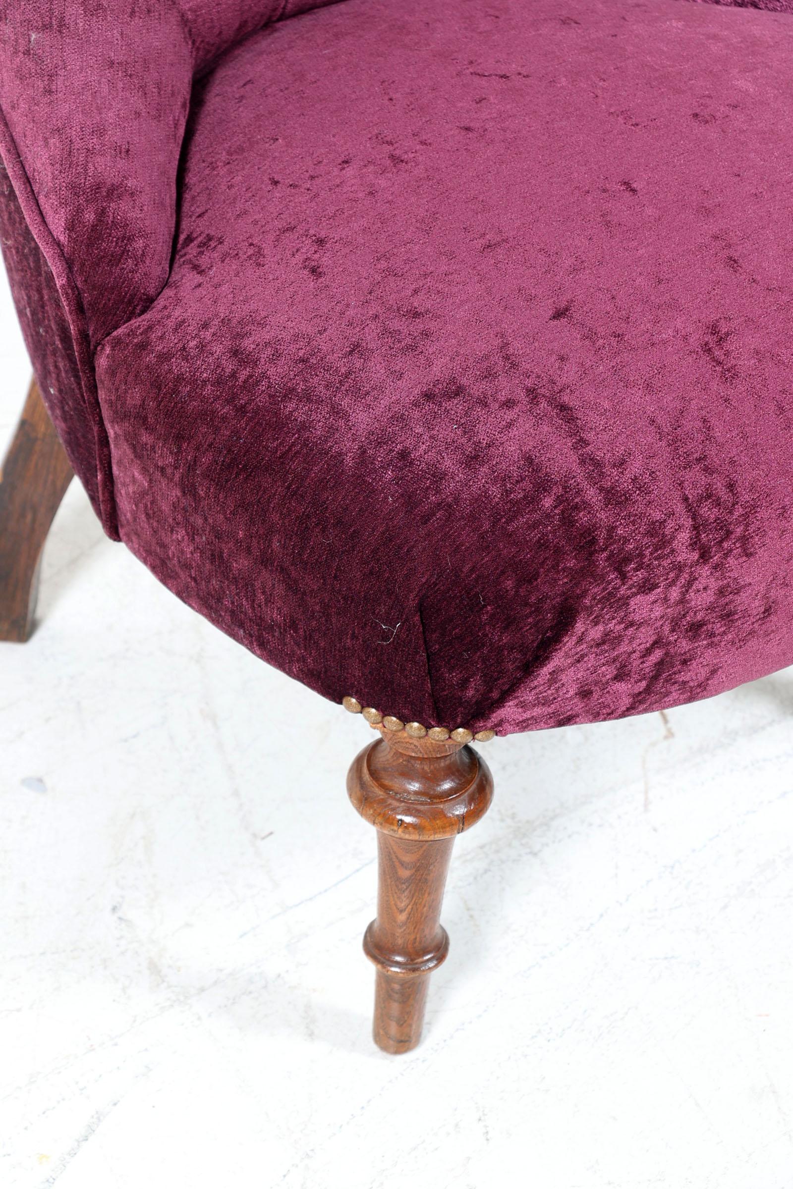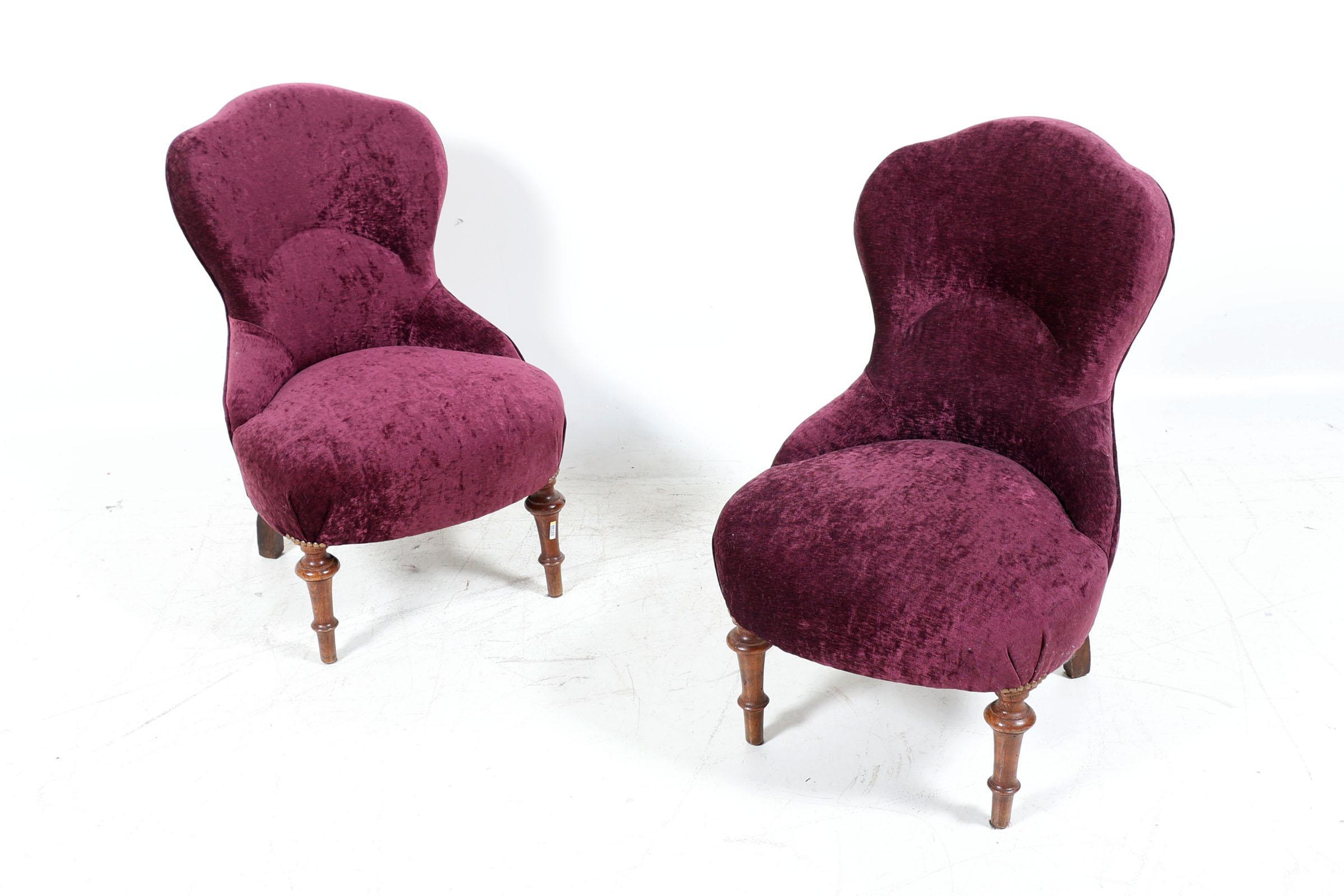 Set van 2 breistoeltjes op notenhouten poten en met paars velours gestoffeerd