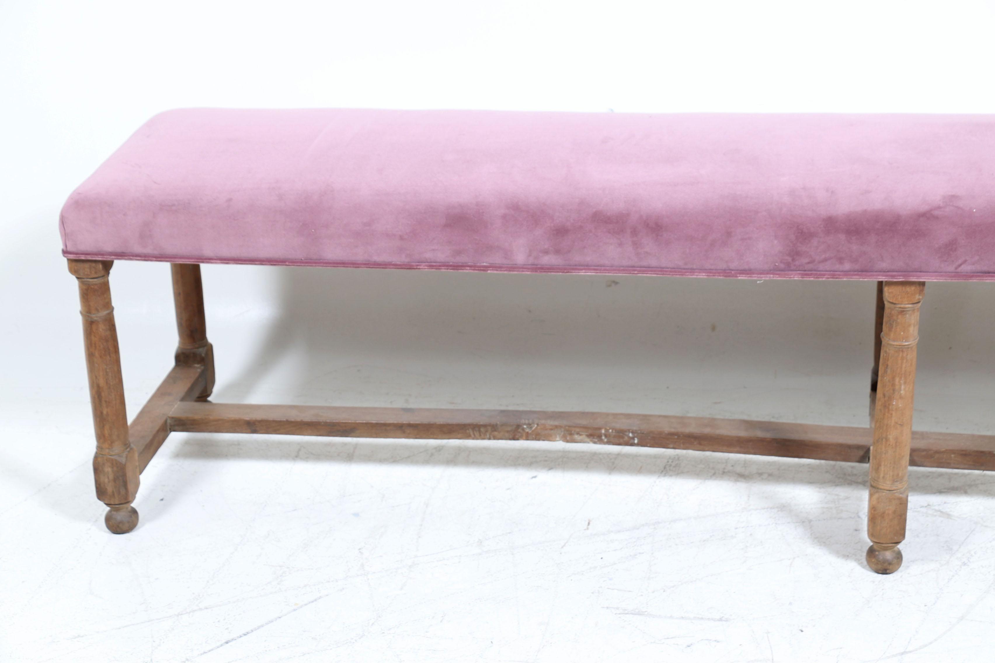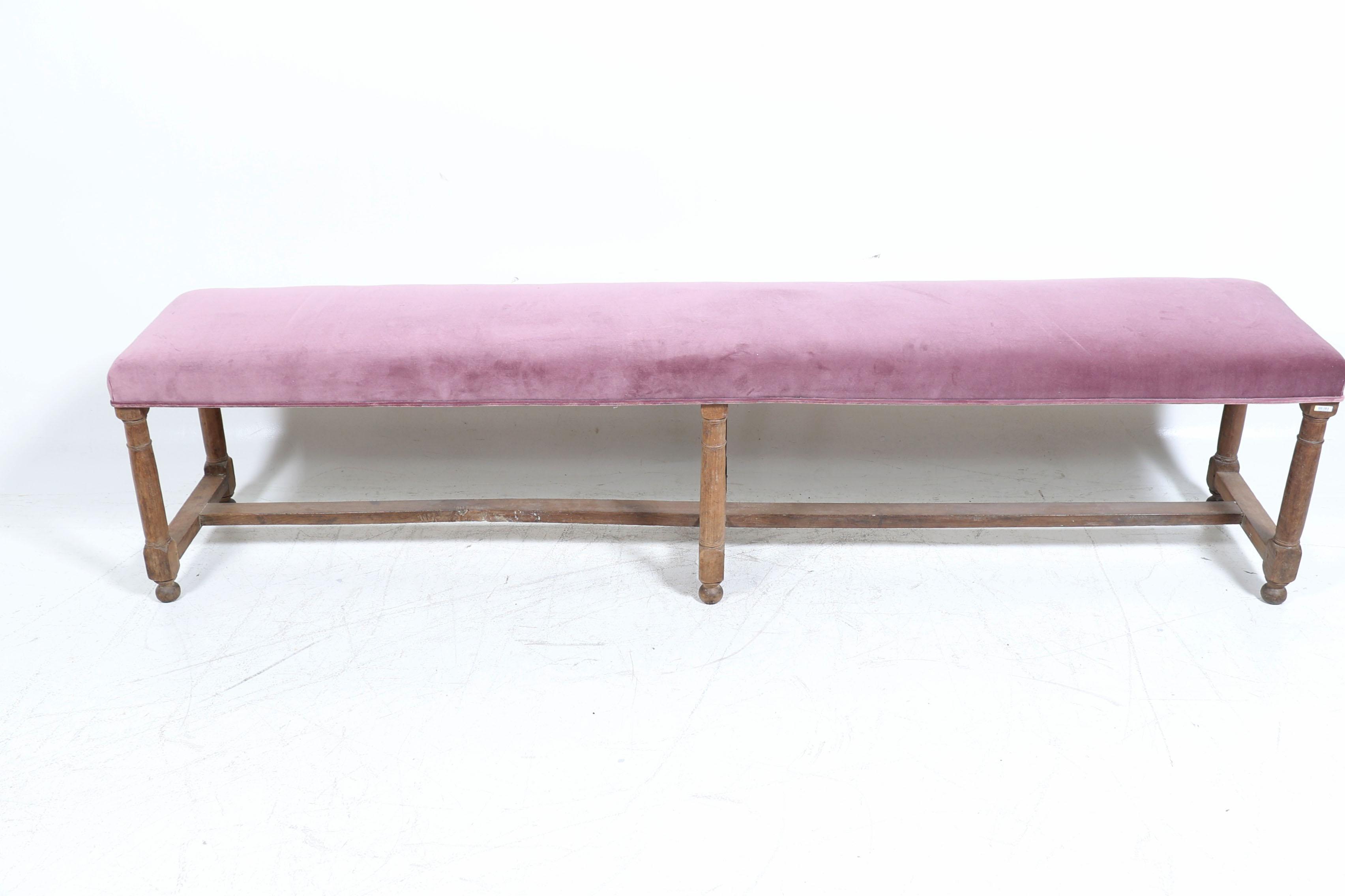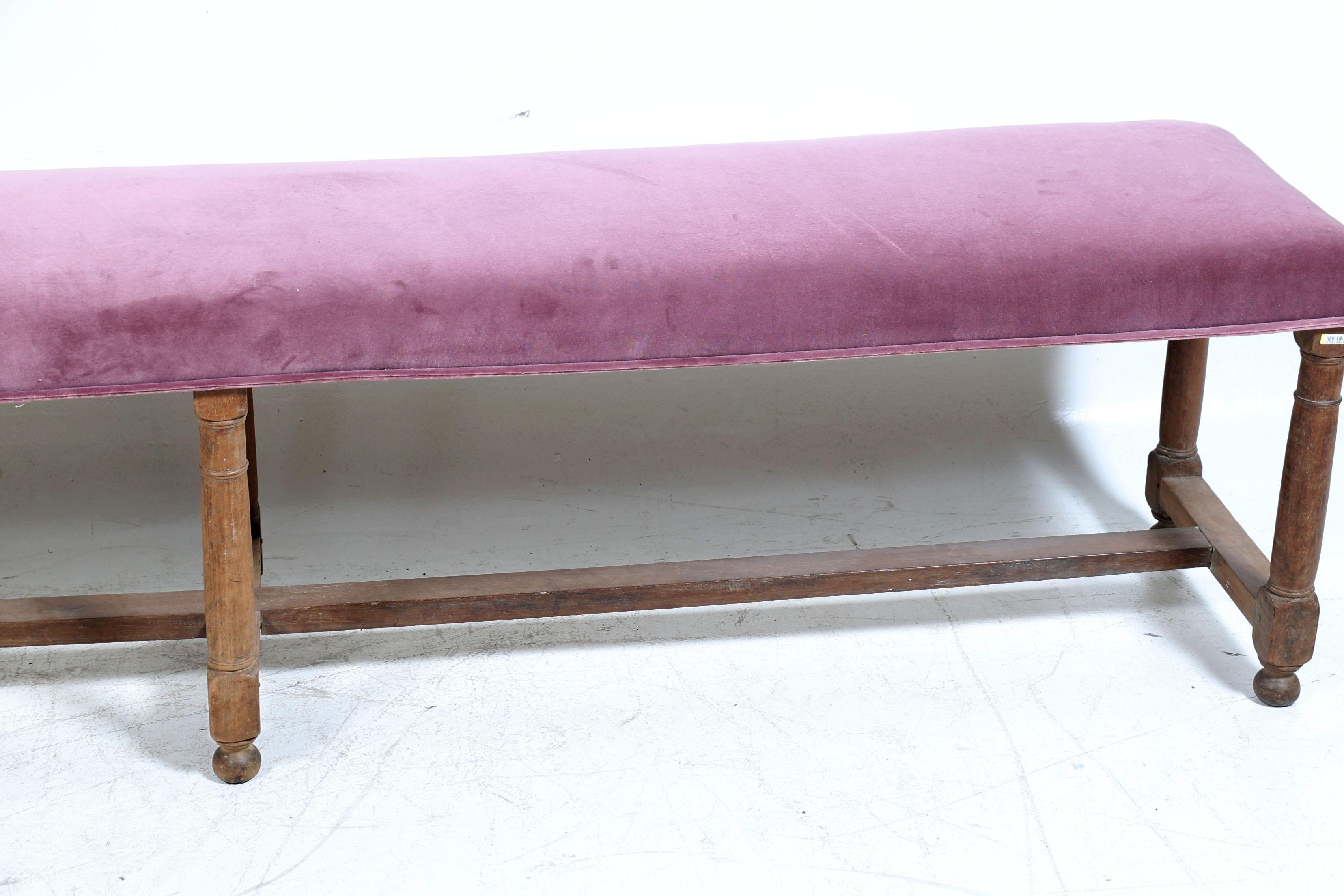 Antieke halbank op eikenhouten onderstel en met paars velours gestoffeerd, h.57 x b.230 x d.45 cm.