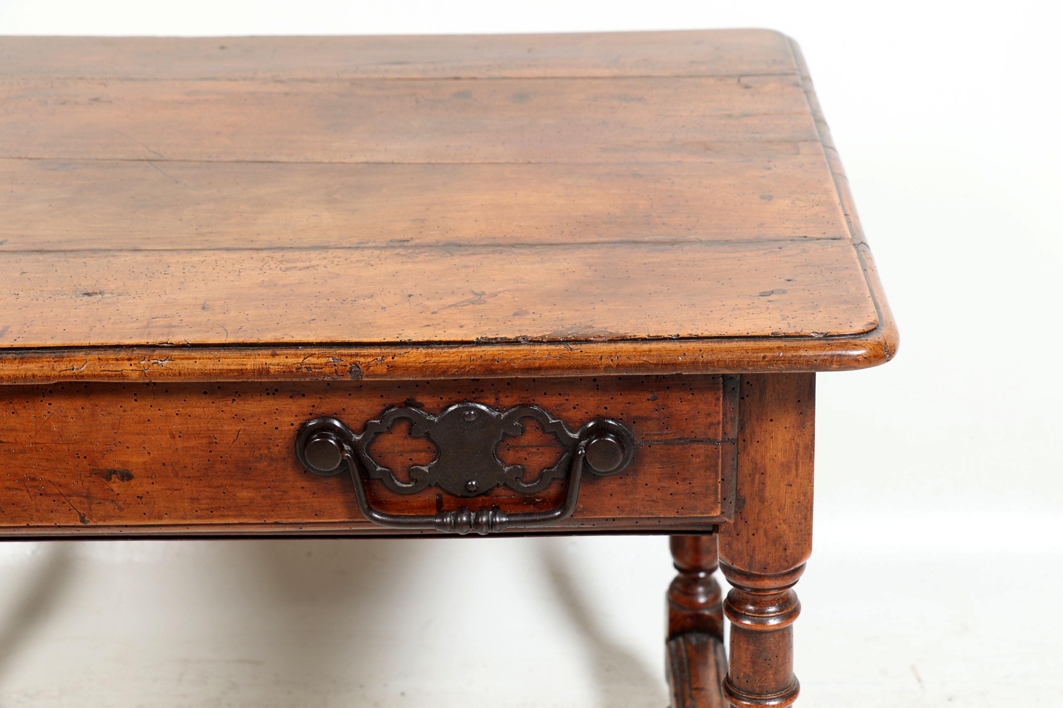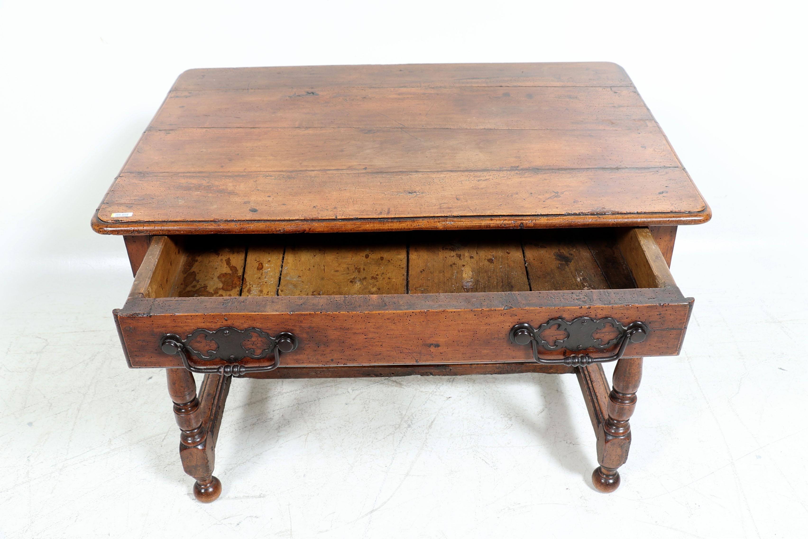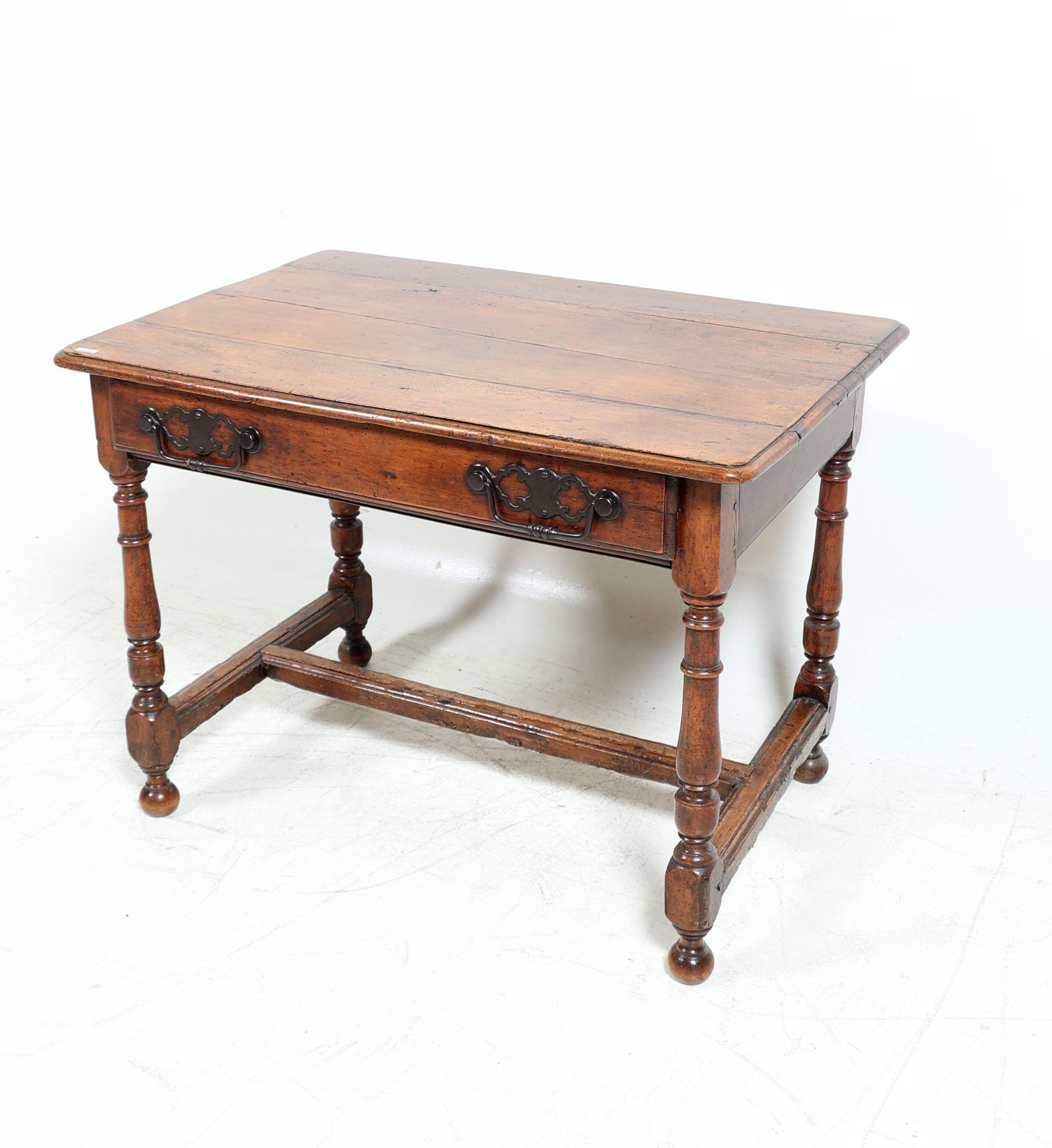 Antieke notenhouten tafel met laden en rustend op onderstel verbonden met regel, h.72 x b.99 x d.67 cm.