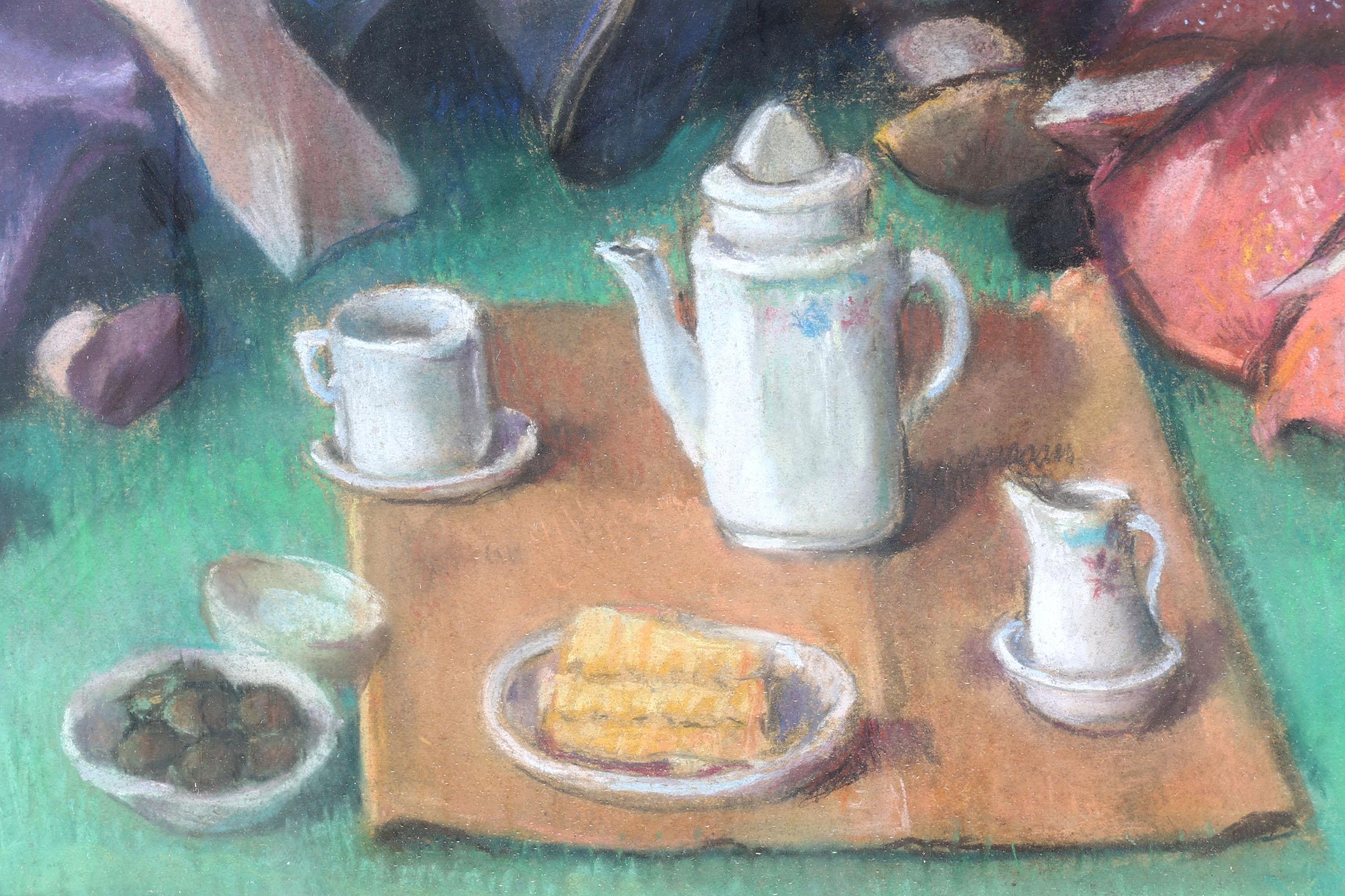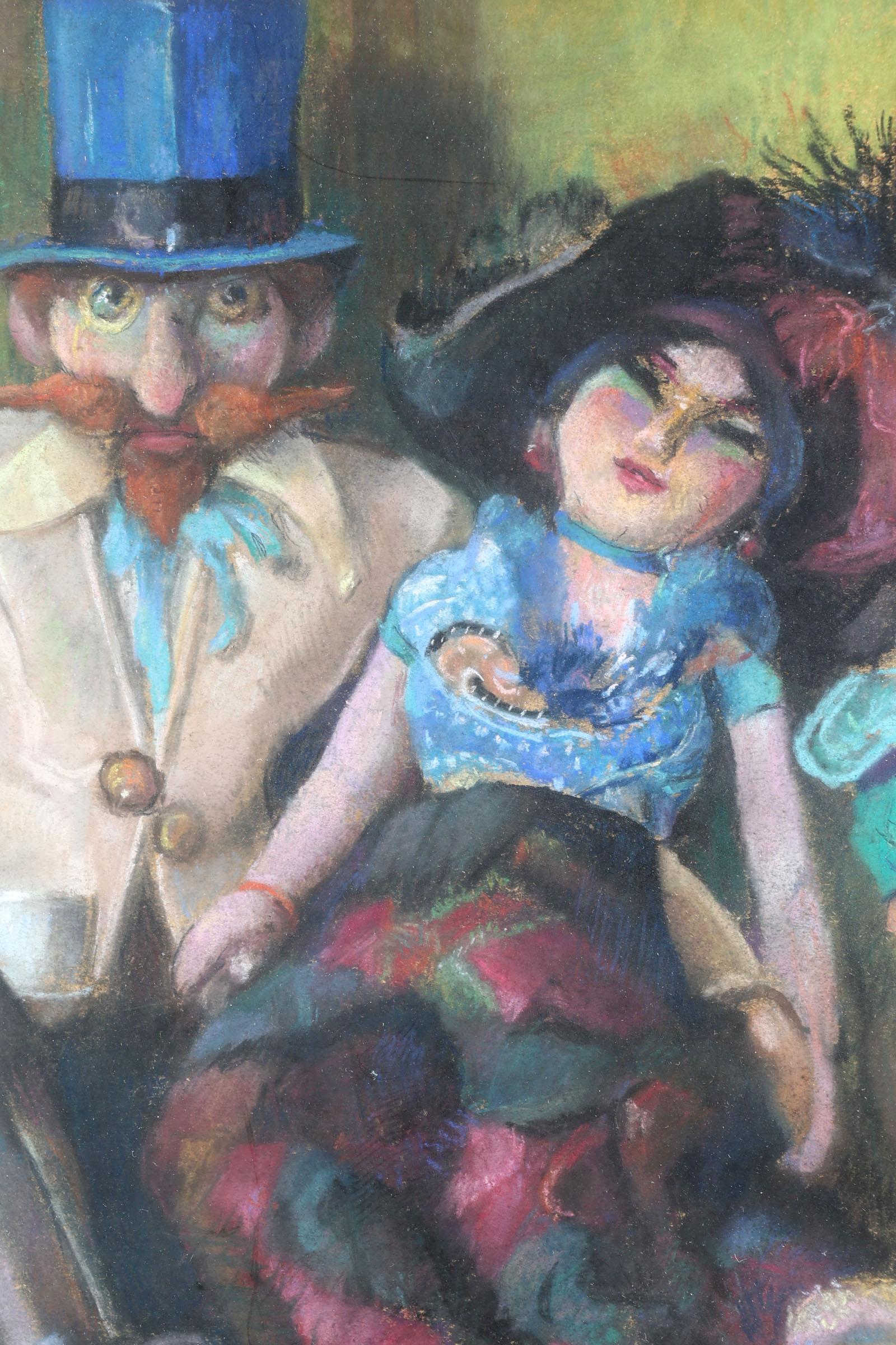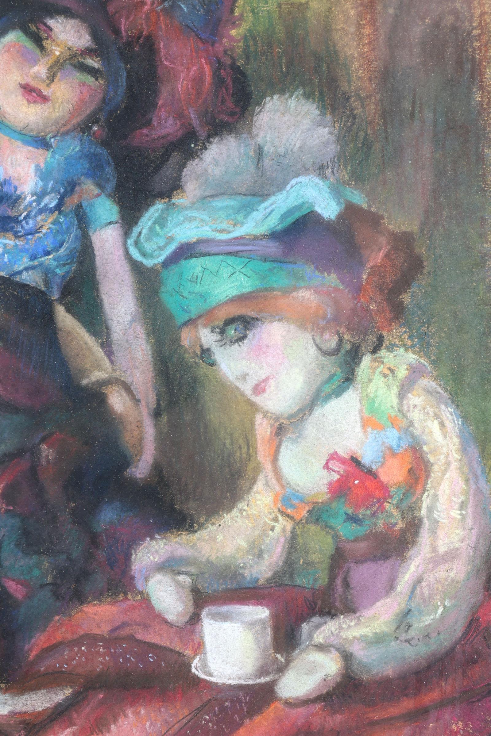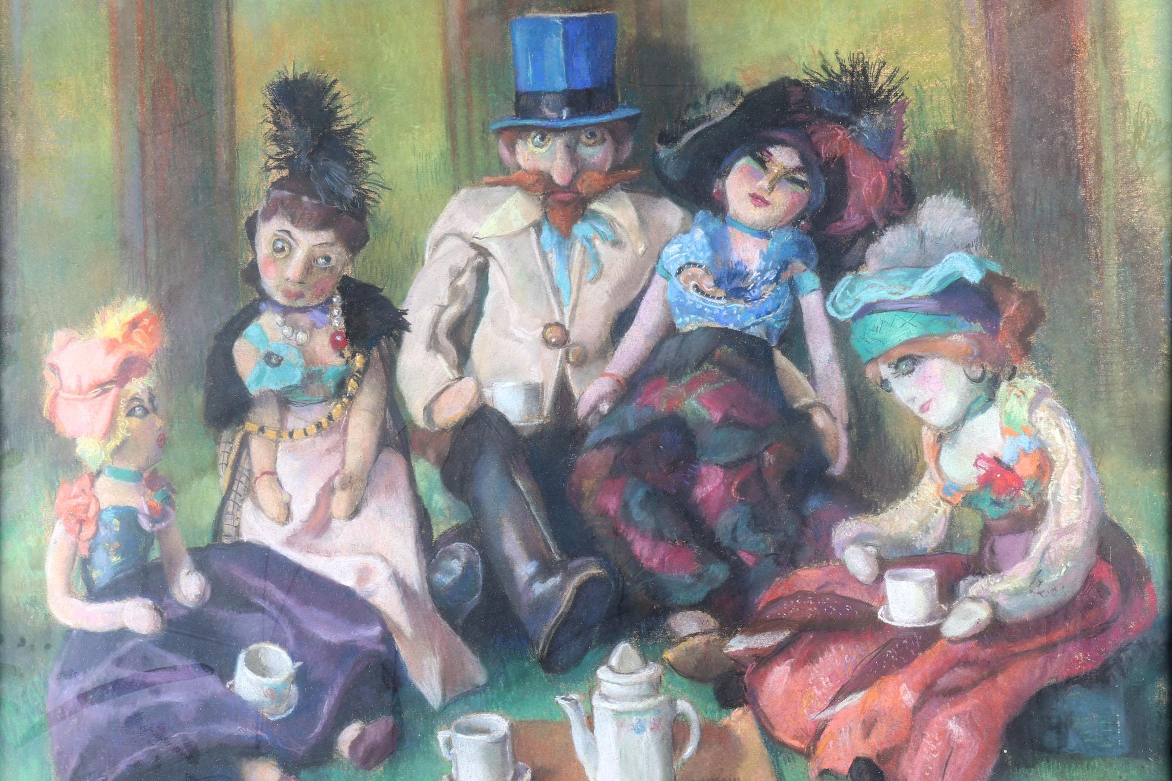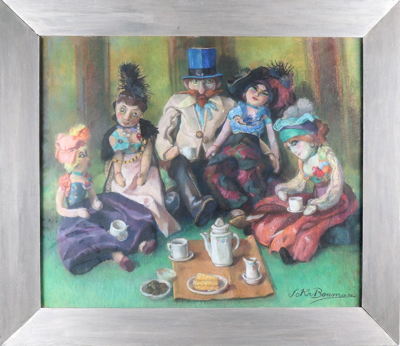 Jo Kruyder-Bouman (1886-1973), Vijf poppen in interieur, pasteltekening, 73 x 62 cm.