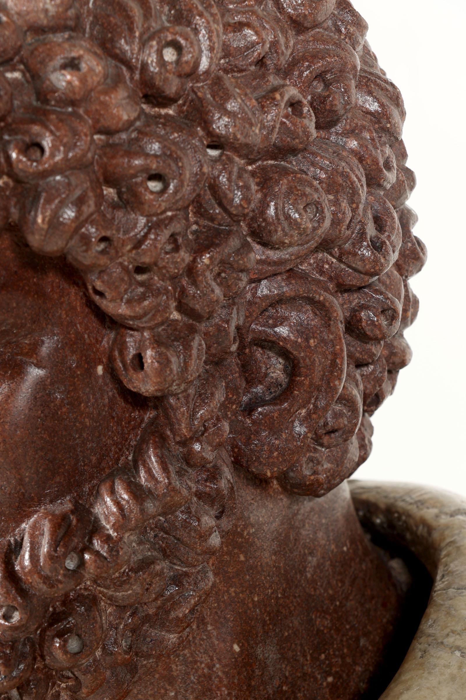 Antieke buste van een Romein, uitgevoerd in diverse soorten marmer en staand op een grijs houten presentatie sokkel, 18e/19e eeuw, h.67 cm of h.170 cm. (restauraties)