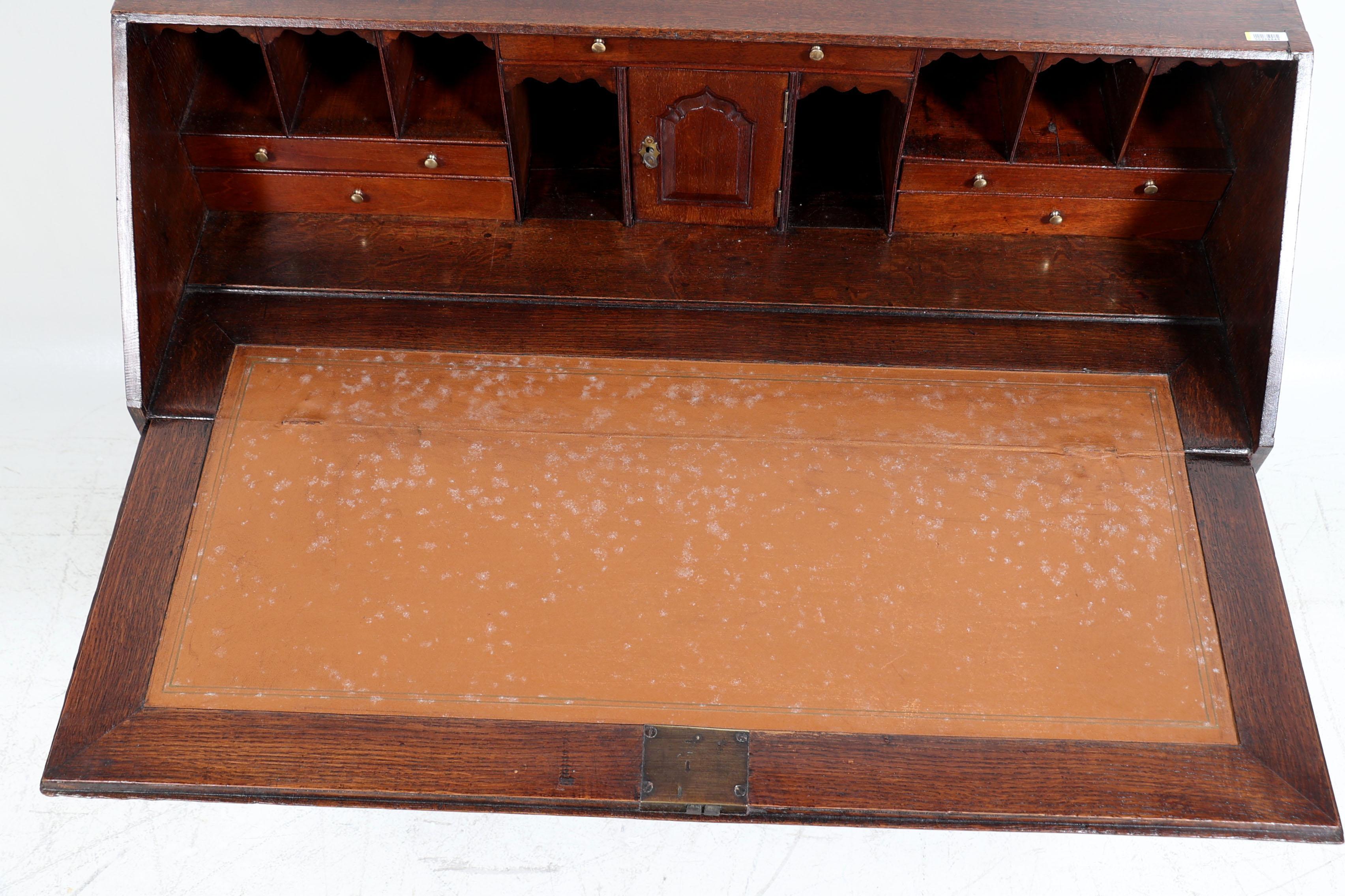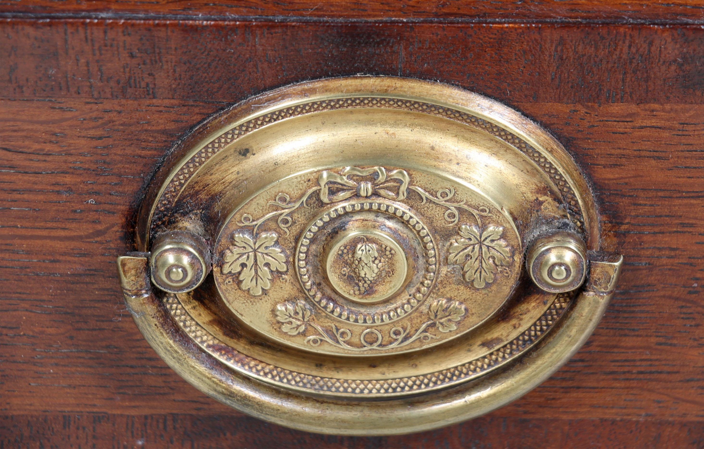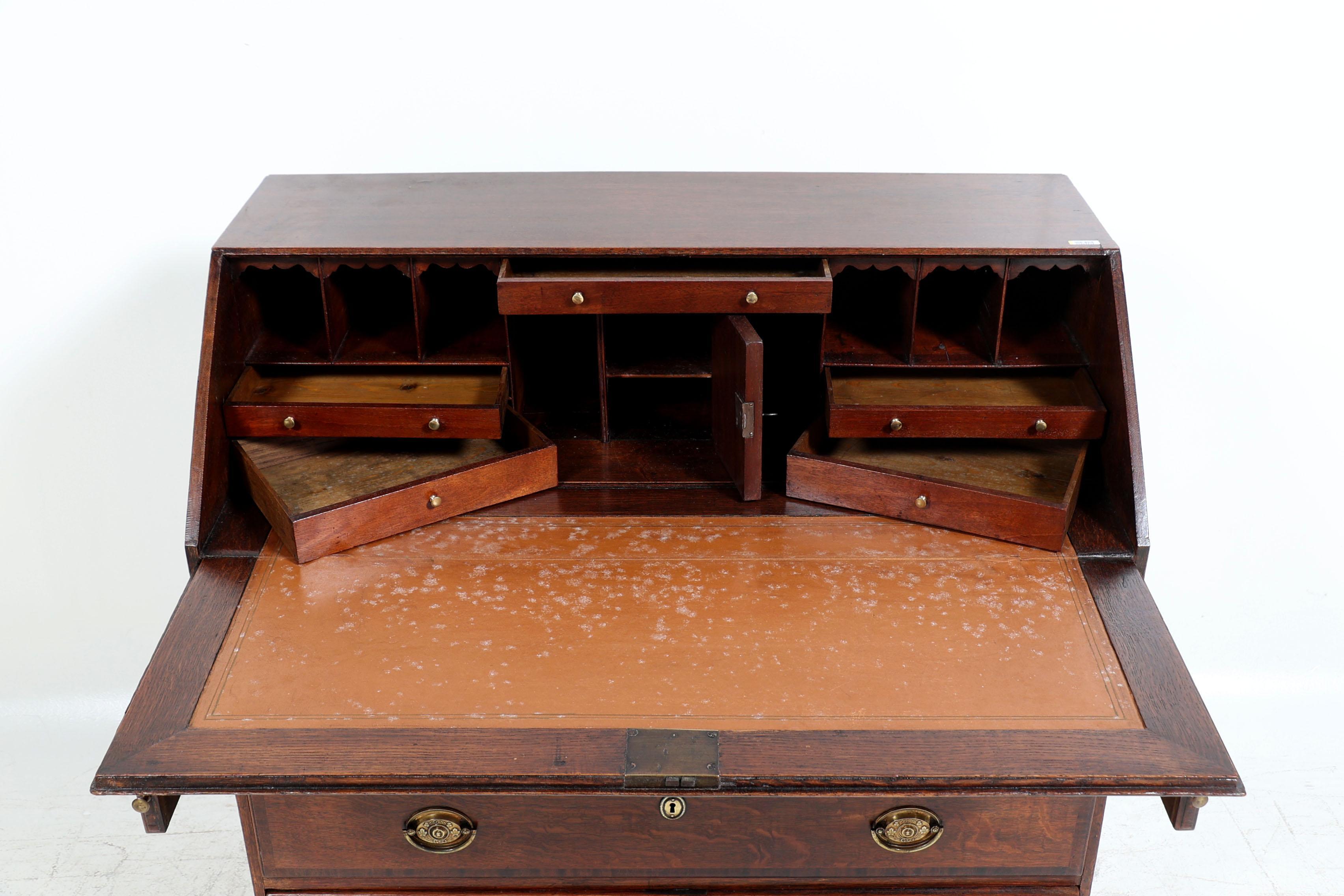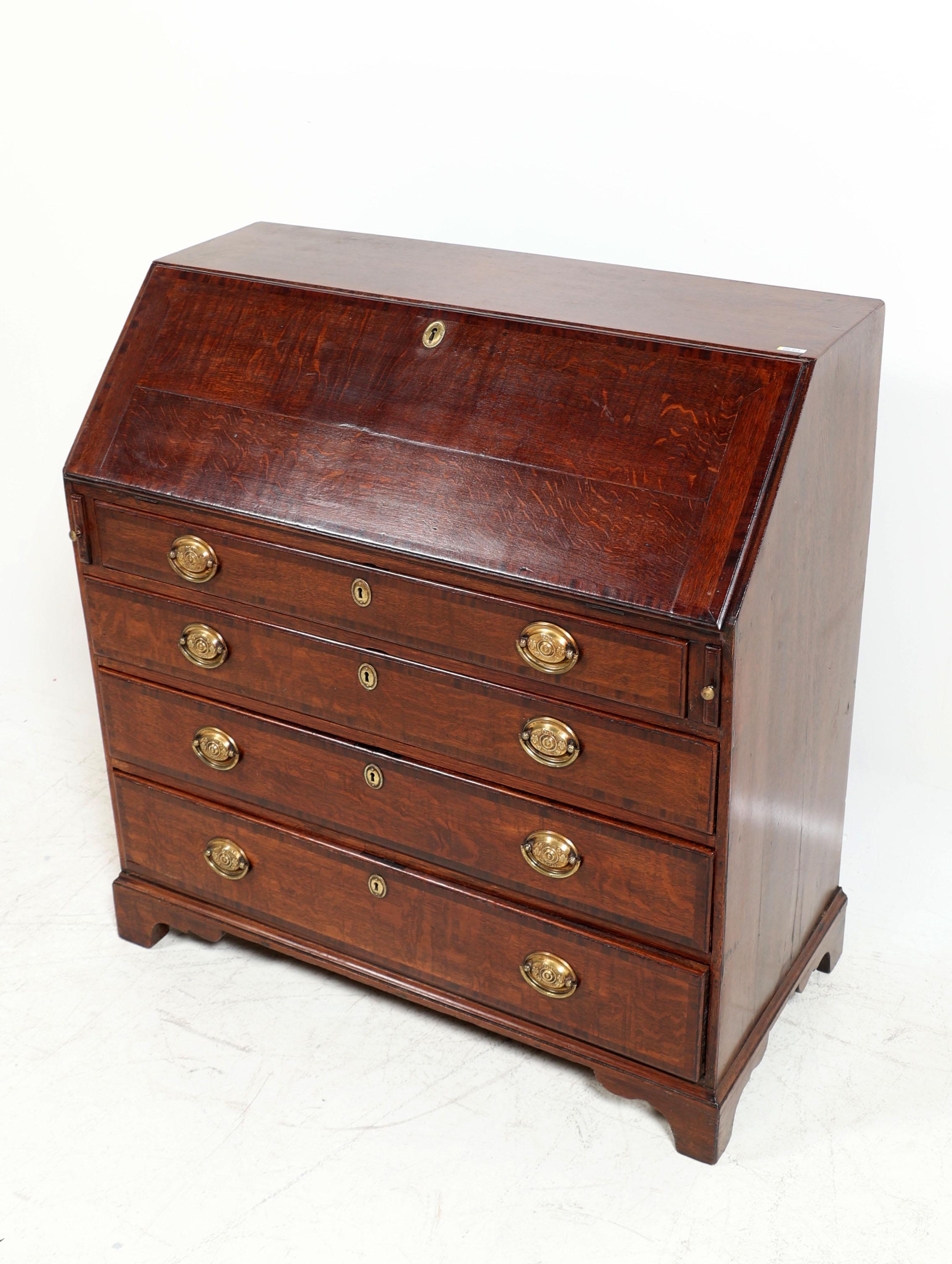 Antieke eikenhouten Engelse secretaire met 4 laden en koperen beslag, h.101 x b.97 x d.49 cm.