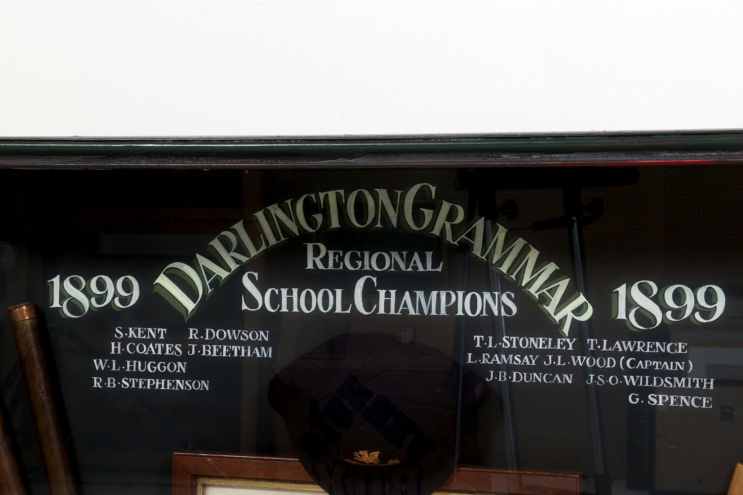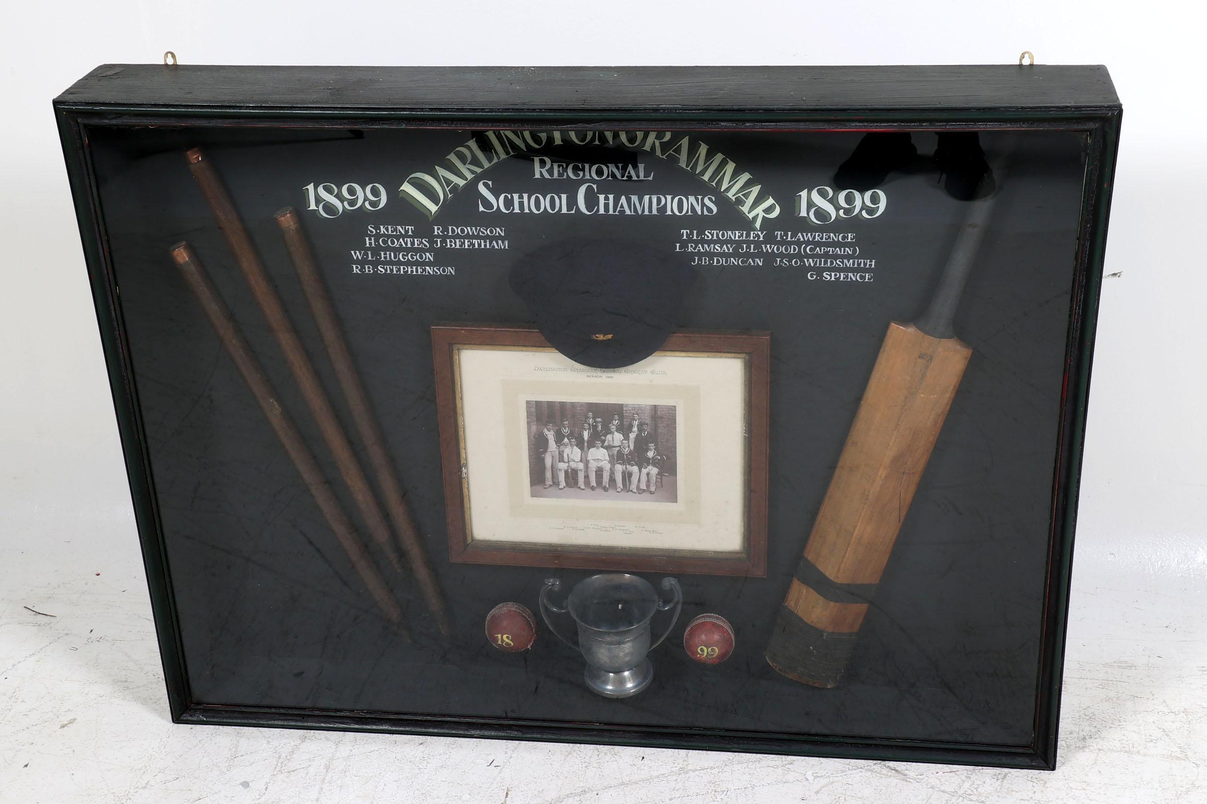 "Darlington Grammar 1899" Engelse wandvitrine/herinneringsbord met cricket artikelen, 90 x 120 cm.