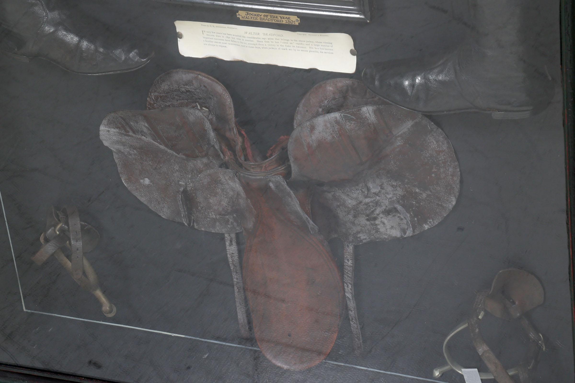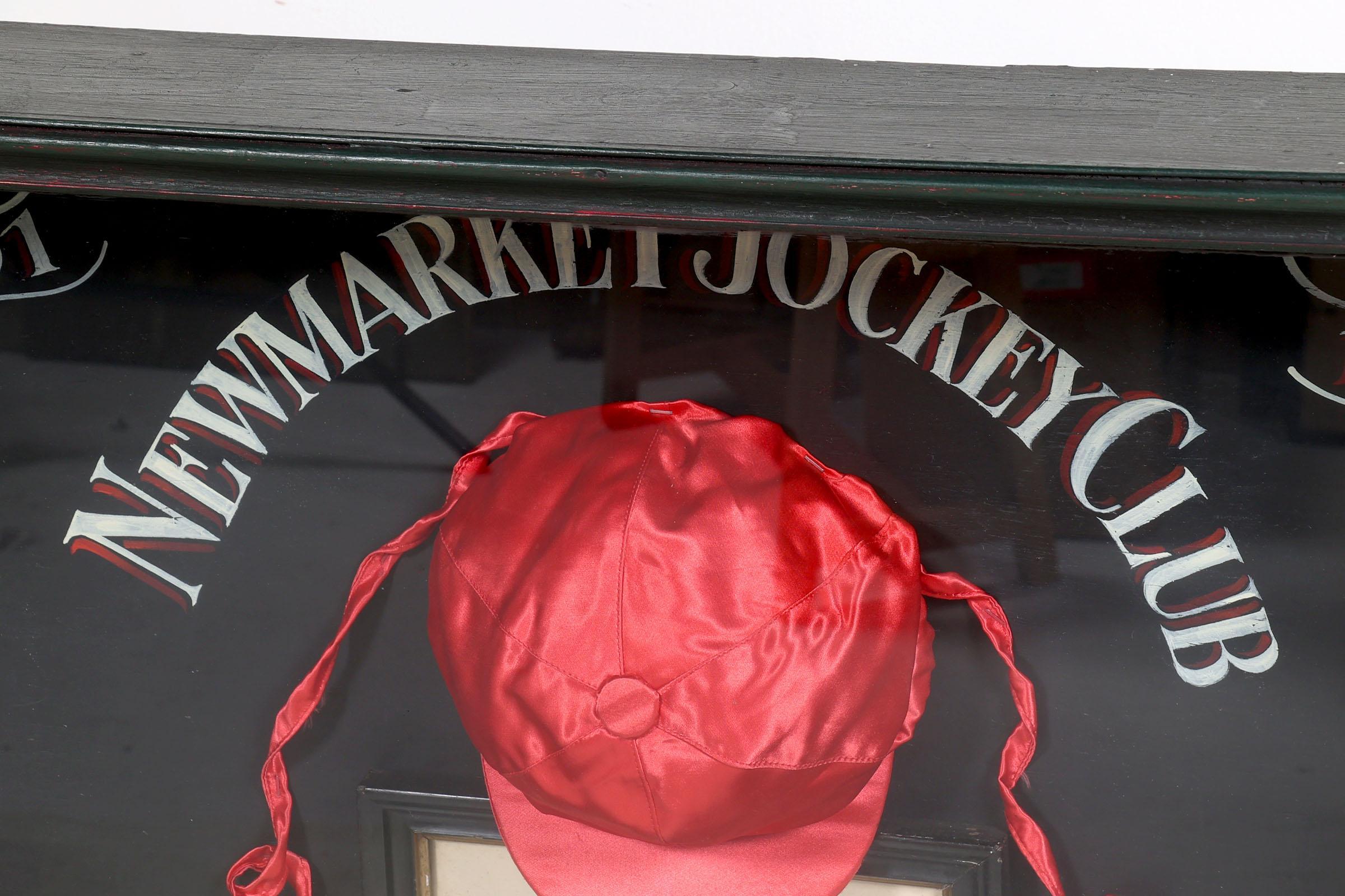 "Newmarket Jockey Club 1891" Engelse wandvitrine/herinneringsbord met daarin een foto van Jockey van het jaar 1891, Walter Bradford, rijlaarzen, zadel, stijgbeugels en cap, 90 x 120 cm.