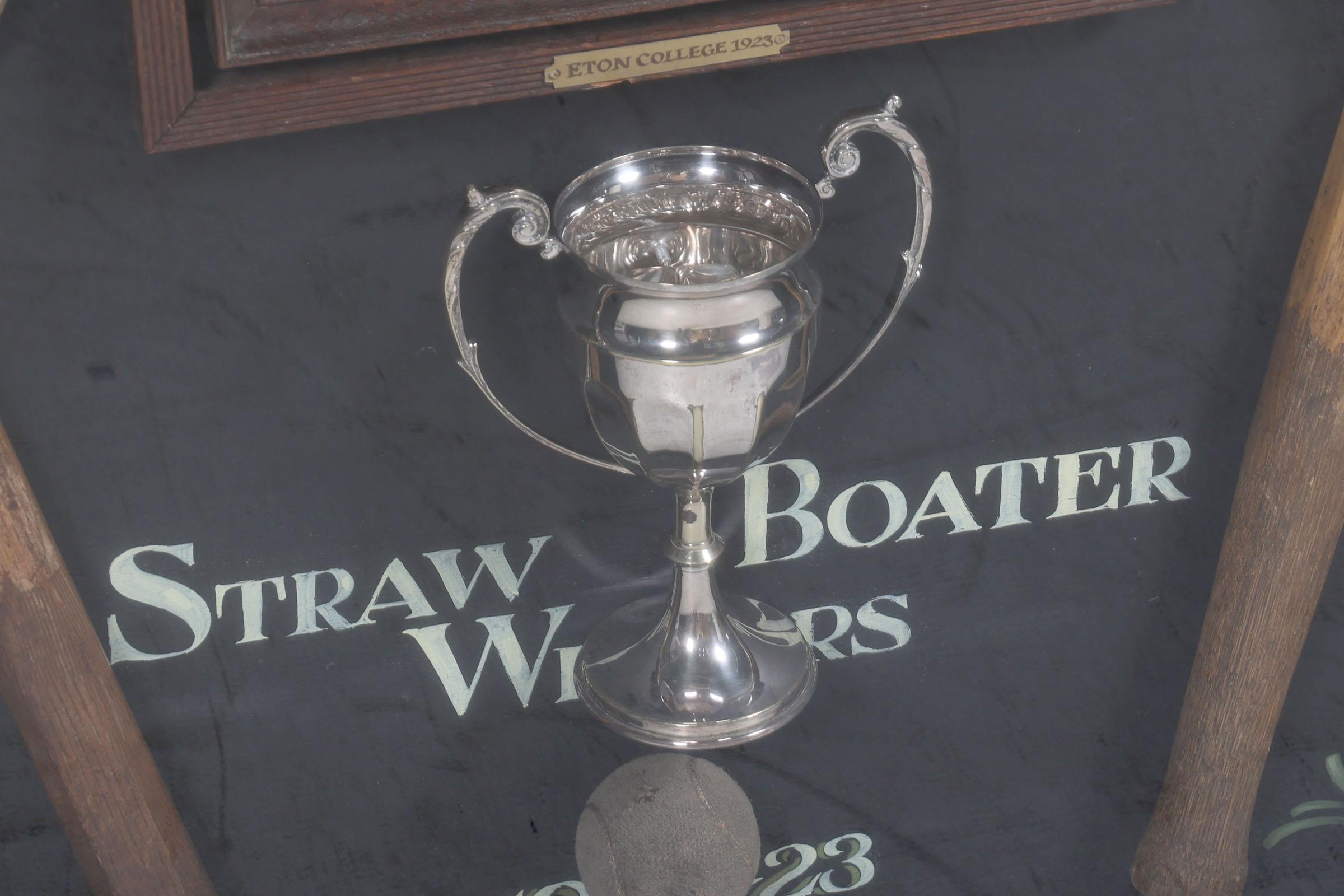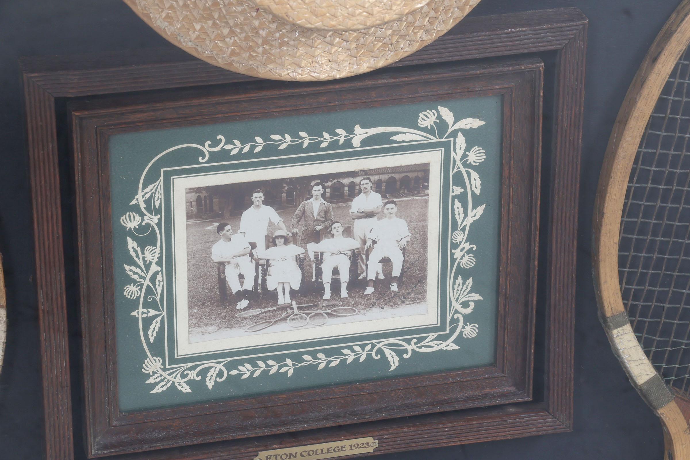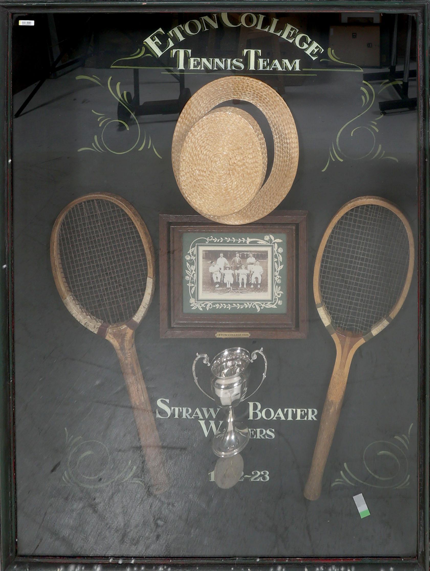 "Eaton College Tennis 1922-1923" Engelse wandvitrine/herinneringsbord met daarin een foto, 2 rackets, ballen en beker, 90 x 120 cm.