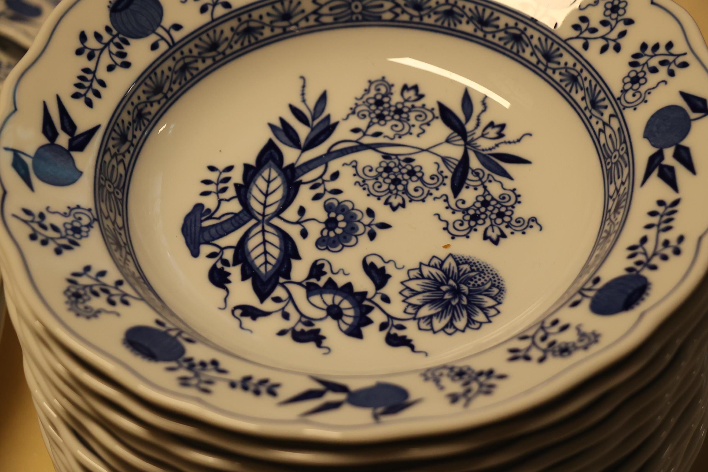 Hutschenreuther porseleinen serviesdeel met Zwiebelmuster decor, servies bestaat uit voornamelijk recente stukken en enkele oudere stukken, met 2 niet bijpassende kopjes, ca. 85 delig